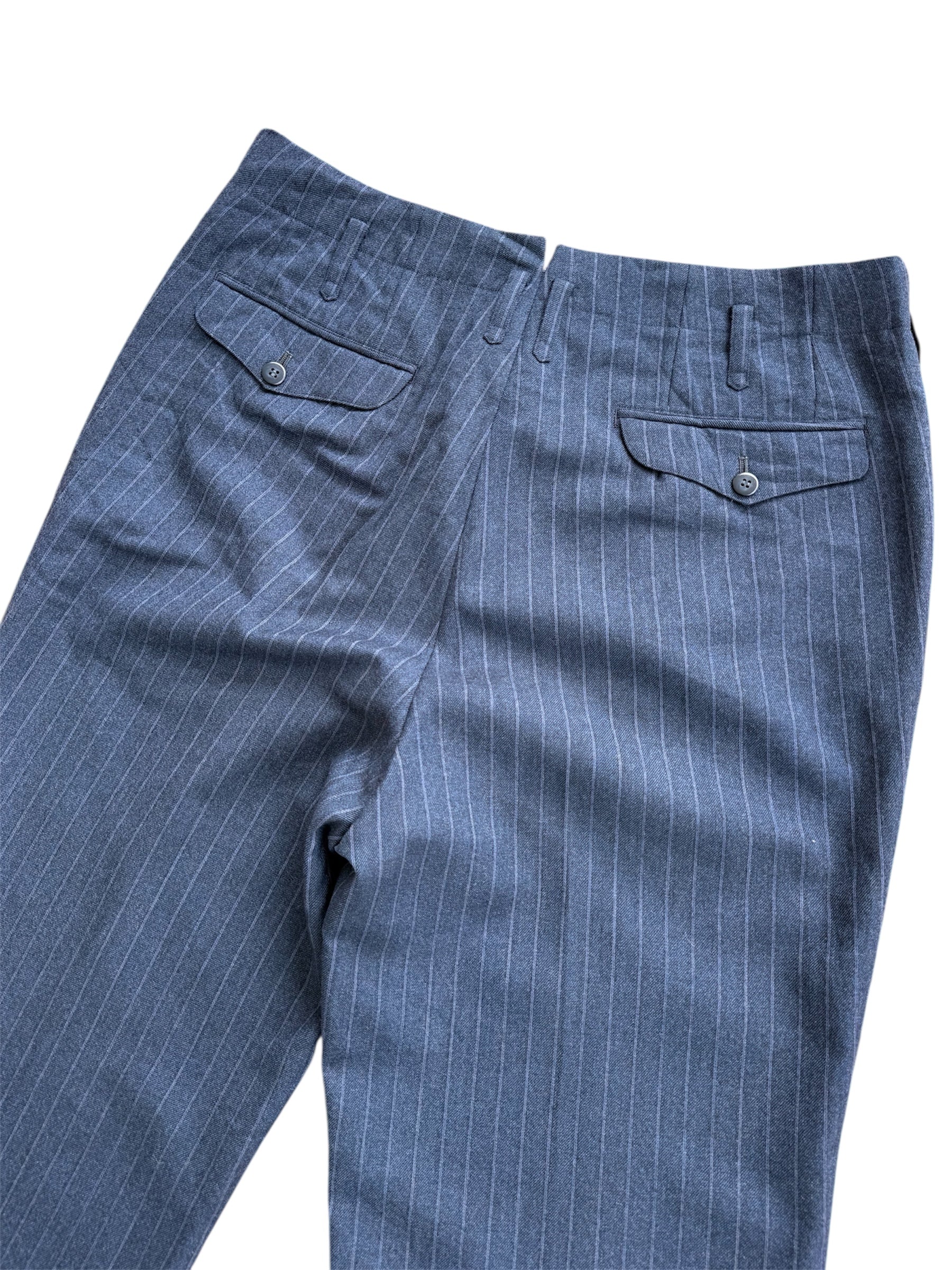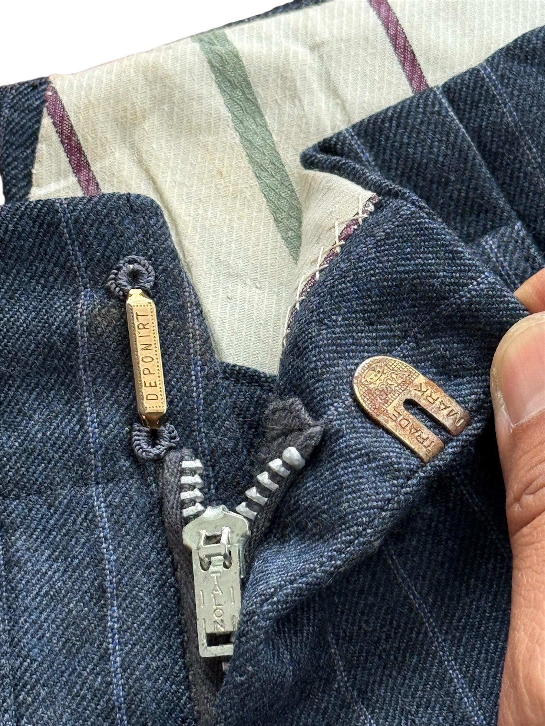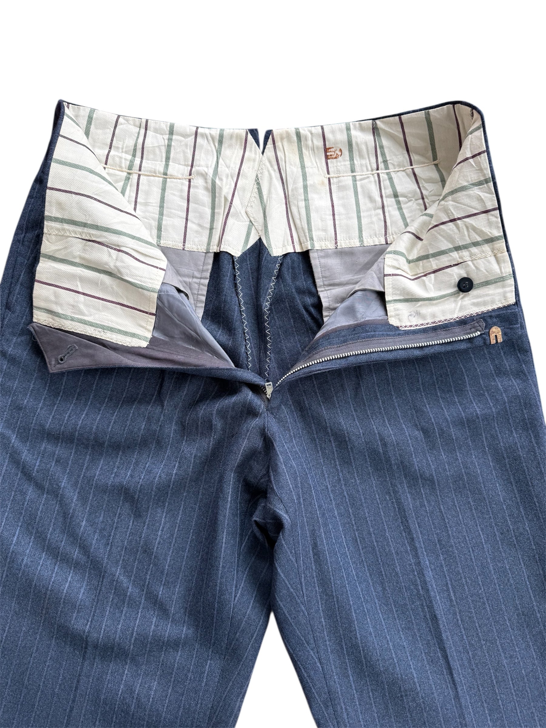 Vintage European tailored trousers from the 1950s, featuring a blue pinstripe wool fabric with cuffed hems and pleated front. Equipped with a Talon metal zipper and Deponirt hook closure, with striped cotton waistband lining. Classic high-rise tailored cut with flap-back pockets, refined mid-century menswear construction.