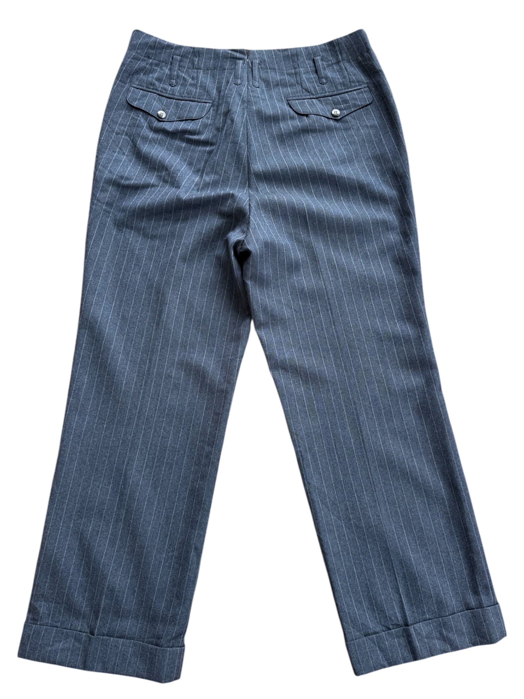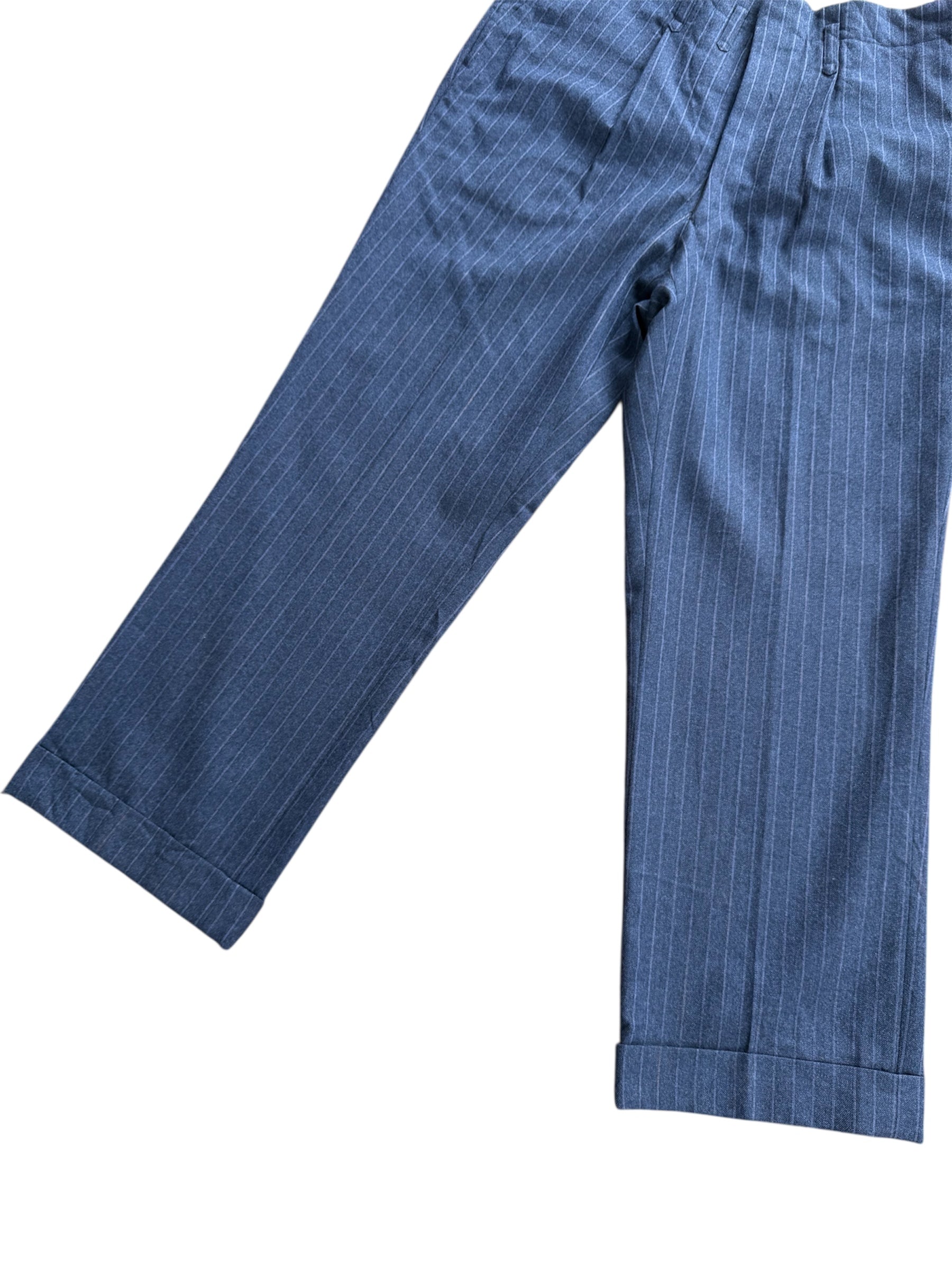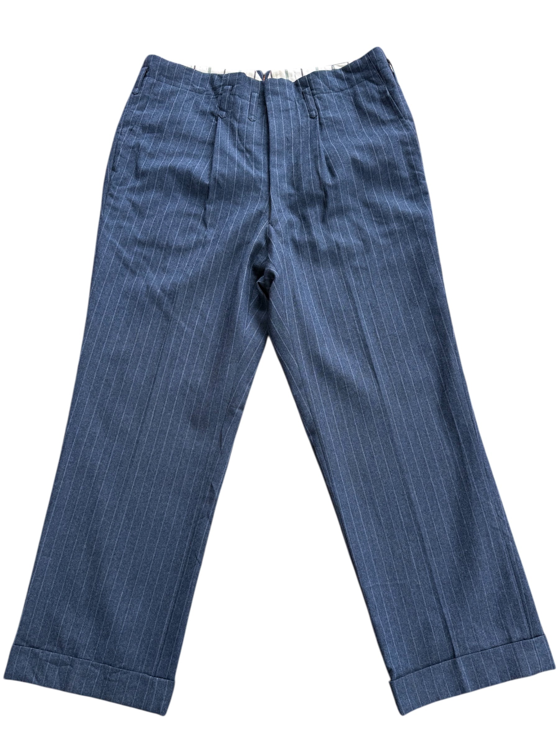 Vintage European tailored trousers from the 1950s, featuring a blue pinstripe wool fabric with cuffed hems and pleated front. Equipped with a Talon metal zipper and Deponirt hook closure, with striped cotton waistband lining. Classic high-rise tailored cut with flap-back pockets, refined mid-century menswear construction.