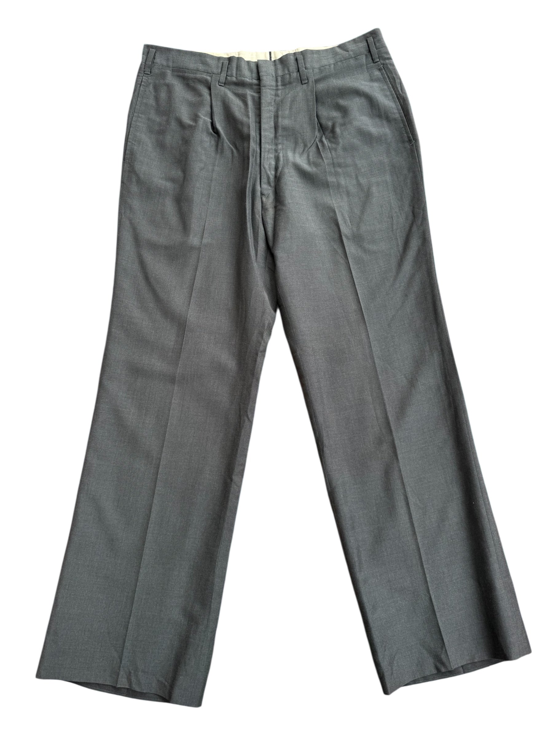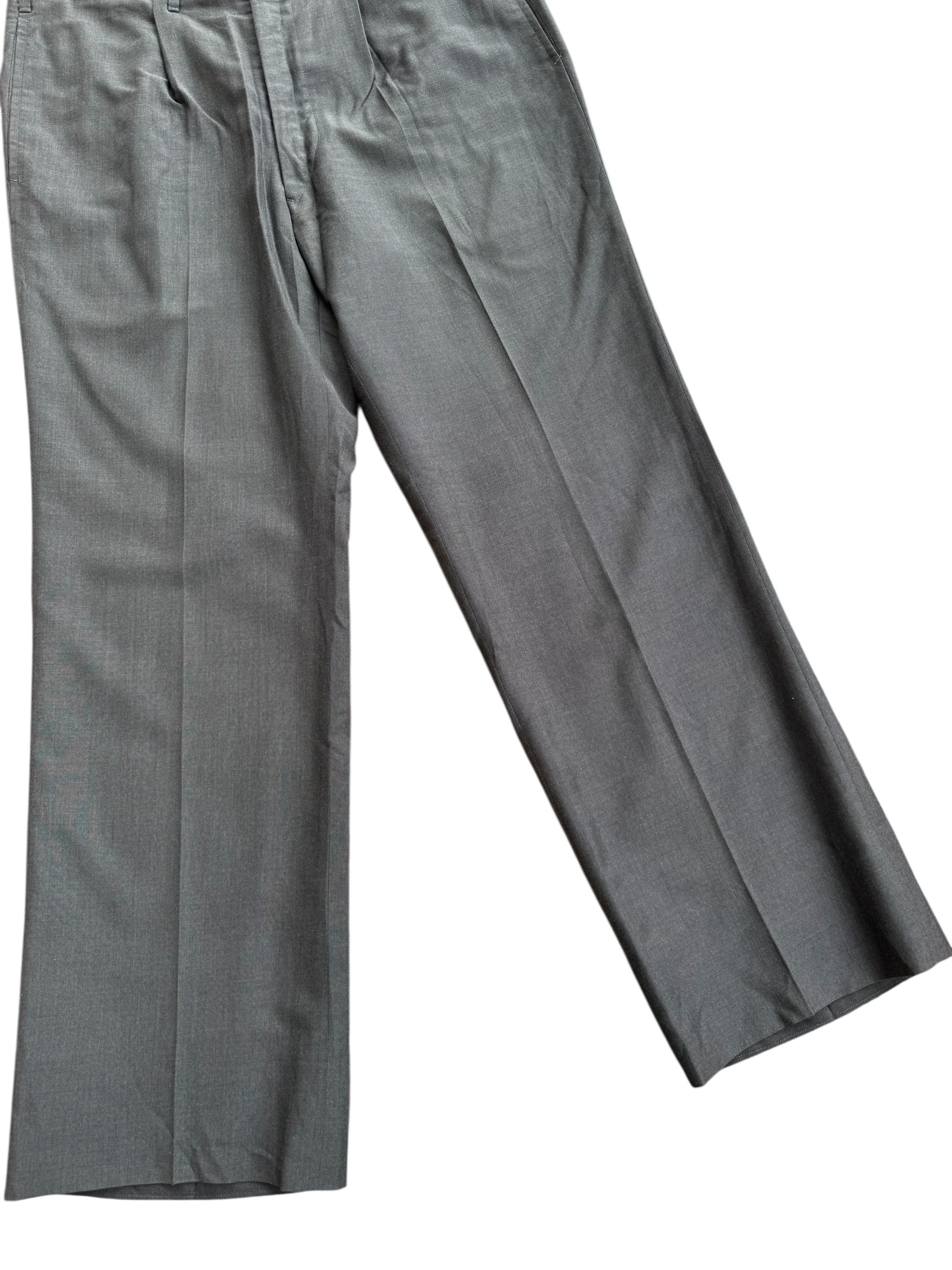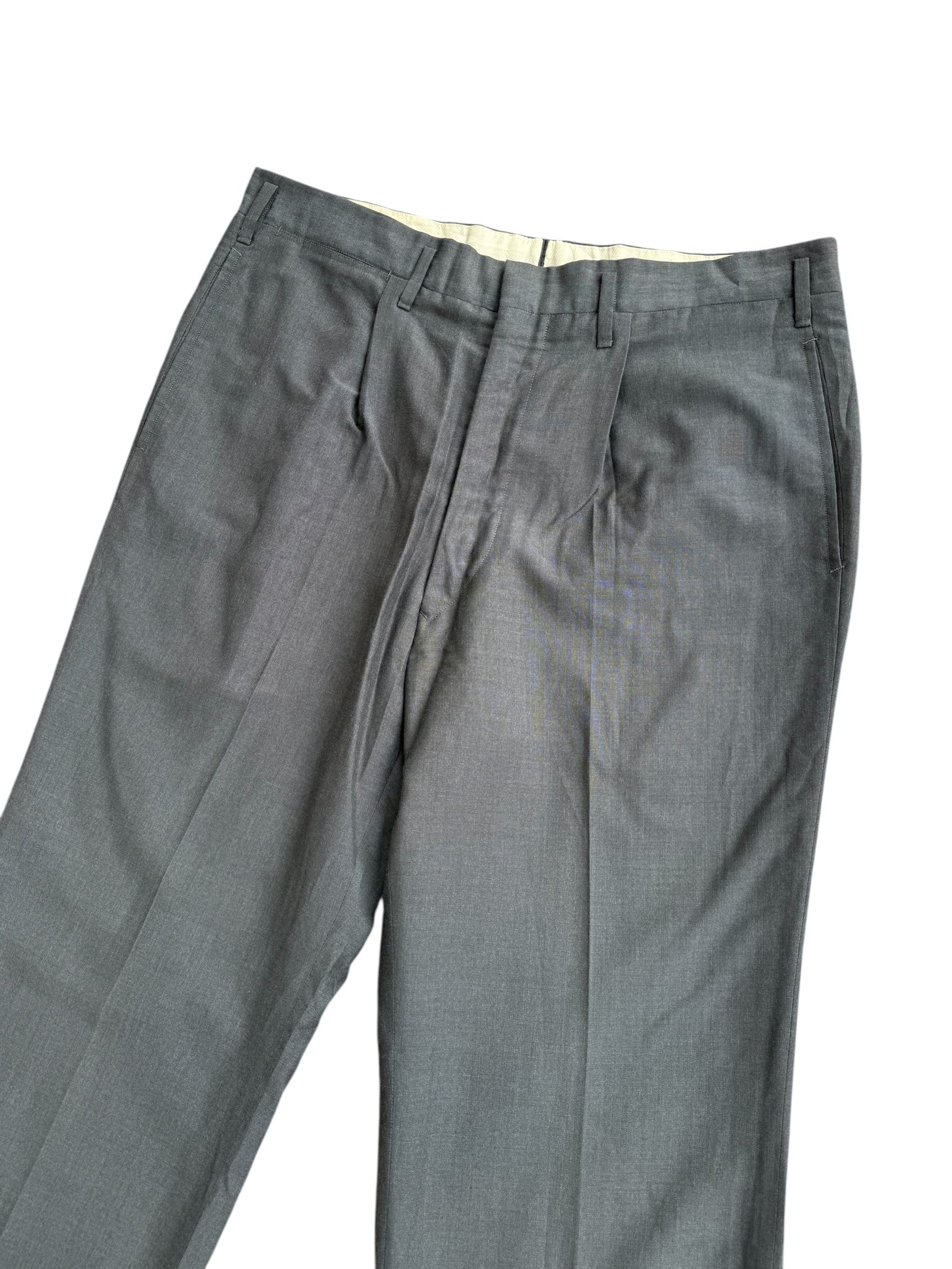 Authentic early-1950s Japanese tailored trousers crafted in post-war era with imported Talon metal zipper and Deponirt hook closure, a rare combination seen only in early Japanese Western-style tailoring. Features classic high-rise pleated front, cuffed hems, and durable wool-blend sharkskin fabric with a soft drape and subtle sheen.