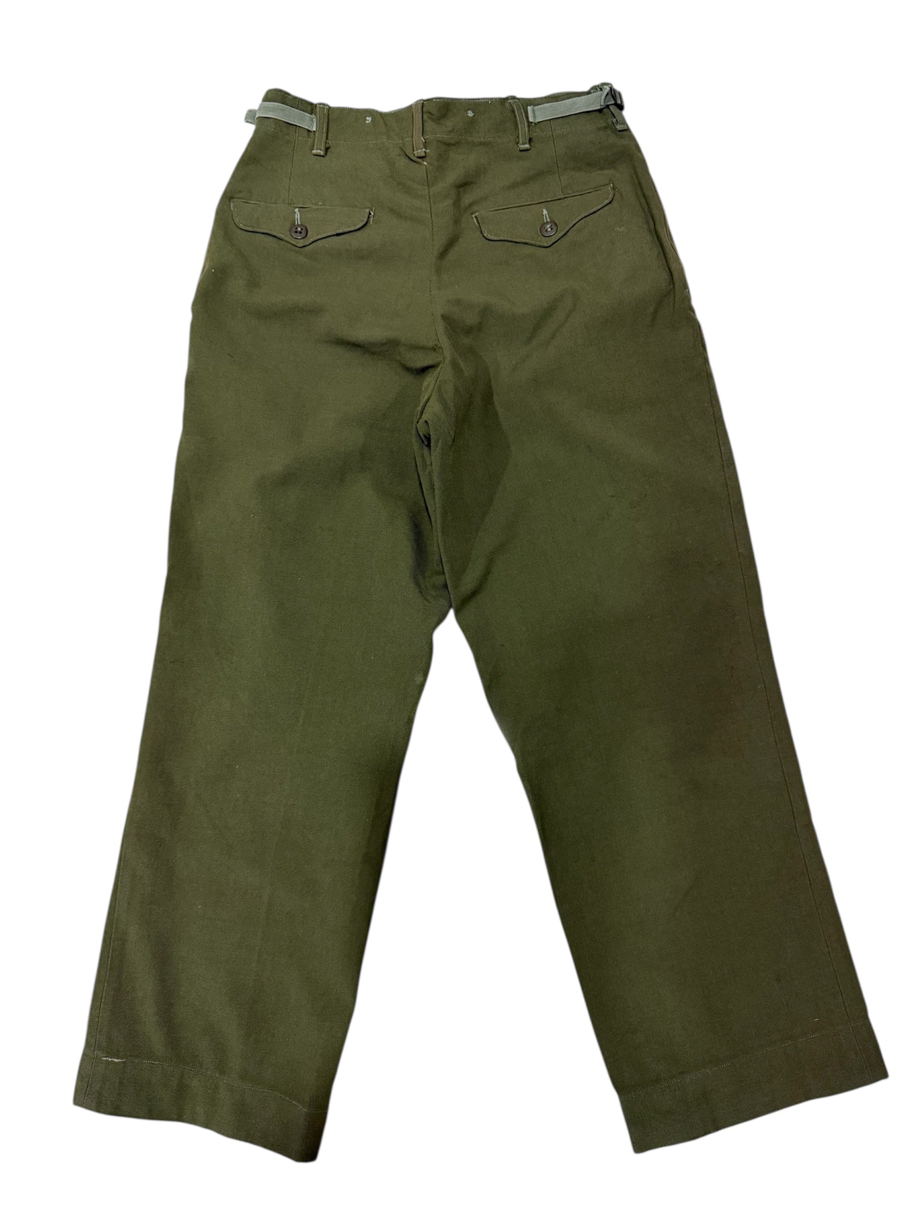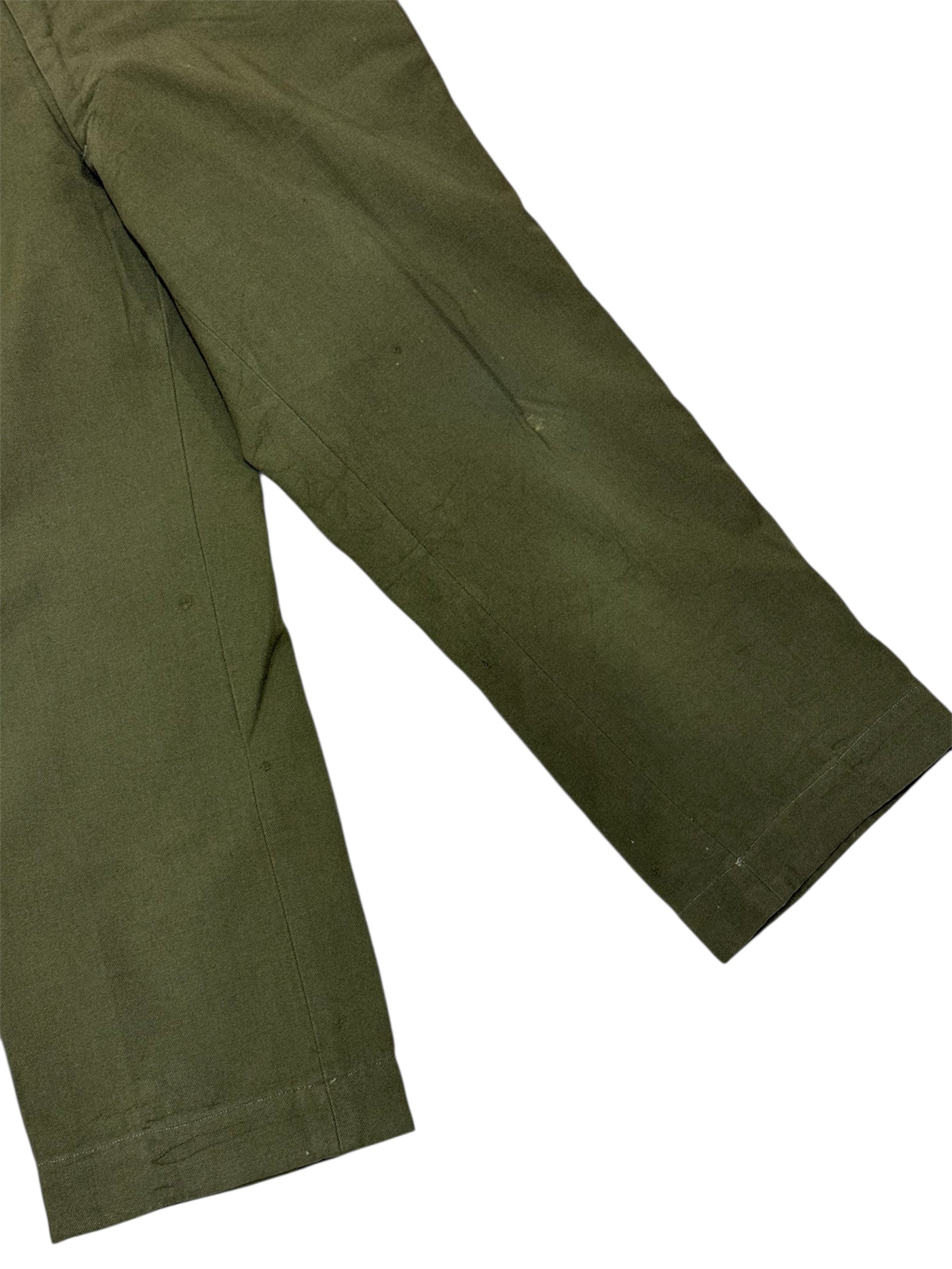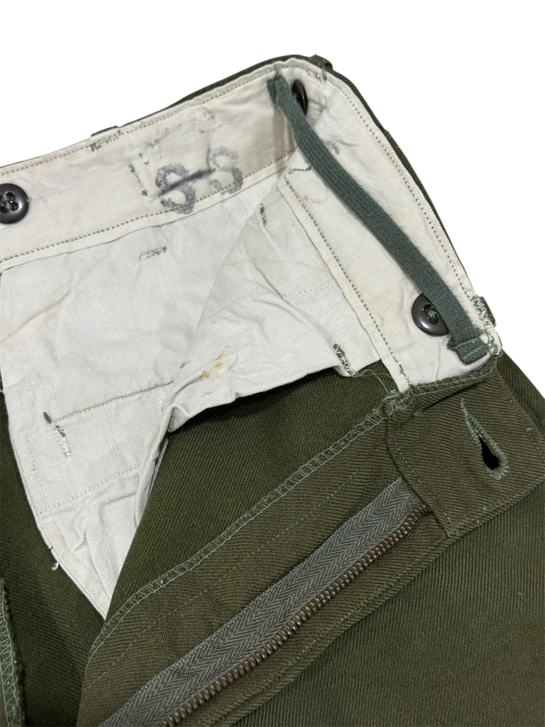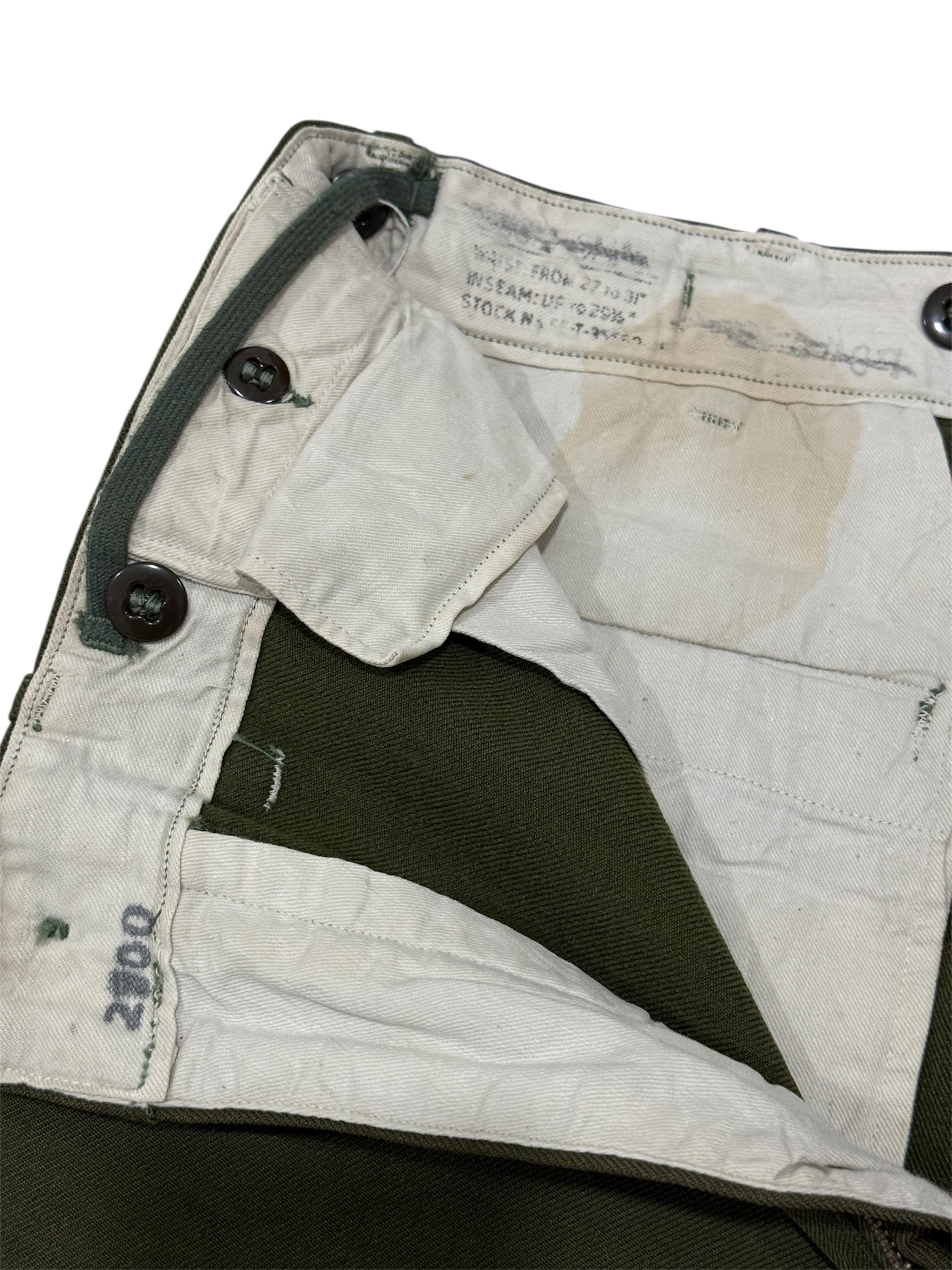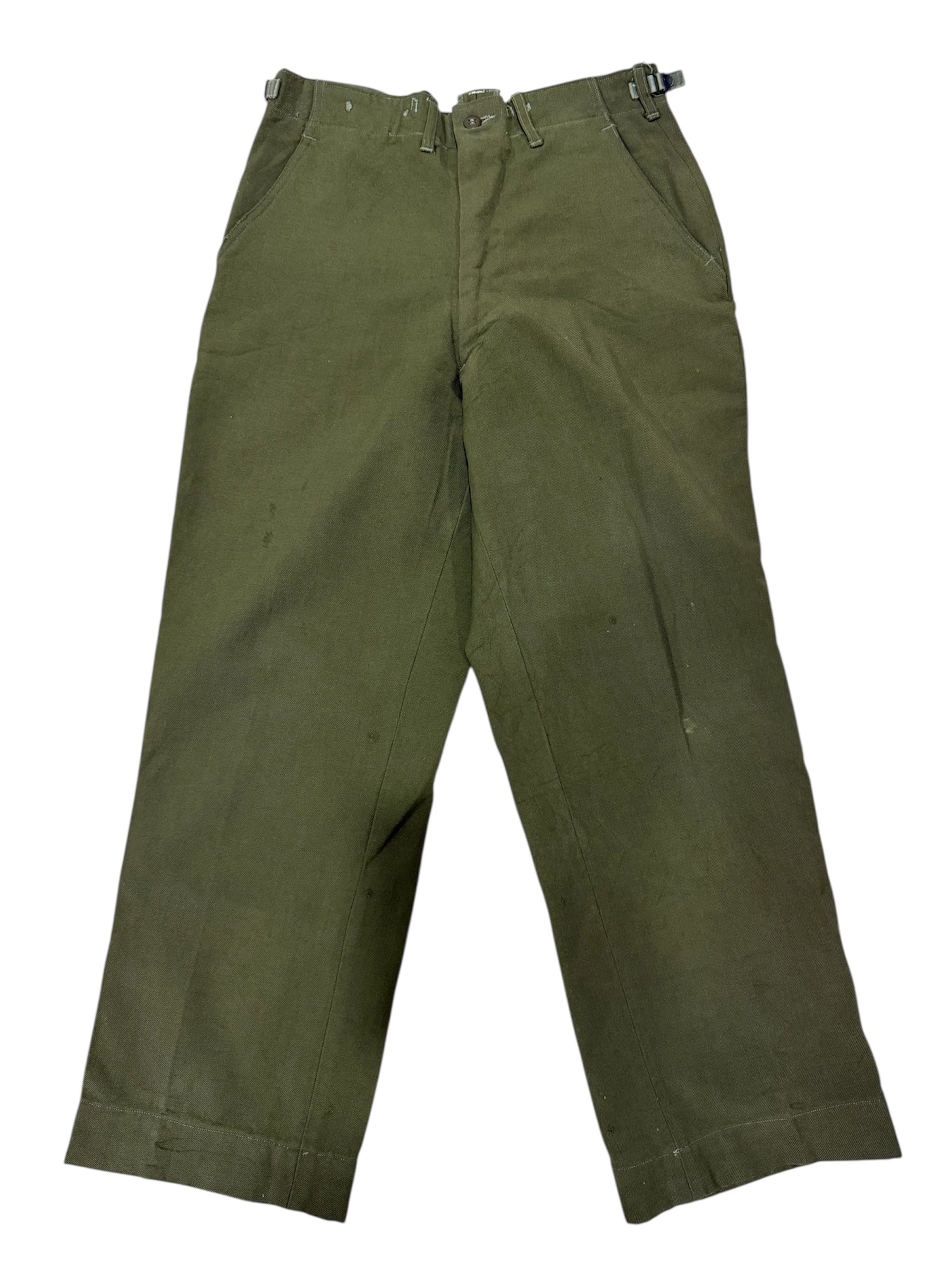 Original U.S. work utility trousers from the early 1950s, likely Korean-War era production. Made from heavy cotton herringbone twill with side adjuster tabs, RAPID brass zipper, and two flap back pockets. Features English military-style stock markings inside waistband.