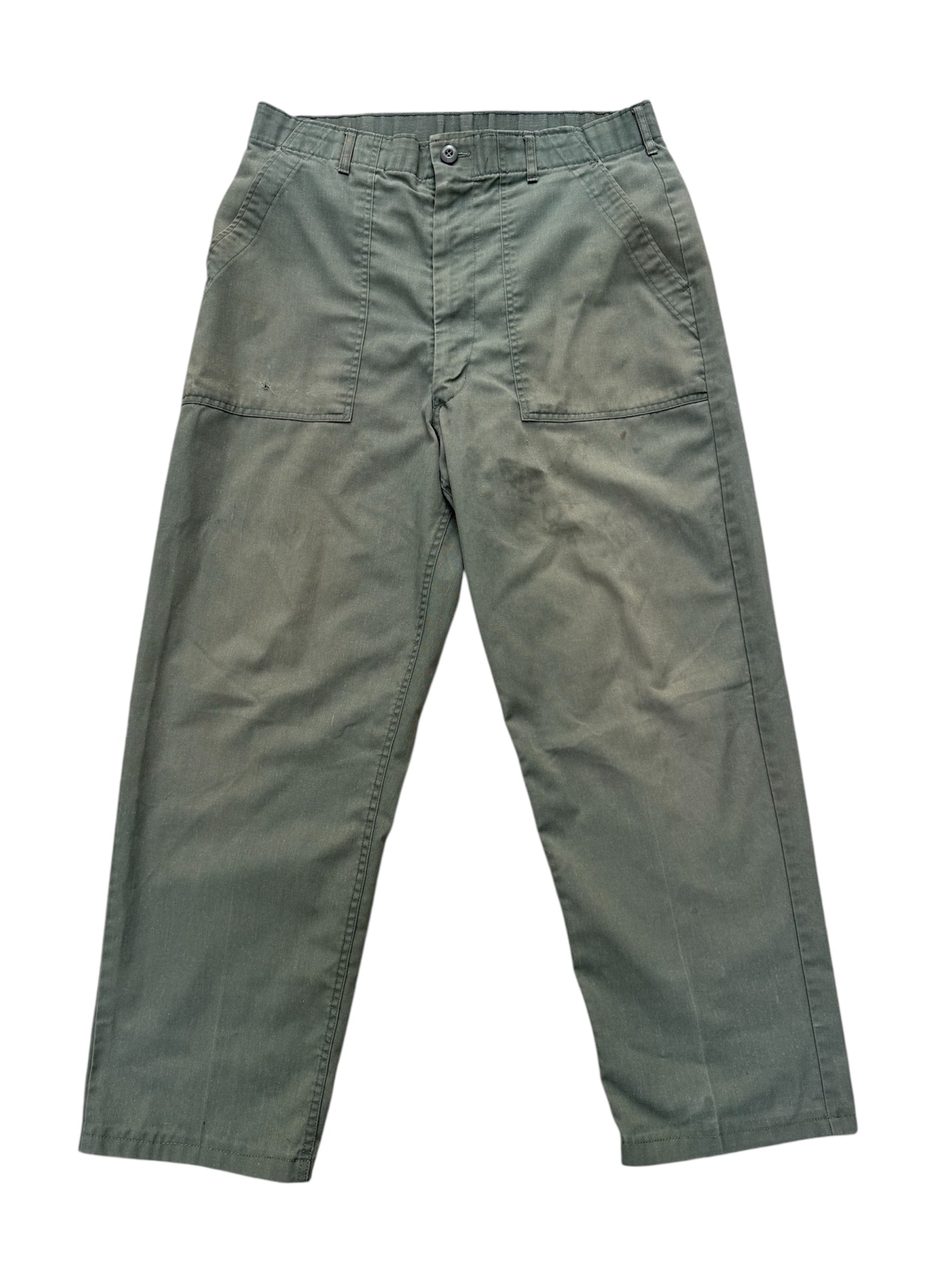 Vintage military-style fatigue pants made from olive green cotton sateen. High-rise straight cut with large front patch pockets and dual back flap pockets. Features original Scovill zipper and button waist closure.