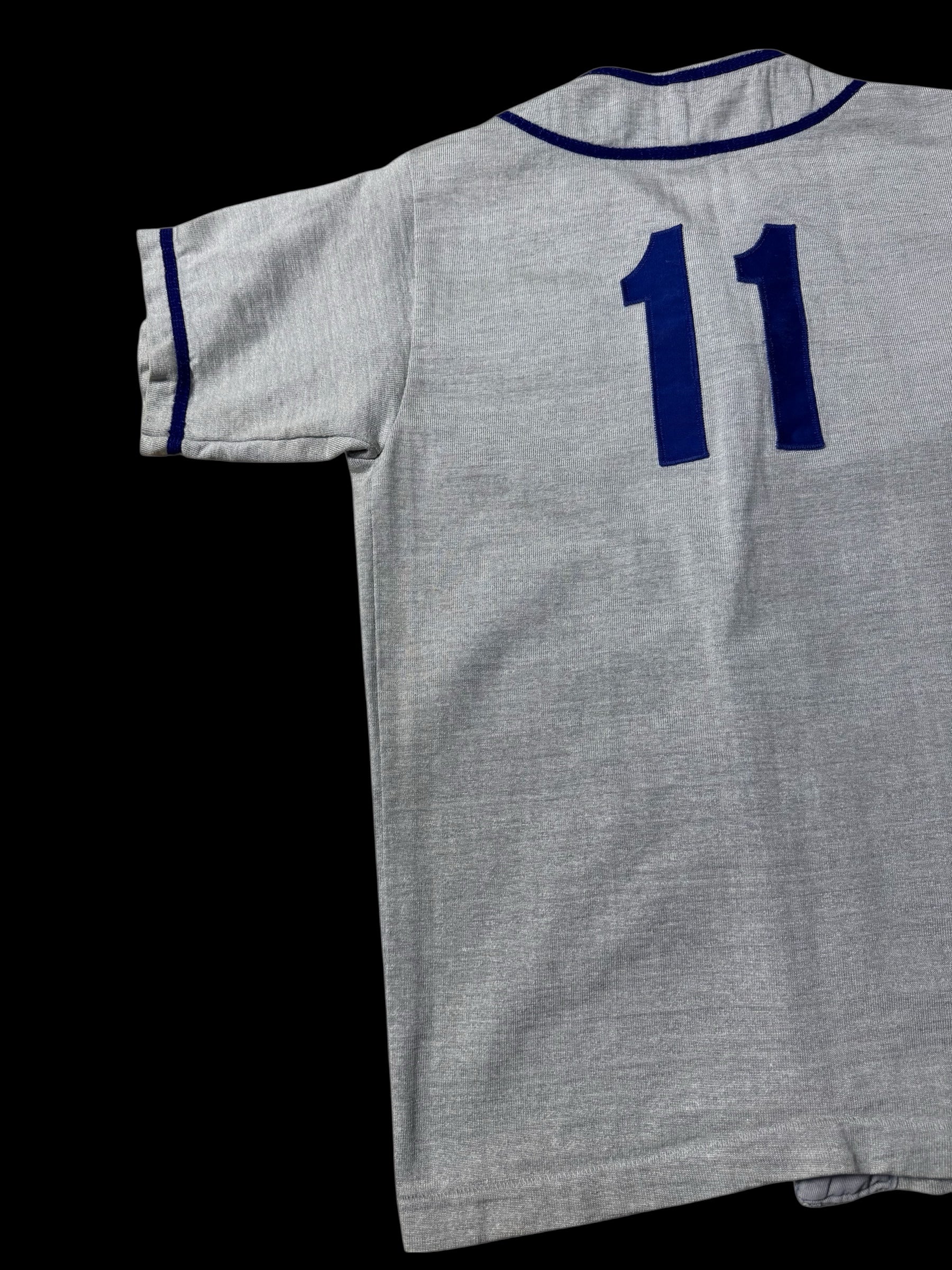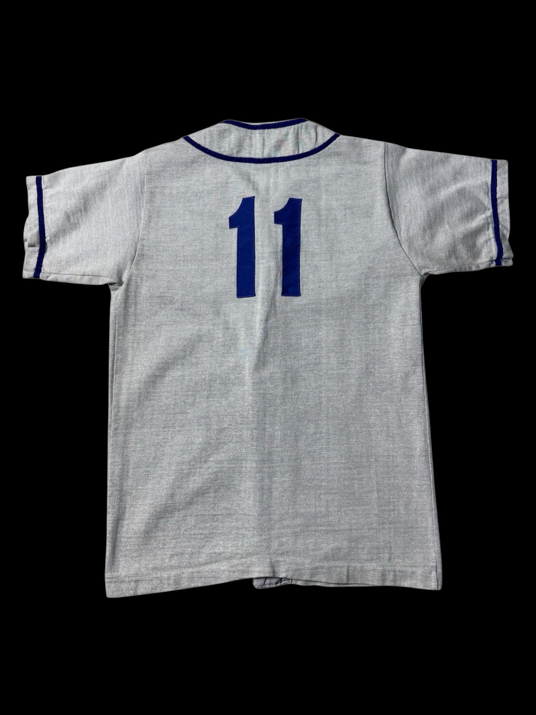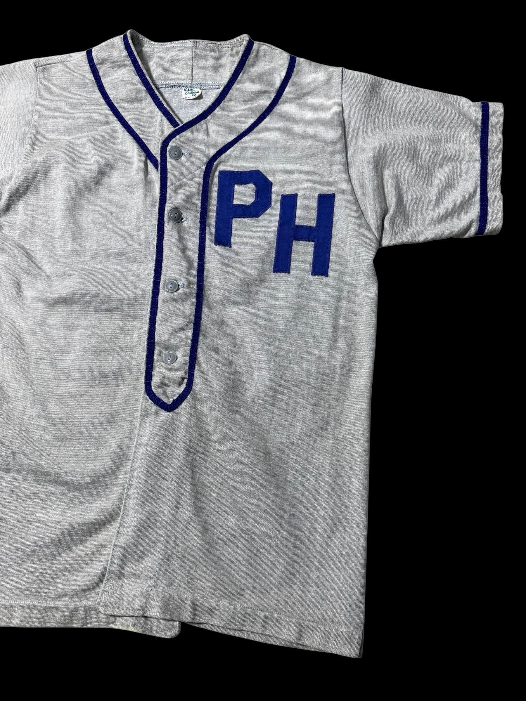 Original vintage baseball jersey by Russell Southern Co from the 1960s to 1970s era. Features classic grey body with royal blue felt “PH” chest lettering, contrast piping along collar and placket, and traditional button front construction. Back printed with number 11 in matching blue tone. Short sleeve athletic silhouette reflects early youth baseball uniform styling from the mid-century American sportswear period.