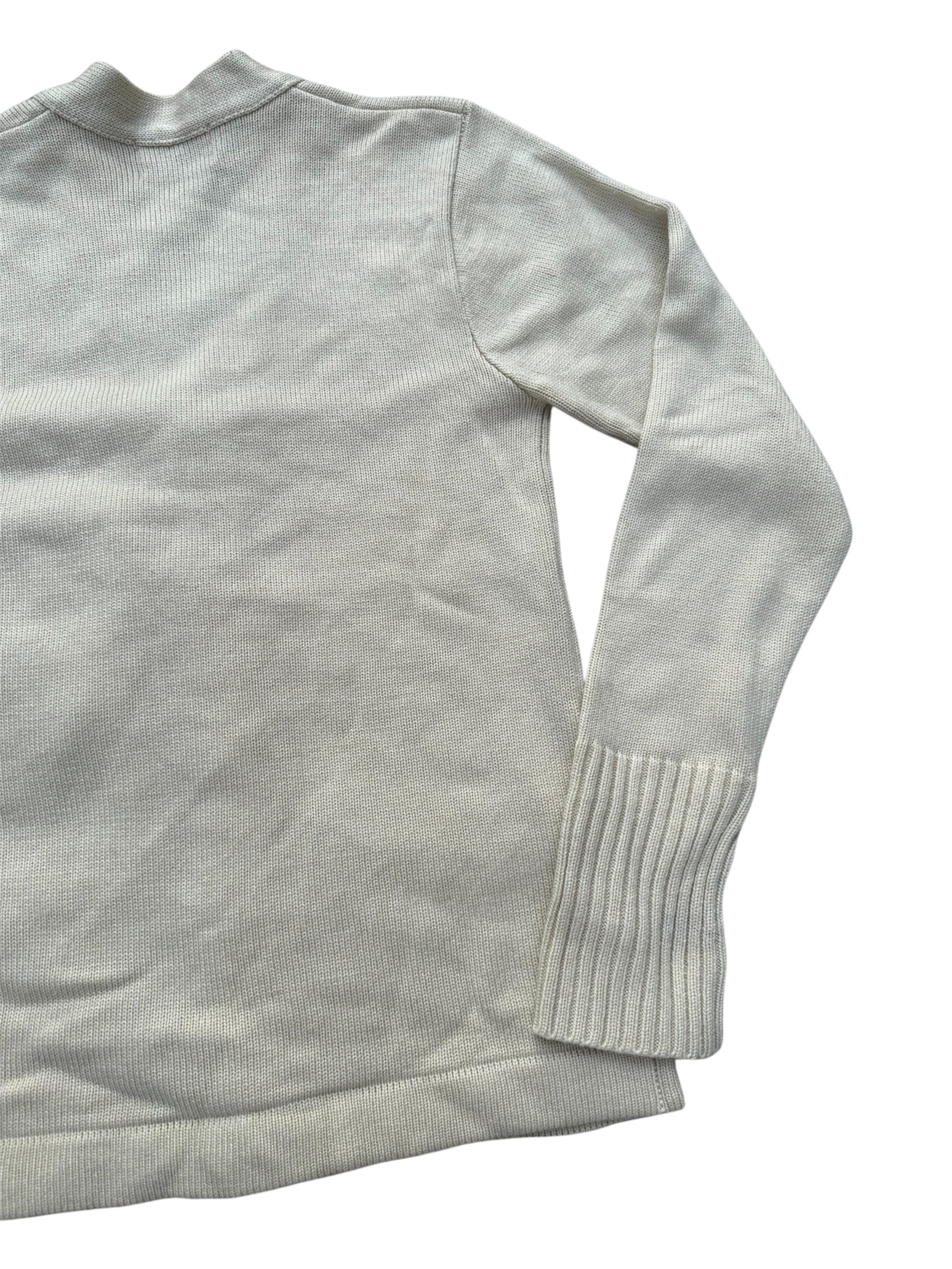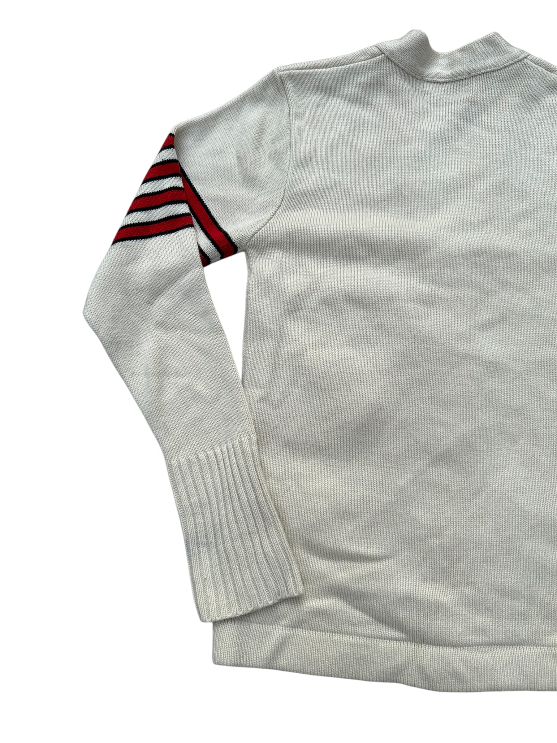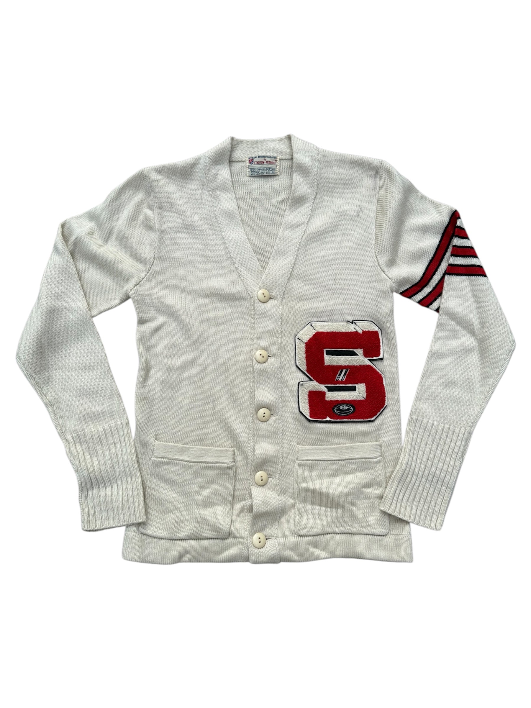 Classic Stadium Product varsity cardigan dating from the late 1960s to early 1970s. Ivory/off-white knit body with chenille “S” varsity letter patch and triple red athletic award stripes at the sleeve, capturing true collegiate heritage style. Constructed from 100% Orlon acrylic, a mid-century synthetic knit known for durability and structure with rib-knit cuffs, two front patch pockets, and full button-front closure. Slim vintage fit typical of period award sweaters.
