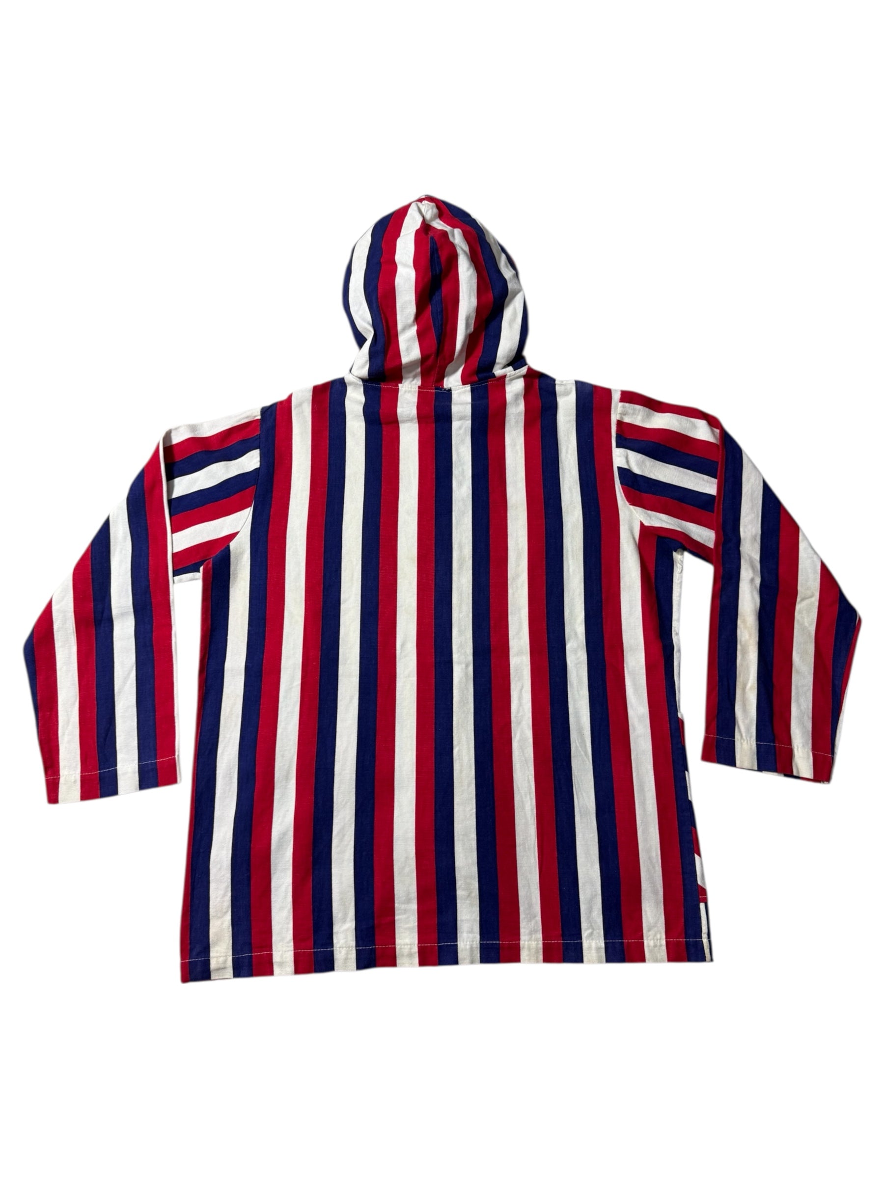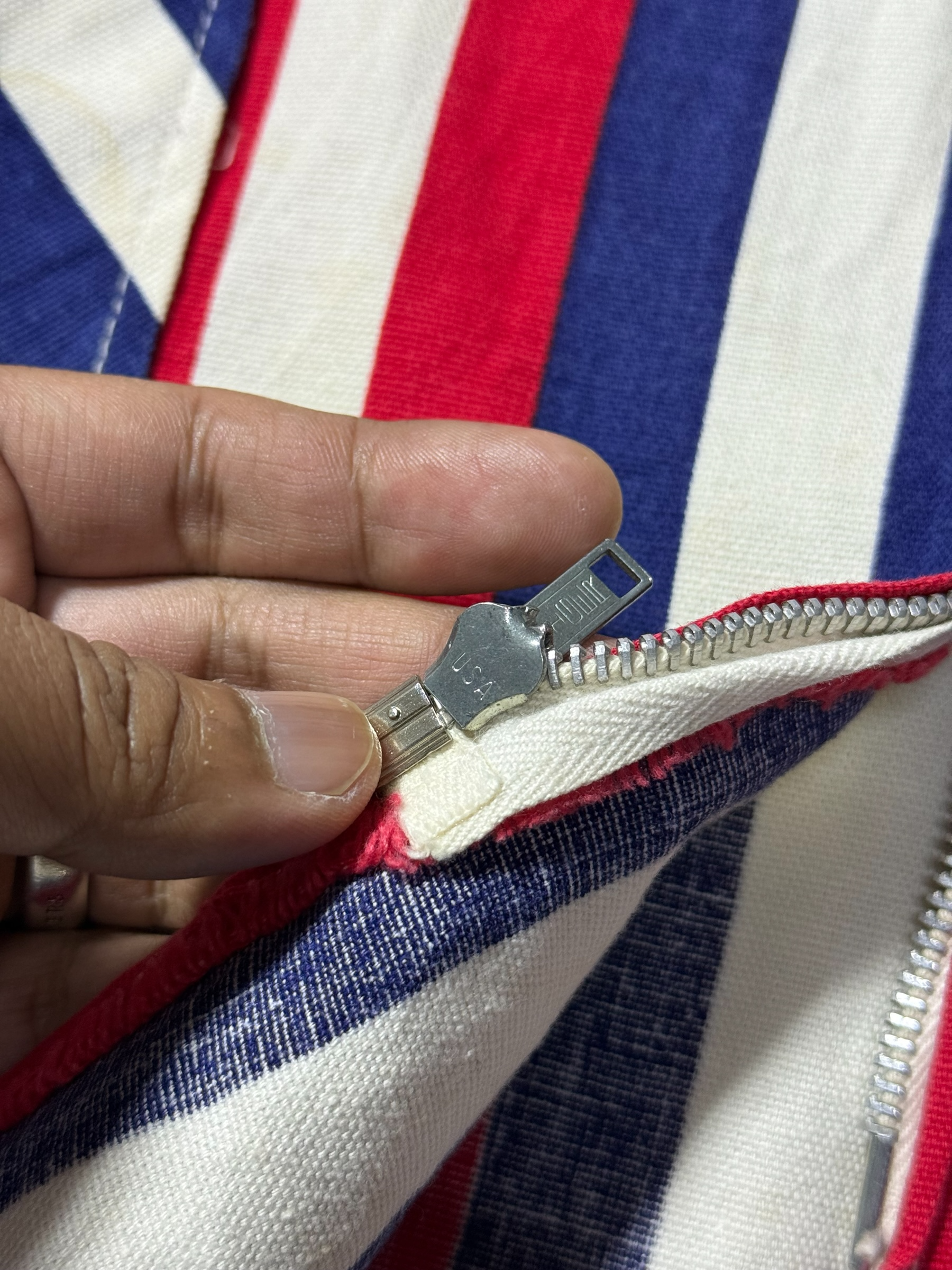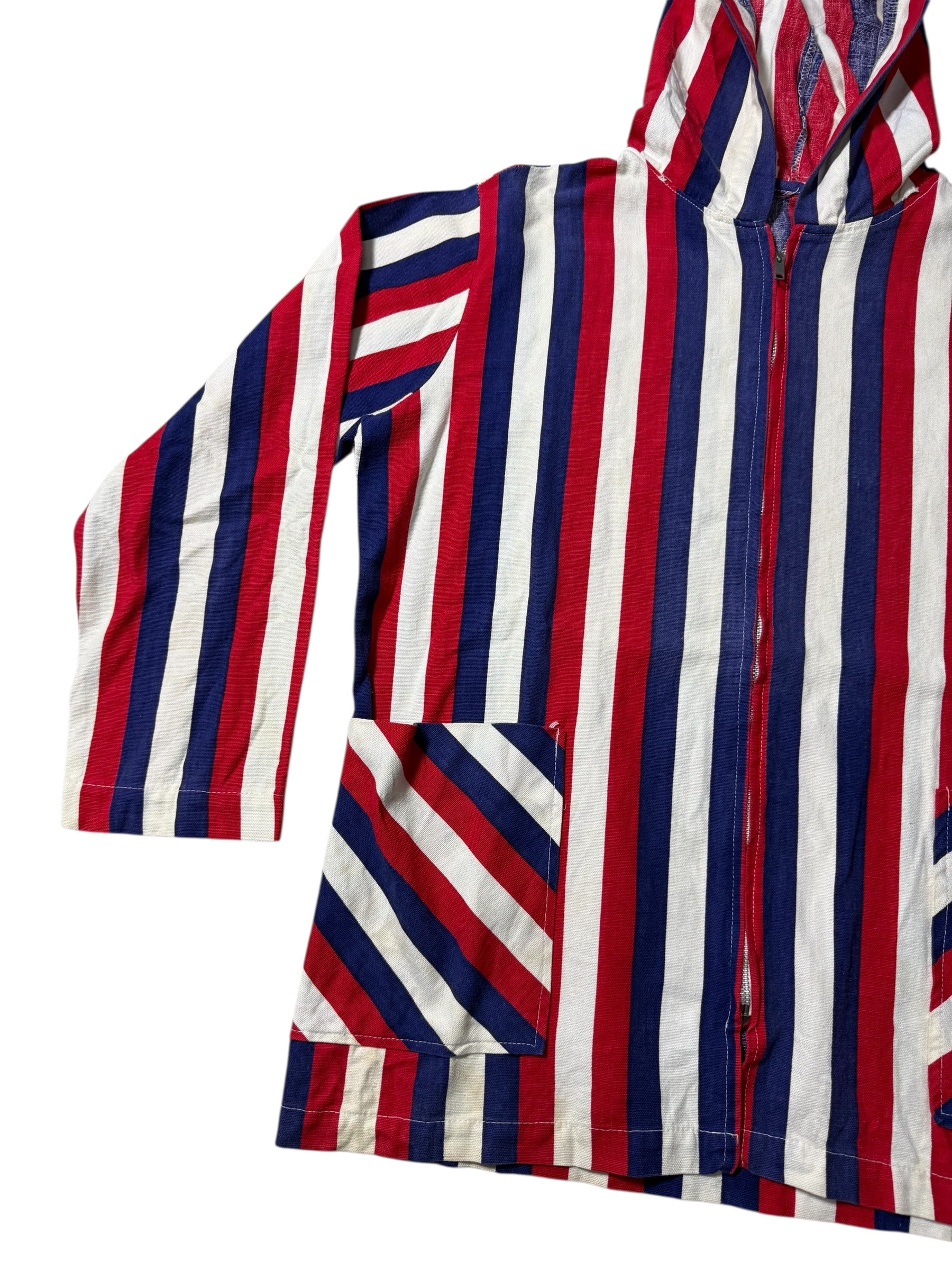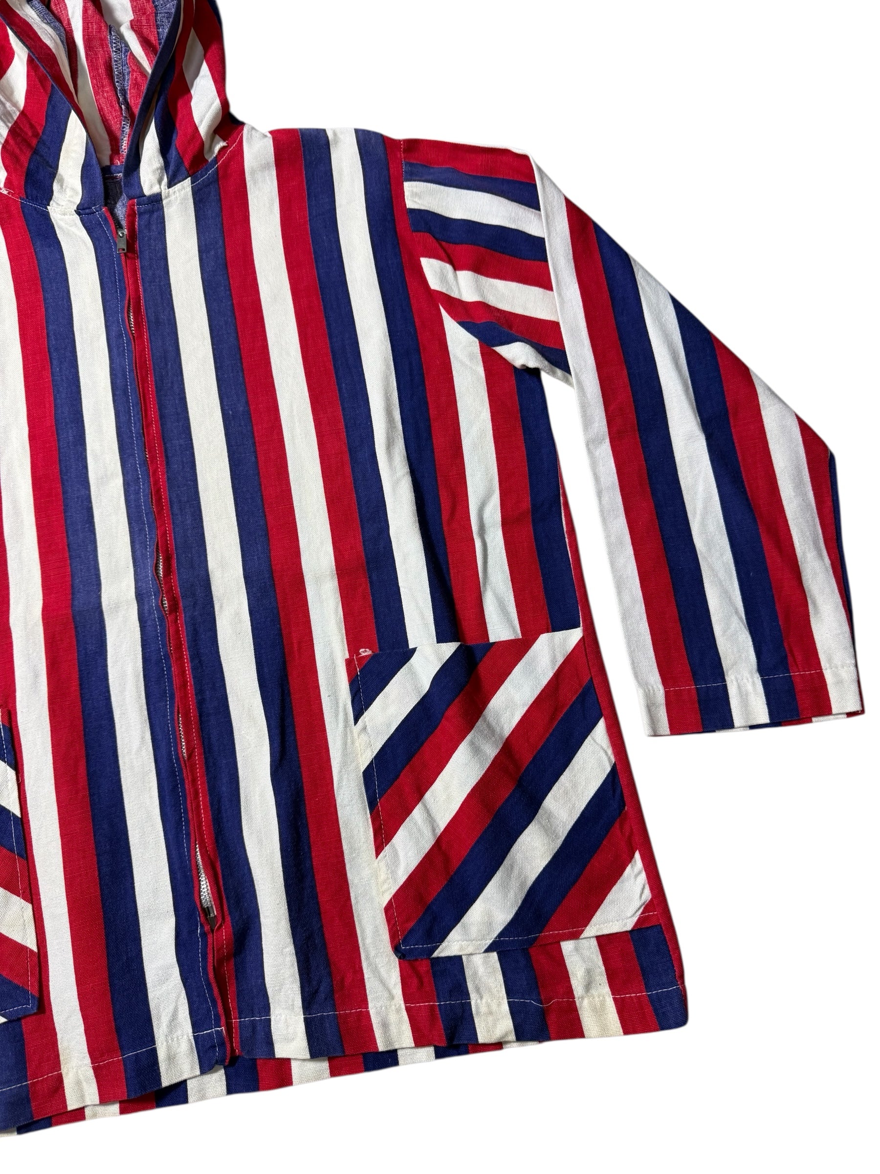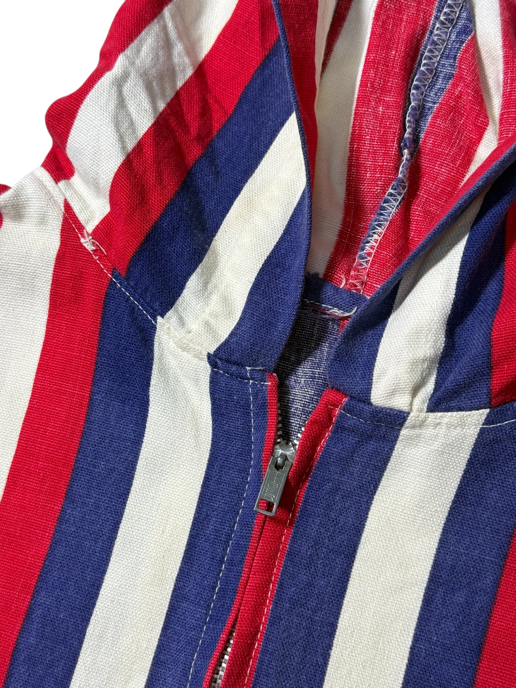 Original late-1960s to early-1970s striped hooded zip jacket featuring a bold red, white & navy vertical stripe pattern. Made from thick woven cotton canvas with a strong vintage Americana feel.