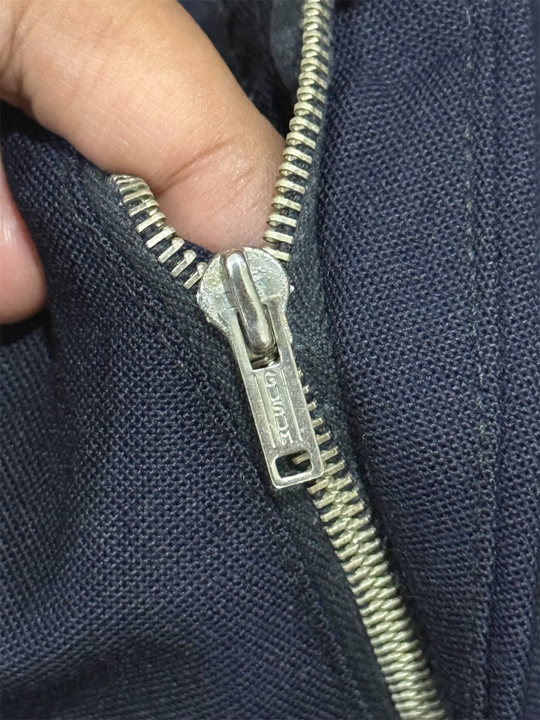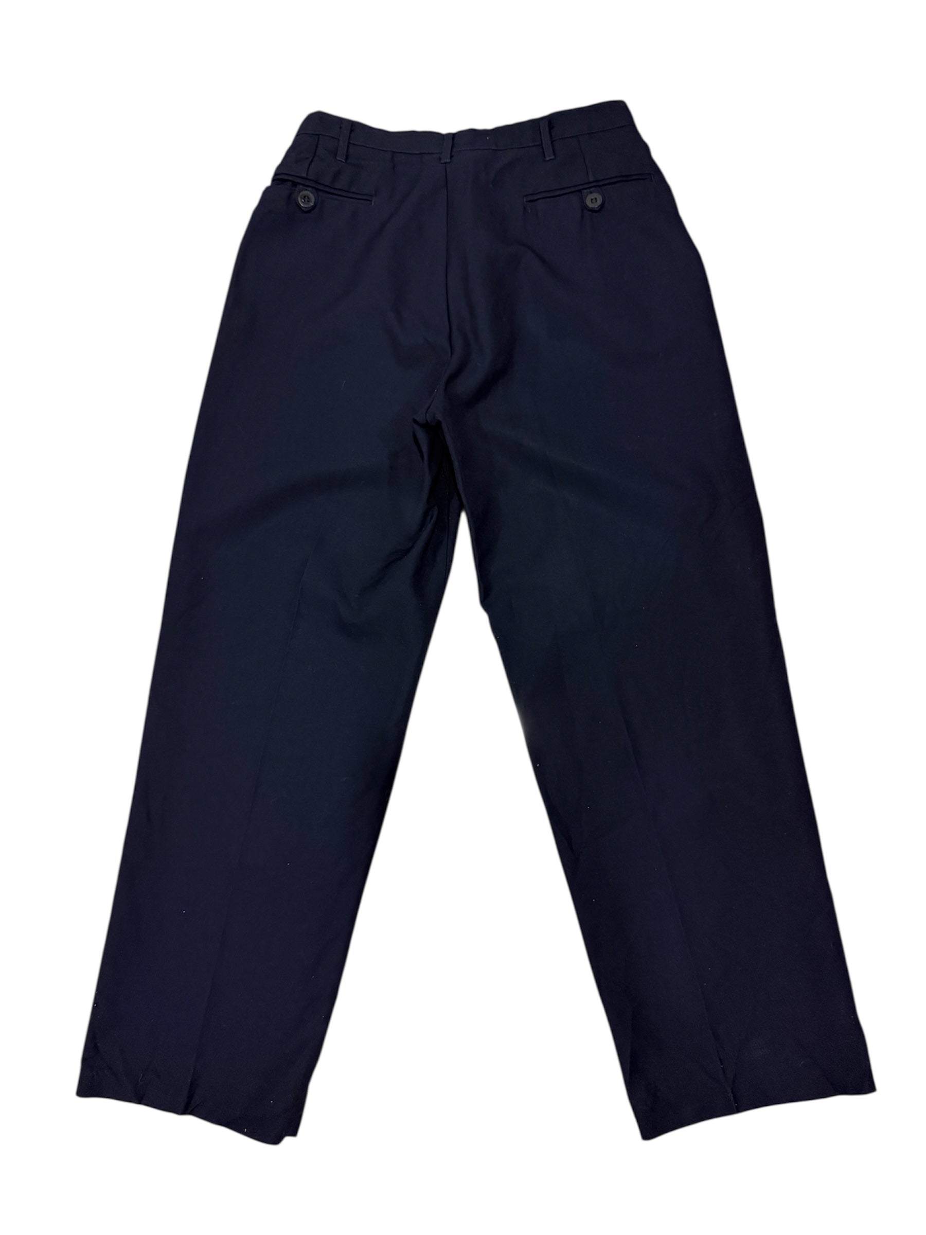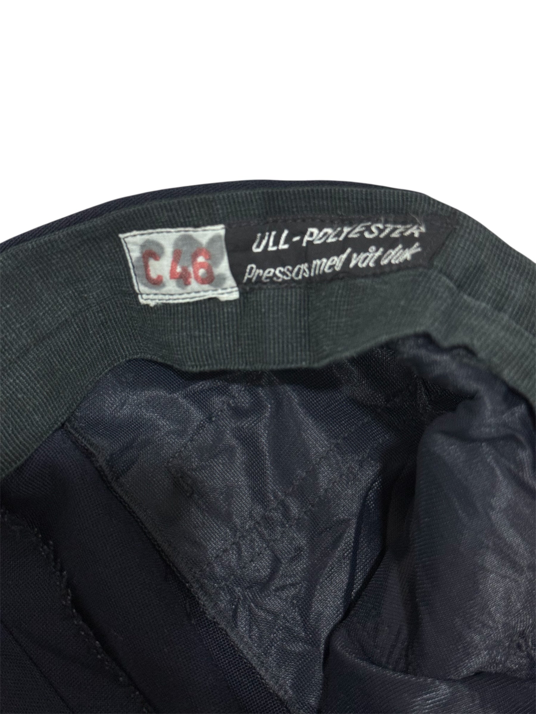 Vintage Swedish uniform trousers from the 1960s–1970s, made in Sweden. Crafted from a durable wool–polyester blend fabric in dark navy, featuring GUSUM metal zipper, double front pleats, and full inner lining for comfort.