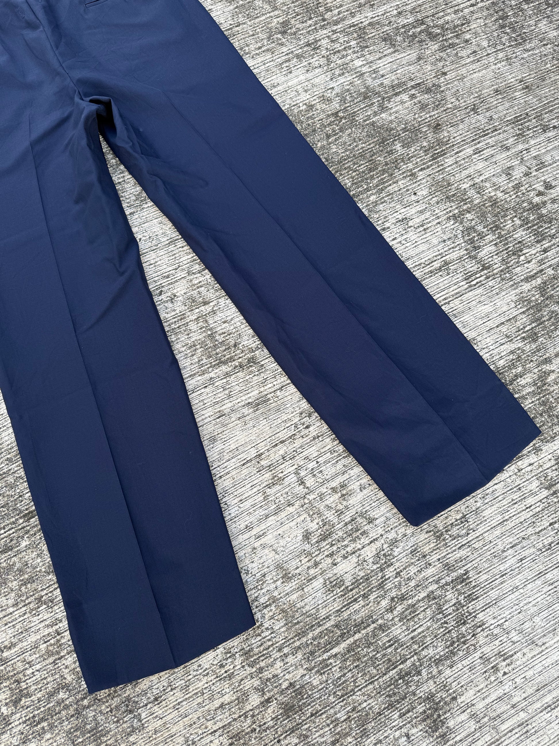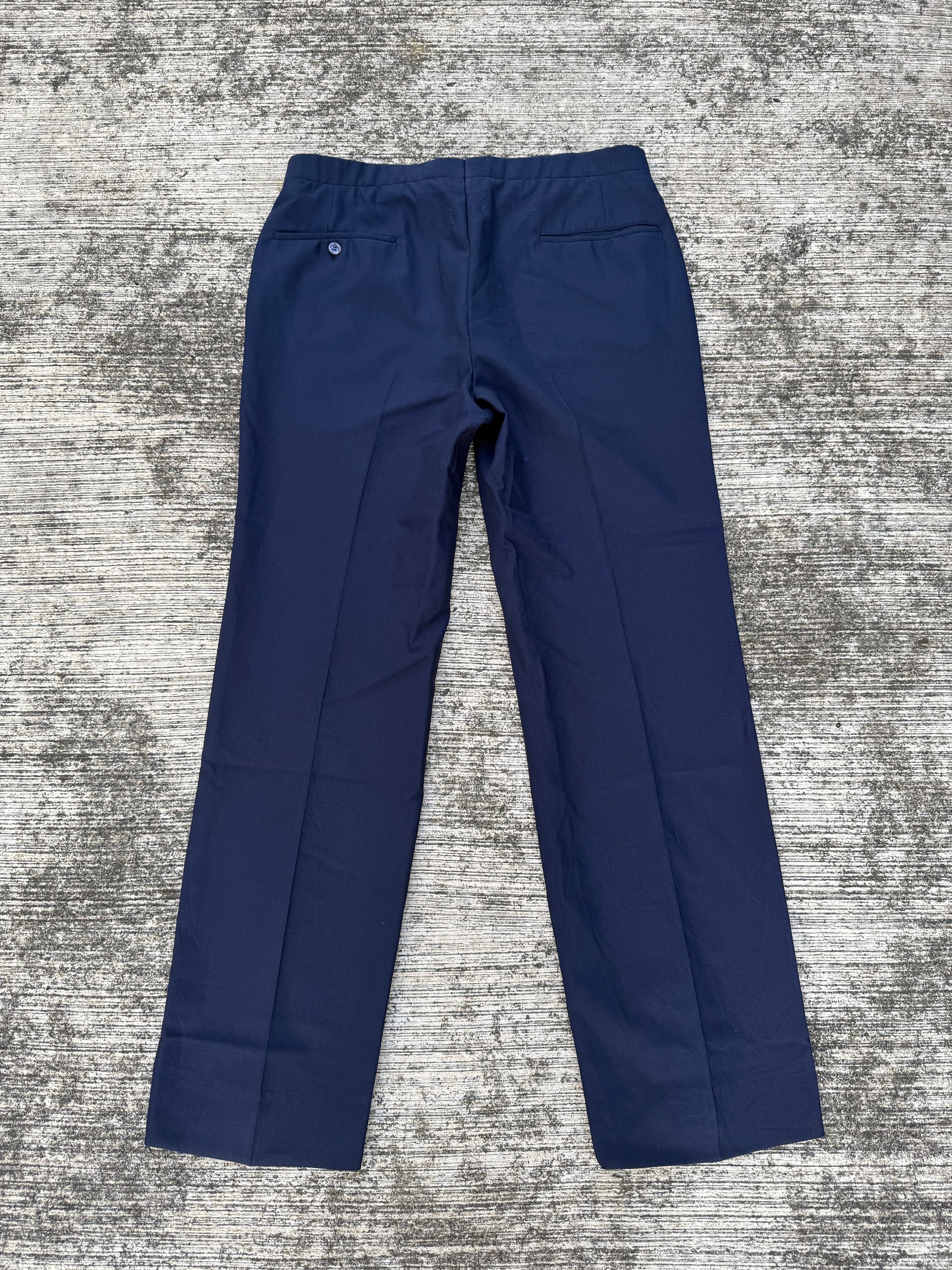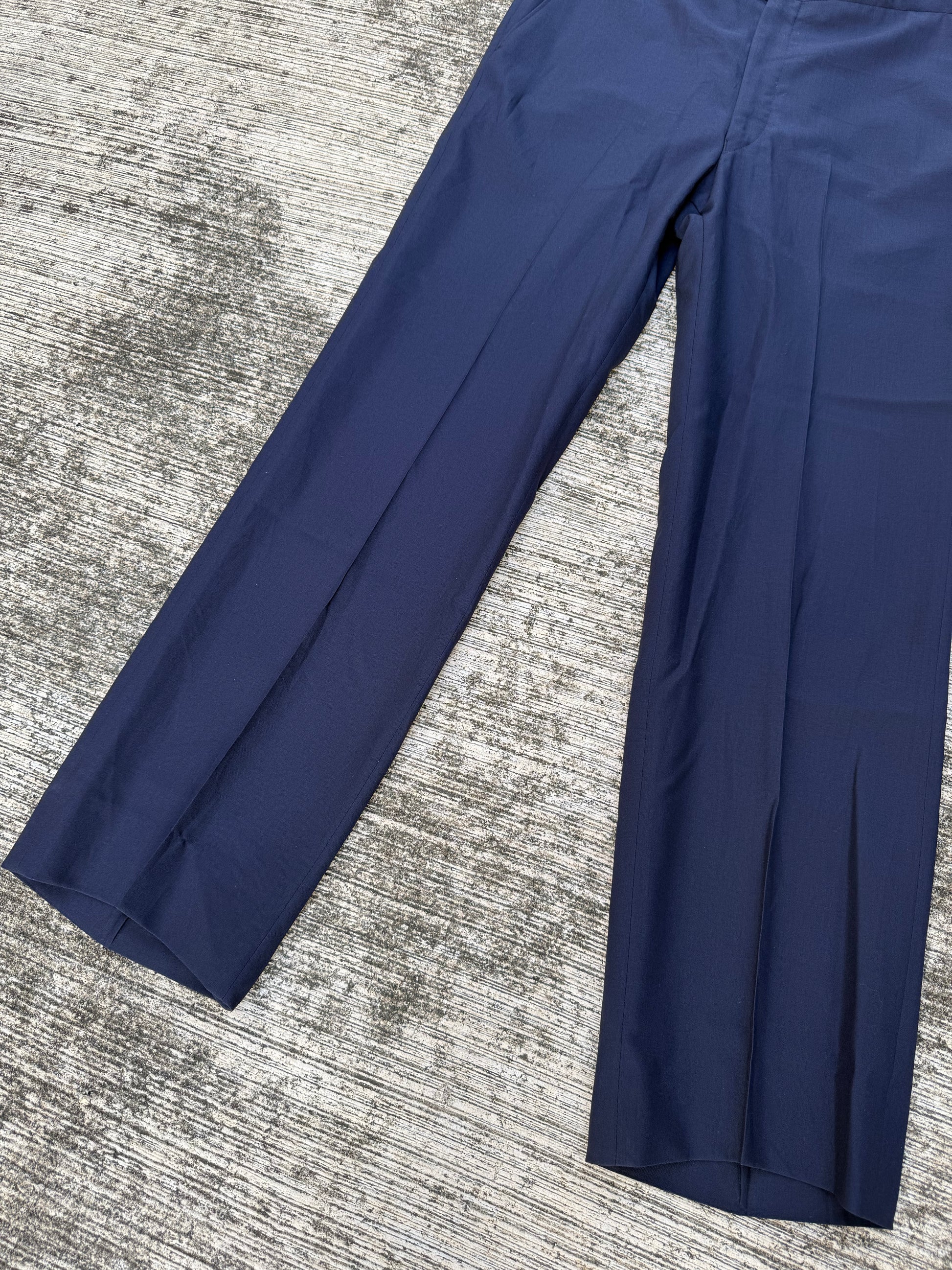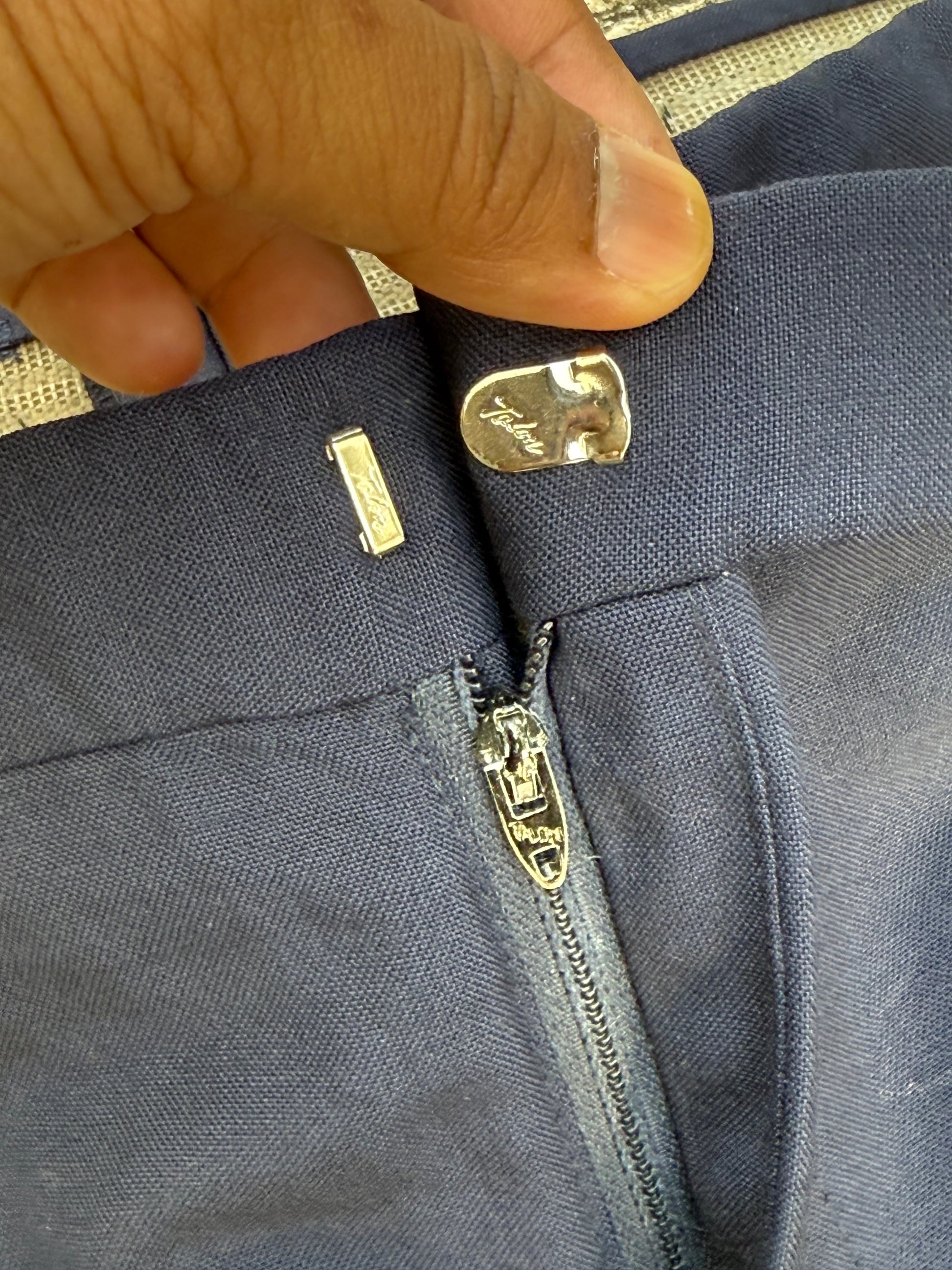 Rare vintage tailored trousers from the 1960s–70s, made in smooth navy gabardine fabric. Features Talon hook & Talon zipper closure, high-waist cut, cuffed hem, and classic straight leg.