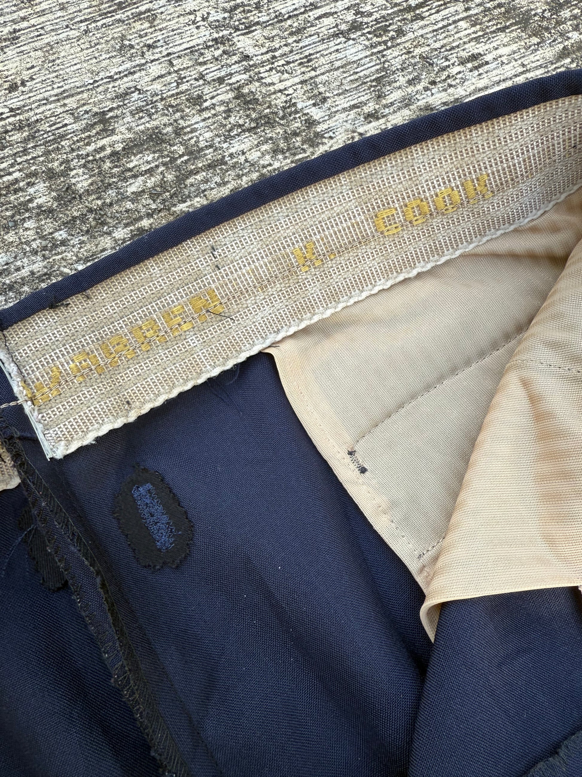 The interior waistband carries the woven name tape “Warren K. Cook”, a hallmark of custom mid-century tailoring. Beautifully constructed with timeless menswear details.