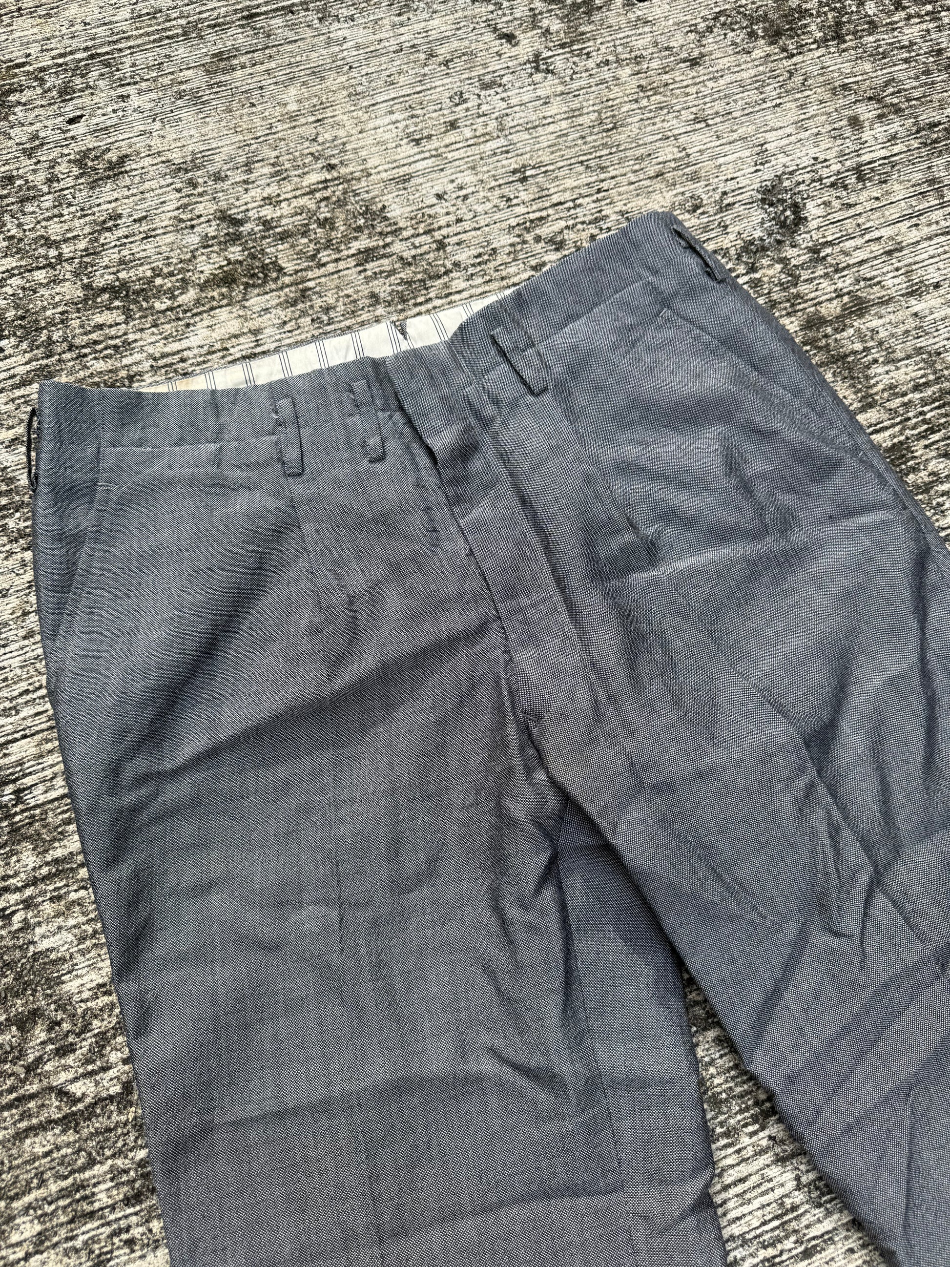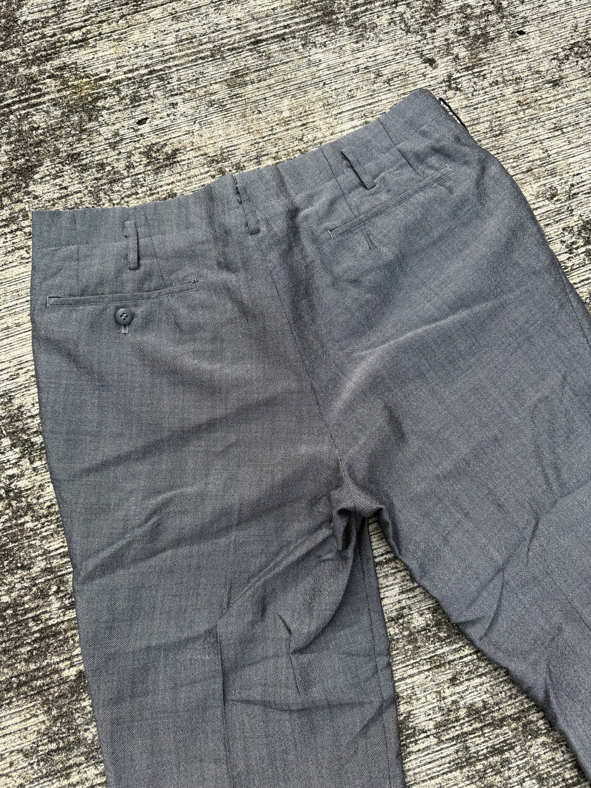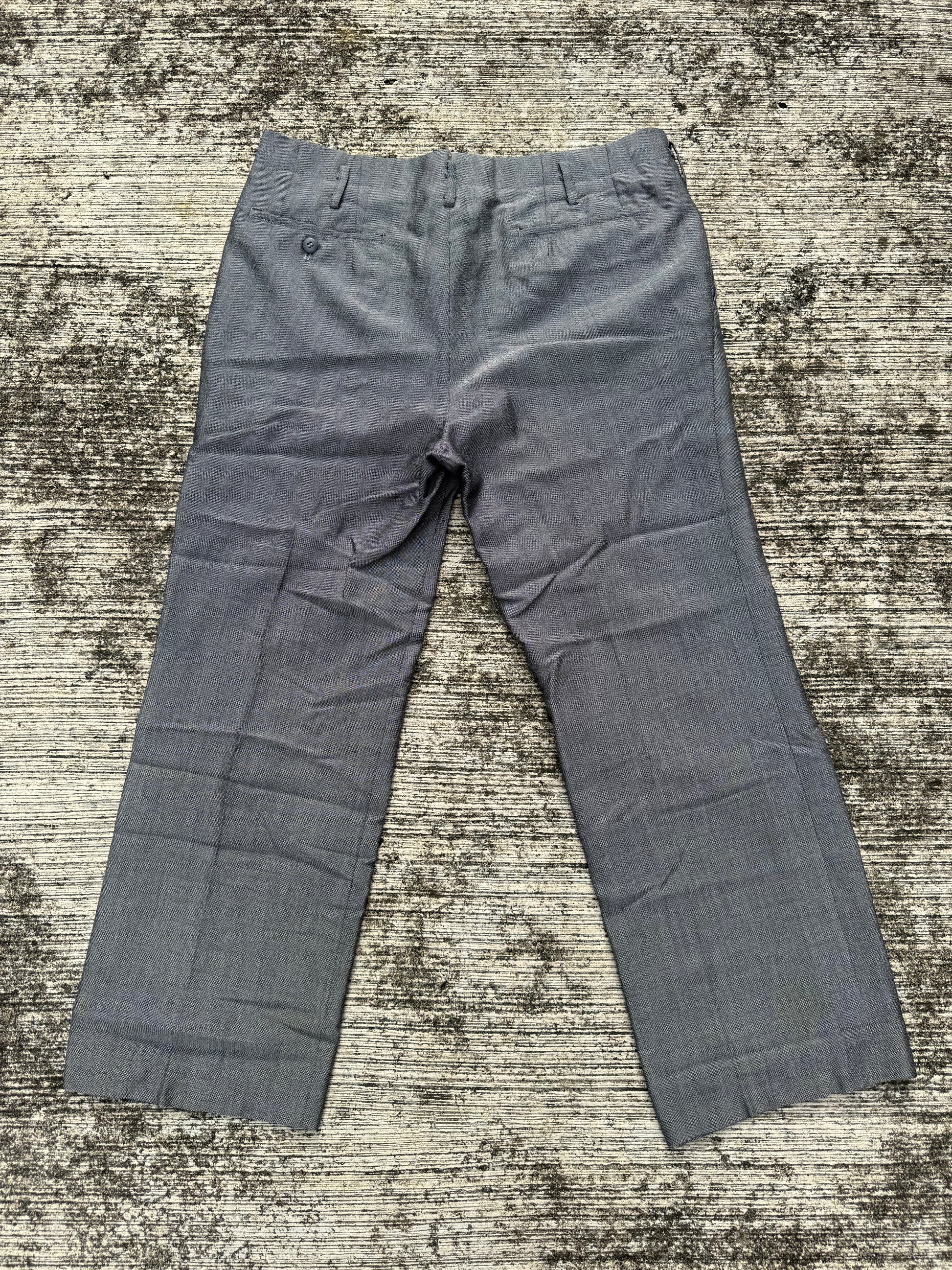 Authentic vintage grey trousers from the 1960s, tailored in a timeless straight leg cut. Features a structured waistband with belt loops, slanted side entry pockets, and welted back pockets for a clean, minimal silhouette.