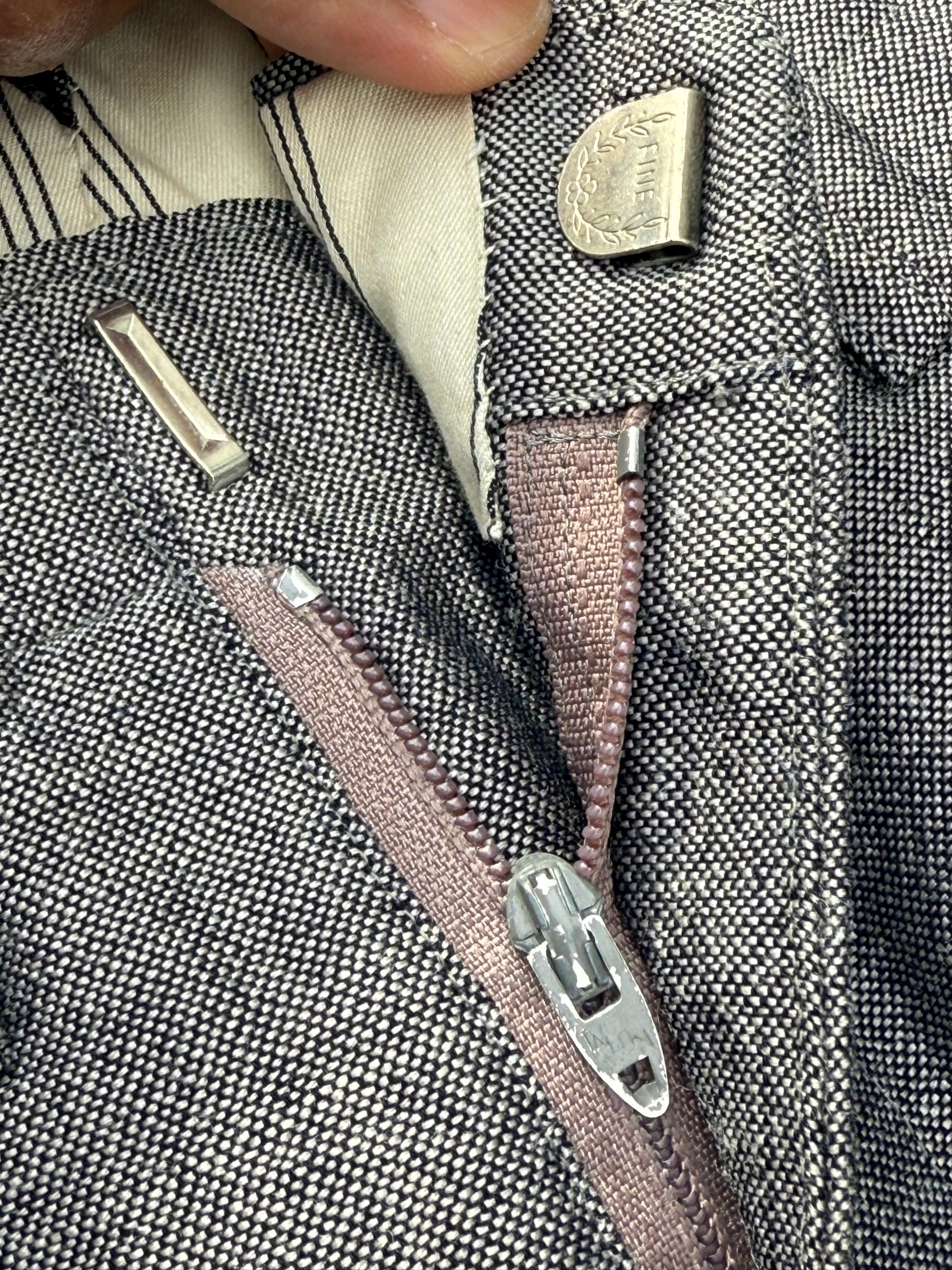 Equipped with a Talon zipper and “FINE” stamped metal hook closure — mid-century details that confirm its era and craftsmanship. The inner waistband is finished with striped cotton lining, showing classic tailoring construction from the period.