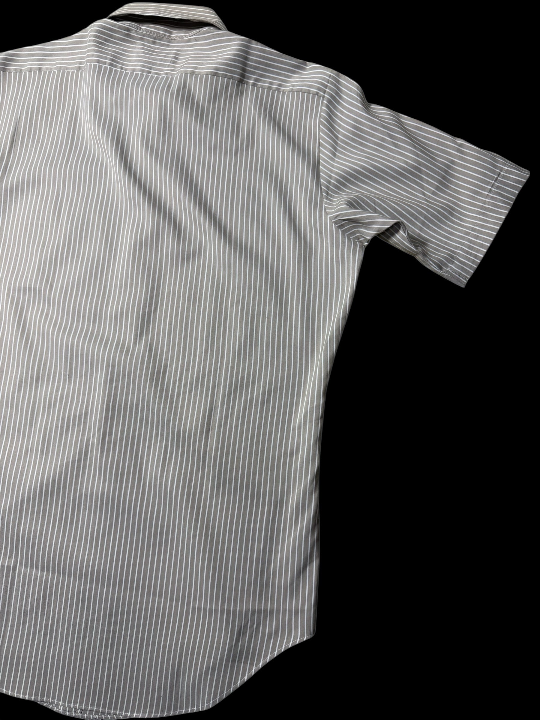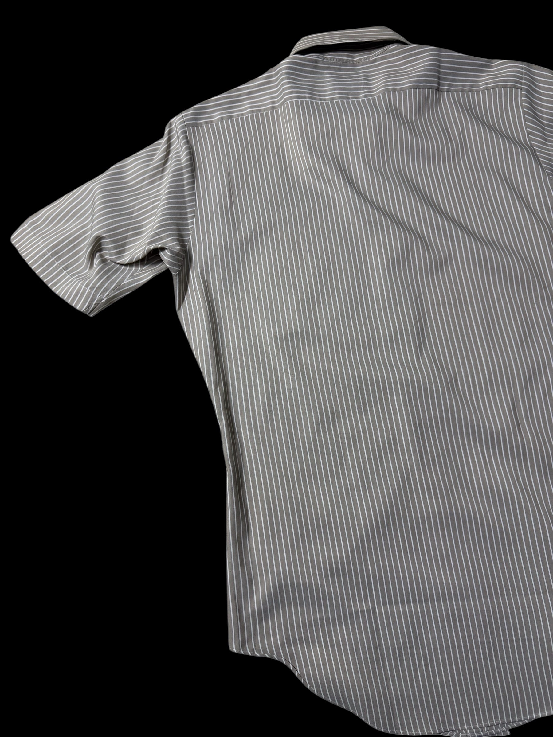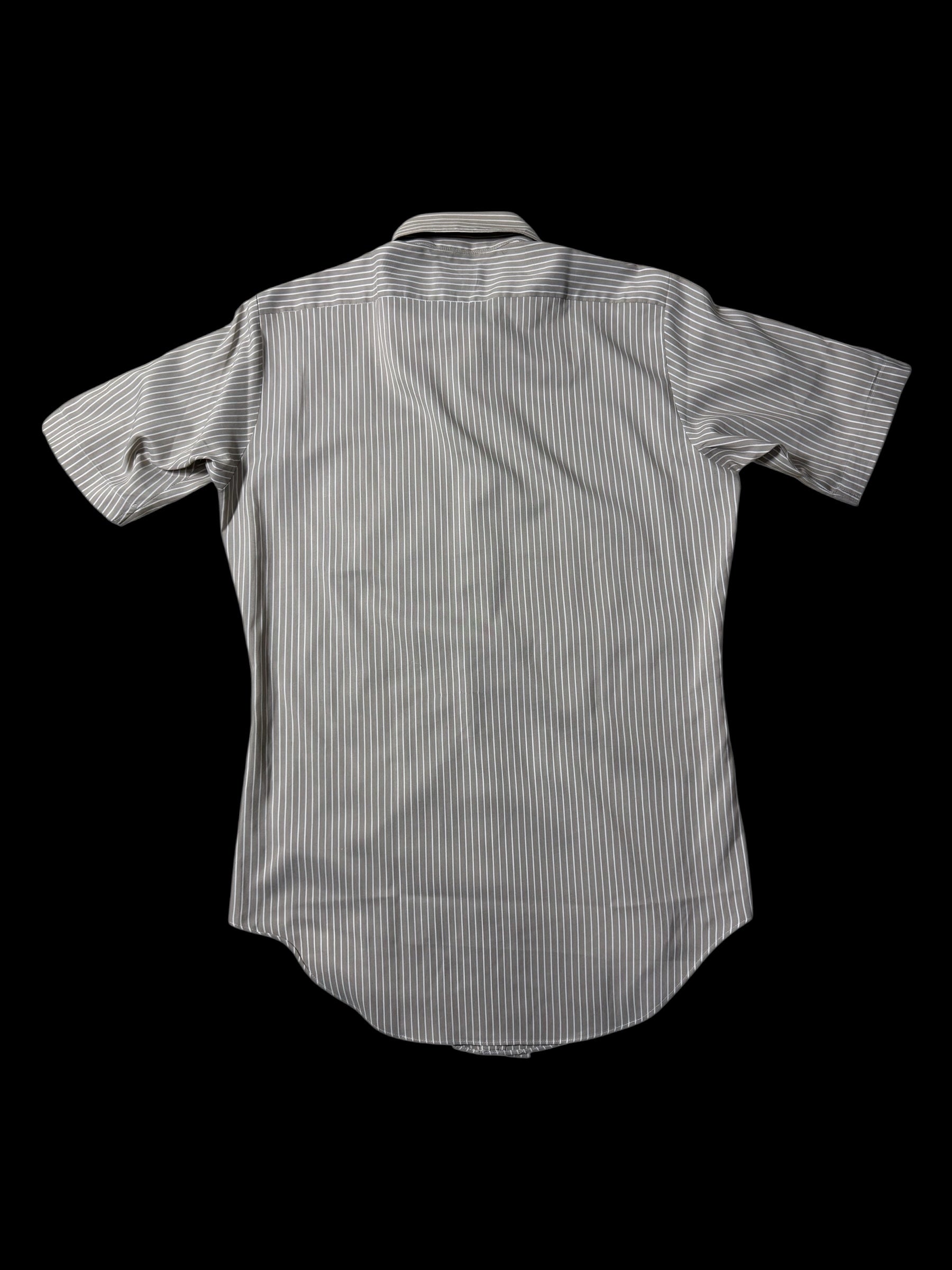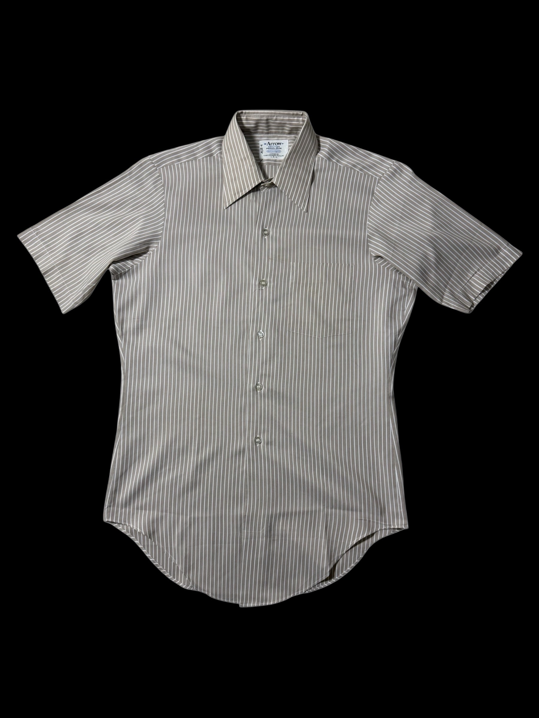 Original vintage short sleeve shirt by Arrow Decton Perma-Iron produced in the late 1970s to early 1980s era. Features classic vertical pinstripe pattern in grey tone with pointed collar and curved hem. Made with Perma-Iron Sanforized fabric licensed by Cluett Peabody USA, designed for durability and easy care. A clean timeless American workwear inspired dress shirt suitable for casual or smart styling.