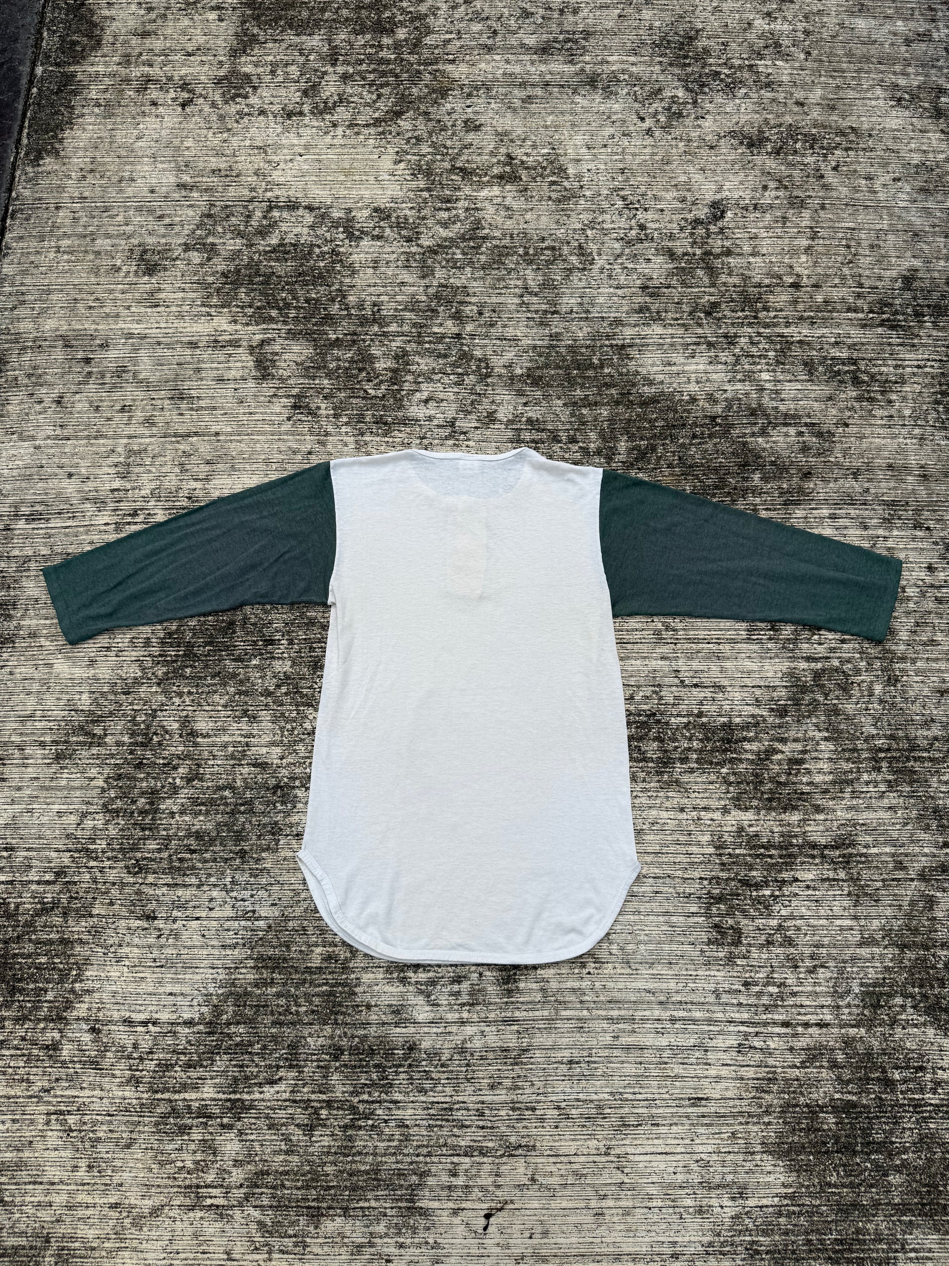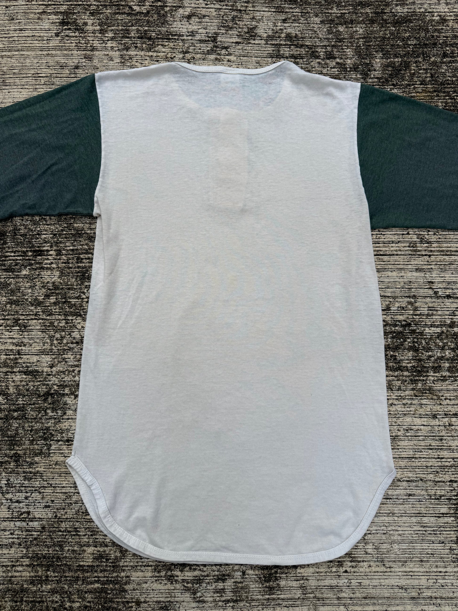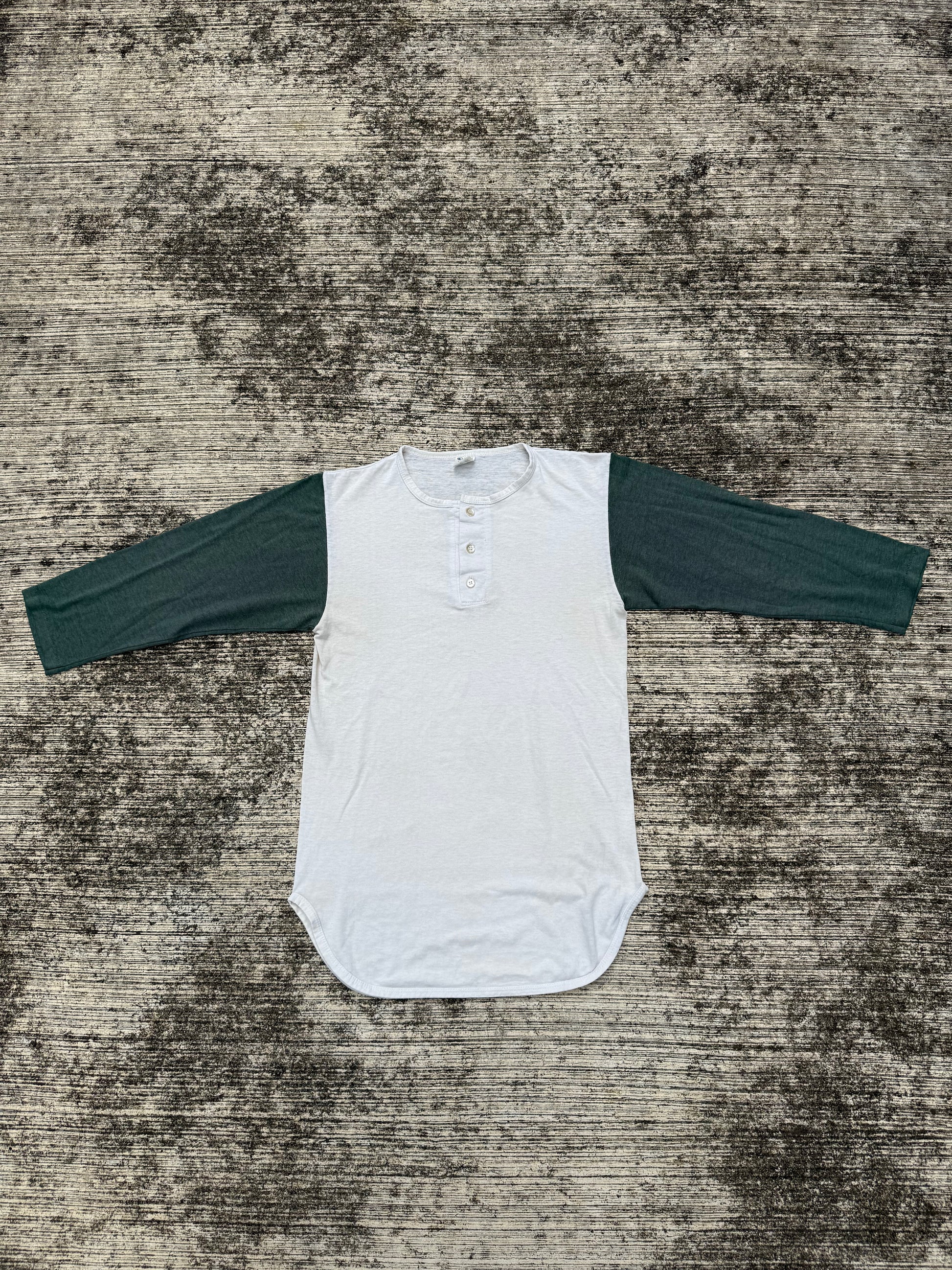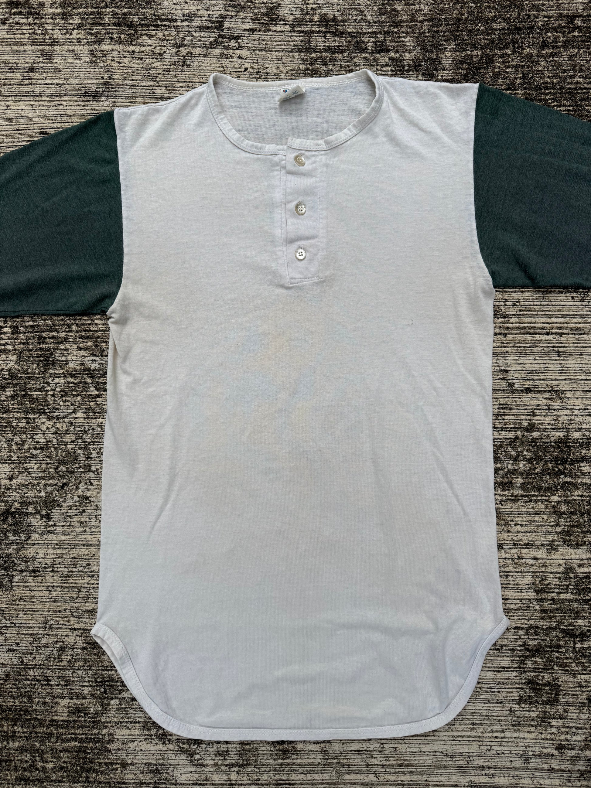 Constructed from soft cotton/poly blend with white body and contrasting green raglan sleeves. Features a three-button henley placket and curved hem. A staple piece of vintage athletic wear, commonly used for baseball and intramural sports.