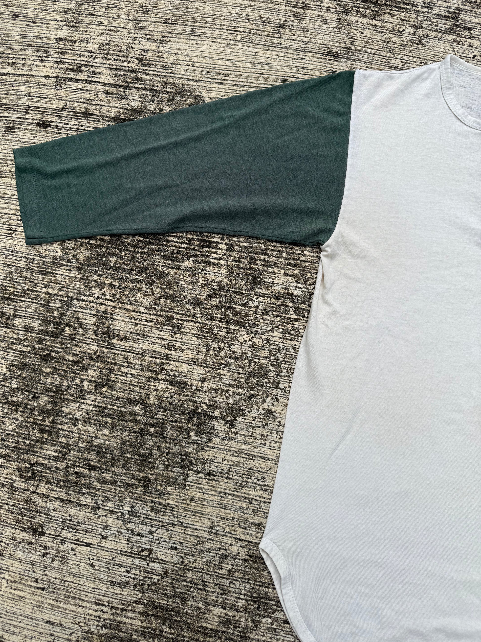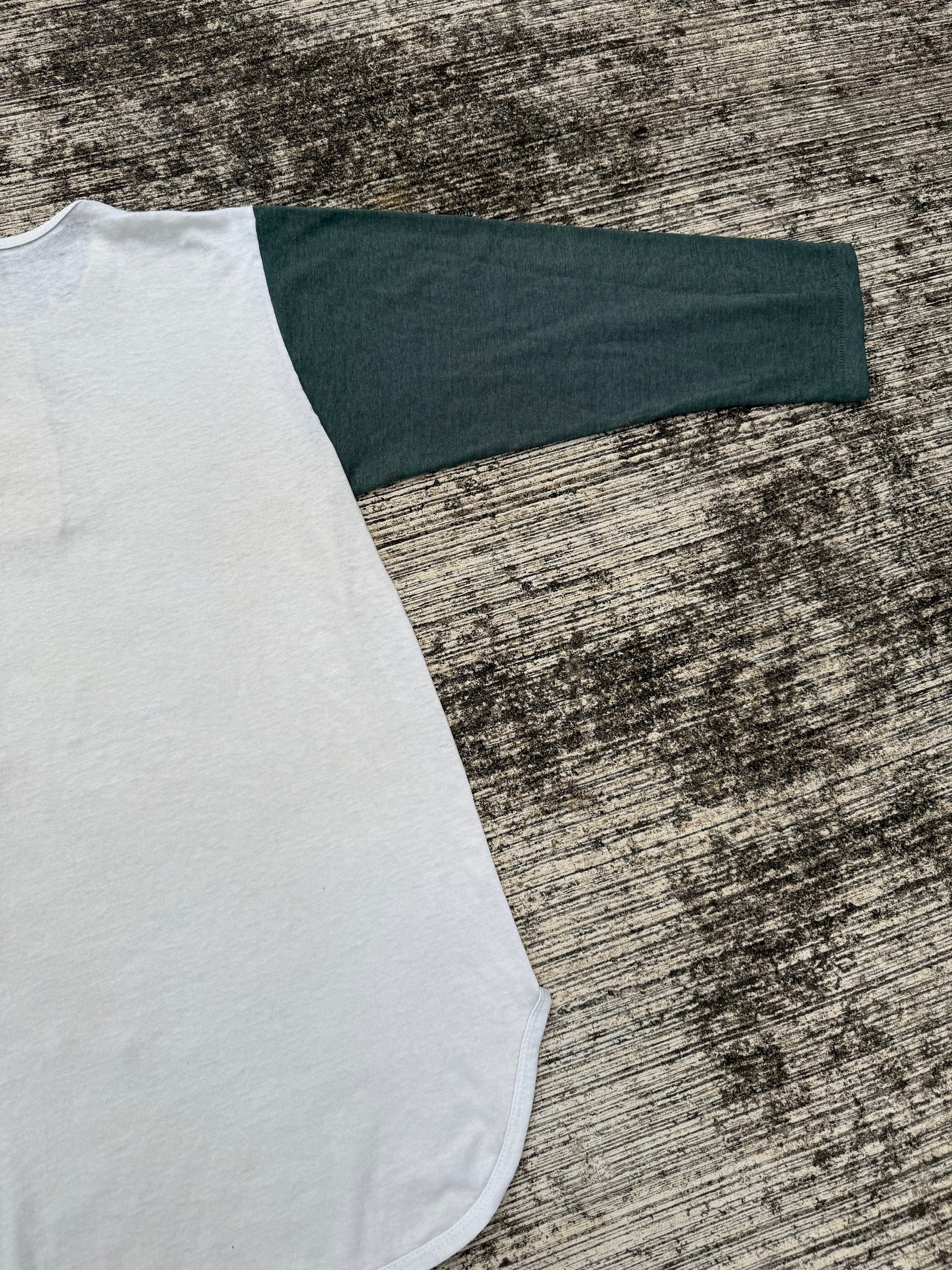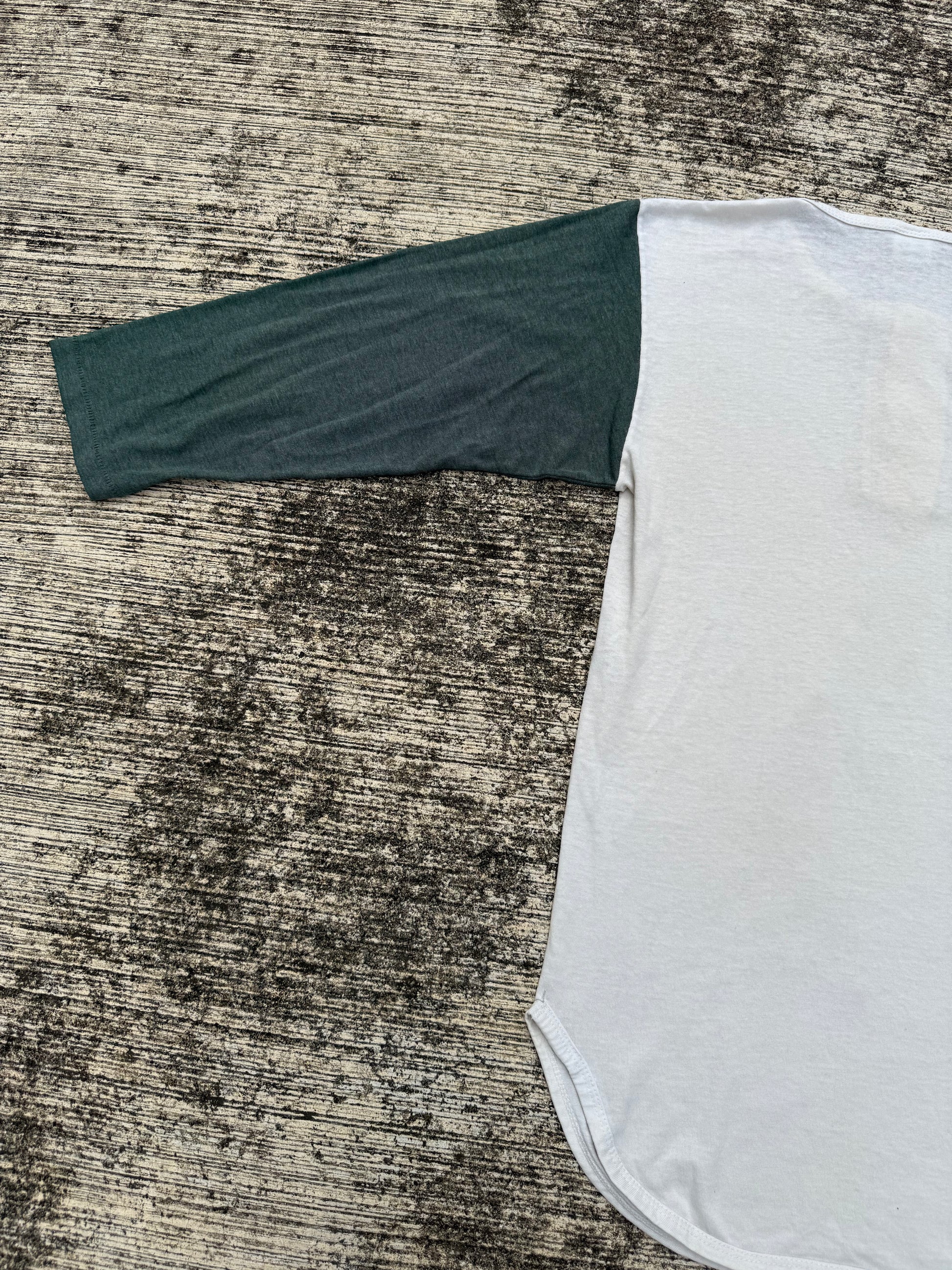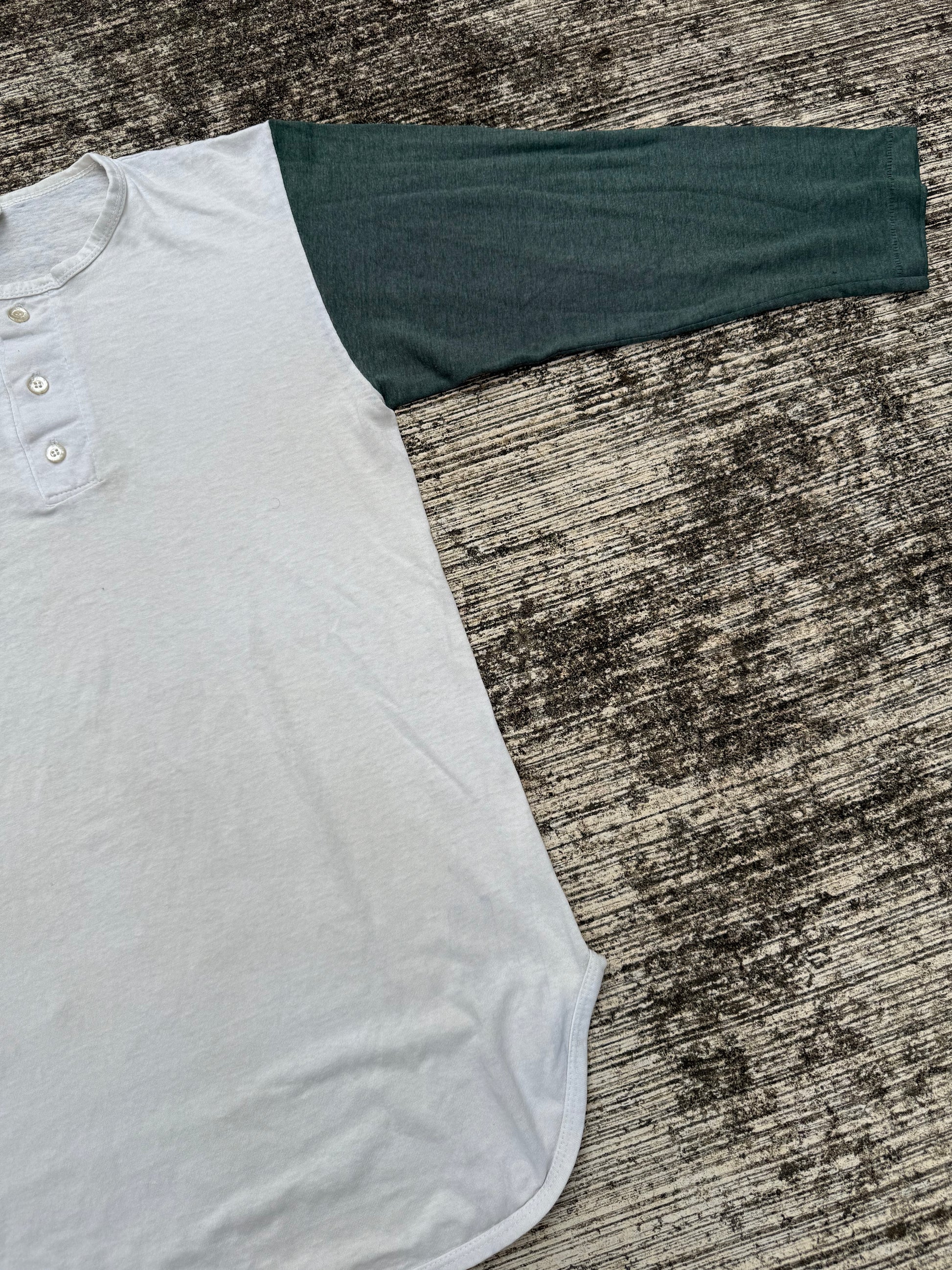 Constructed from soft cotton/poly blend with white body and contrasting green raglan sleeves. Features a three-button henley placket and curved hem. A staple piece of vintage athletic wear, commonly used for baseball and intramural sports.