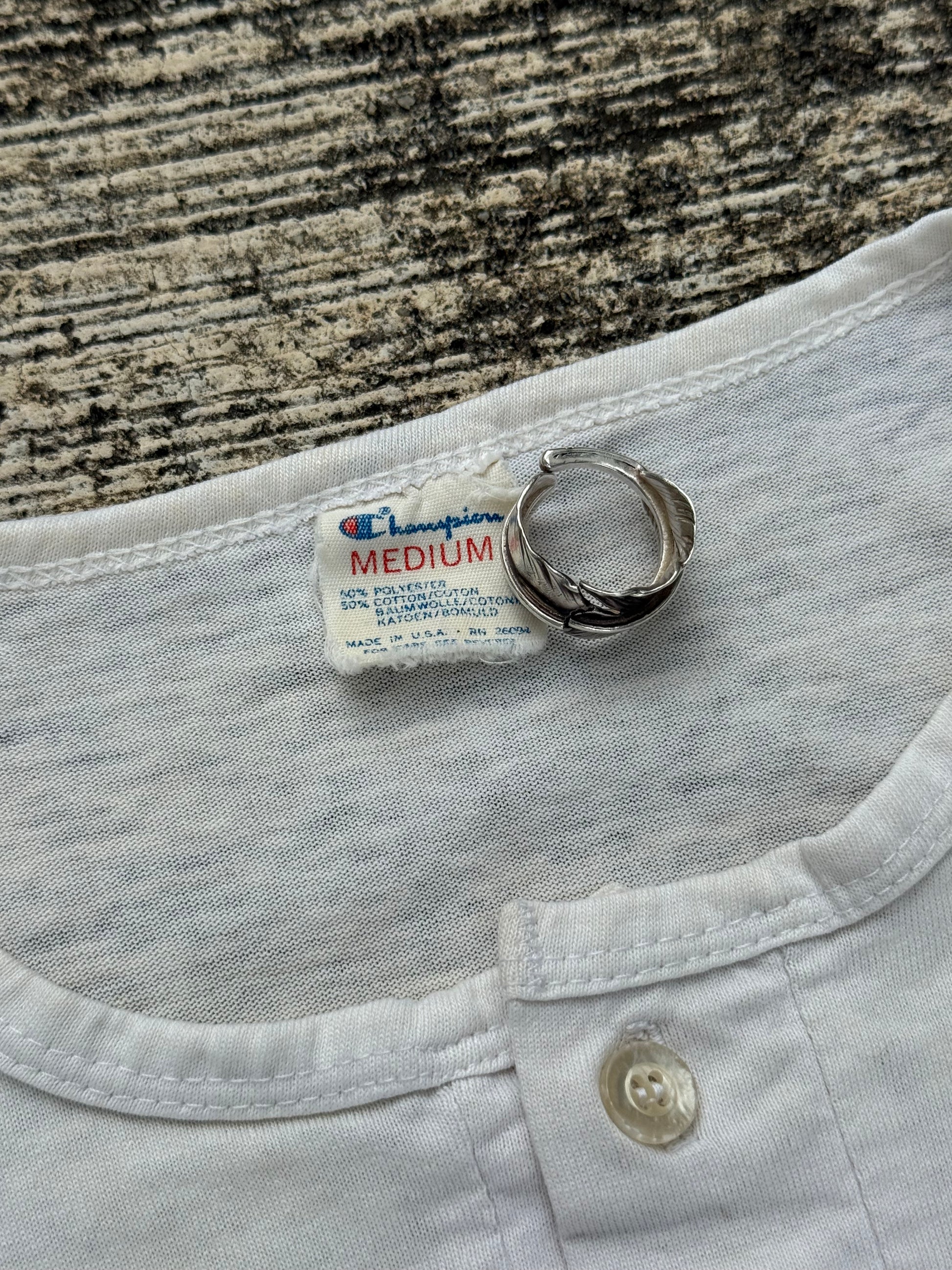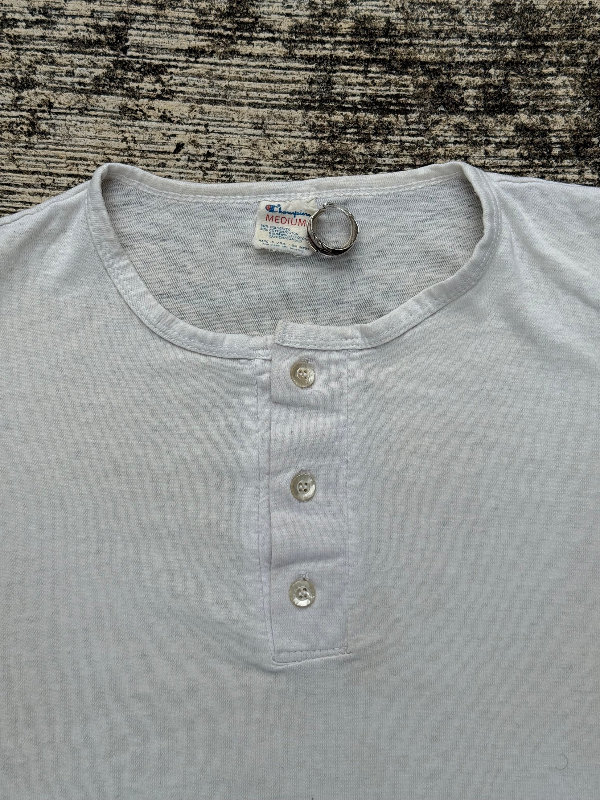 Authentic vintage Champion henley-style baseball tee from the 1970s–80s.