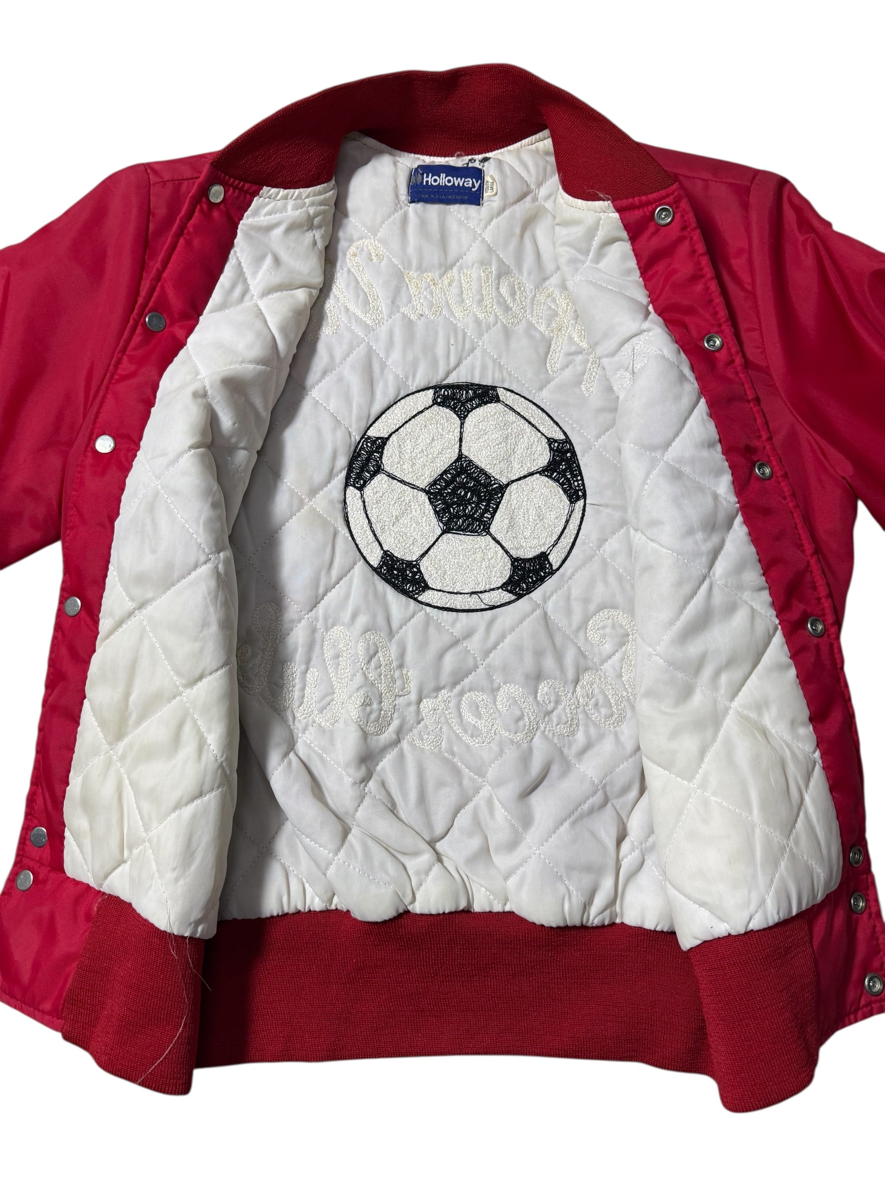 Original vintage 1980s Holloway varsity jacket featuring classic snap front construction with ribbed collar cuffs and hem. Made in USA with quilted inner lining and embroidered Chippewa Valley Soccer Club graphics at the back. Traditional American team jacket styling commonly seen in school and club sports during the 1980s era.