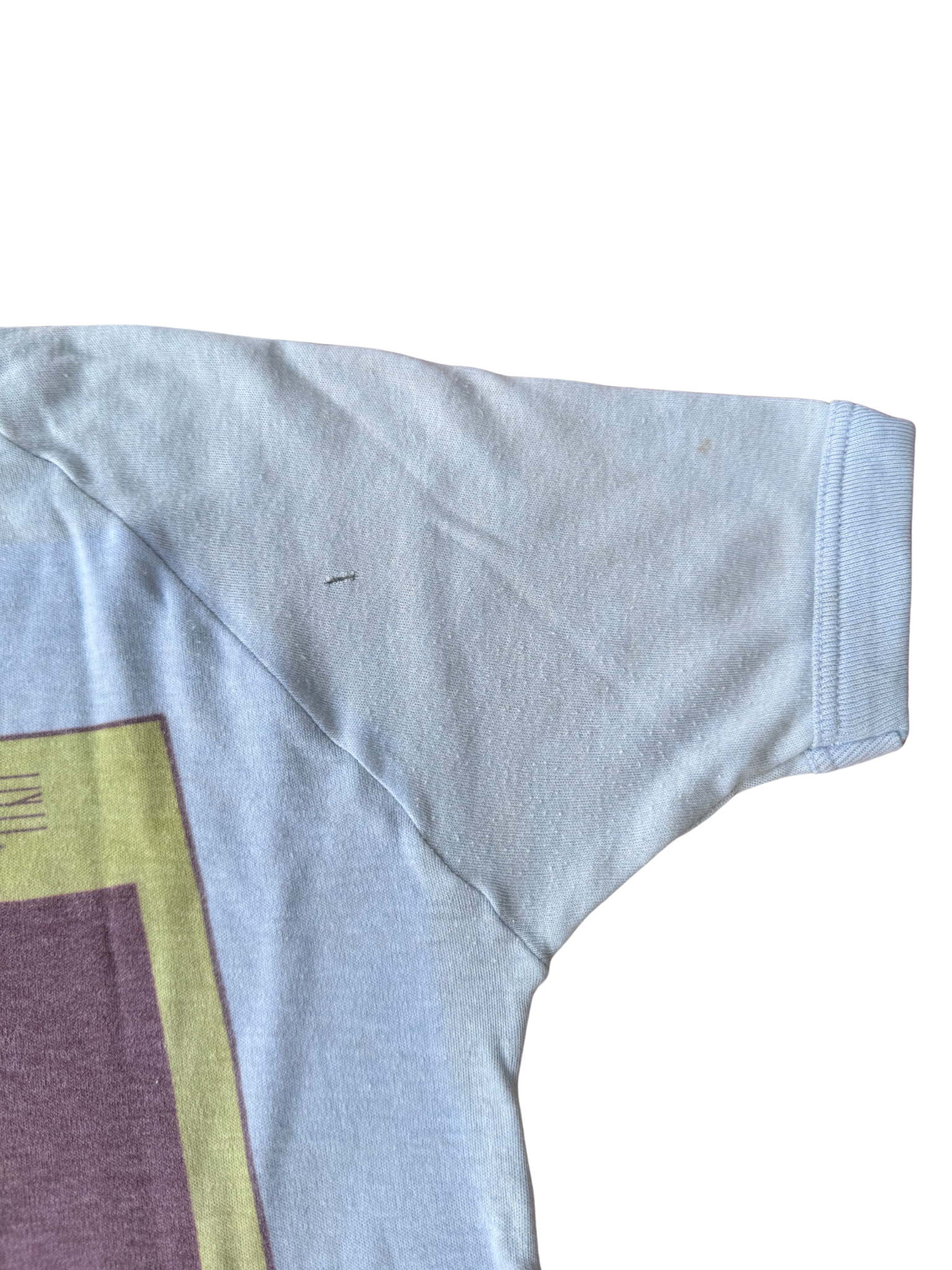 Soft light blue cotton body with raglan sleeves and single-stitch hem, true to late-70s kidswear construction. A rare licensed Australian print capturing ABBA’s golden disco years.