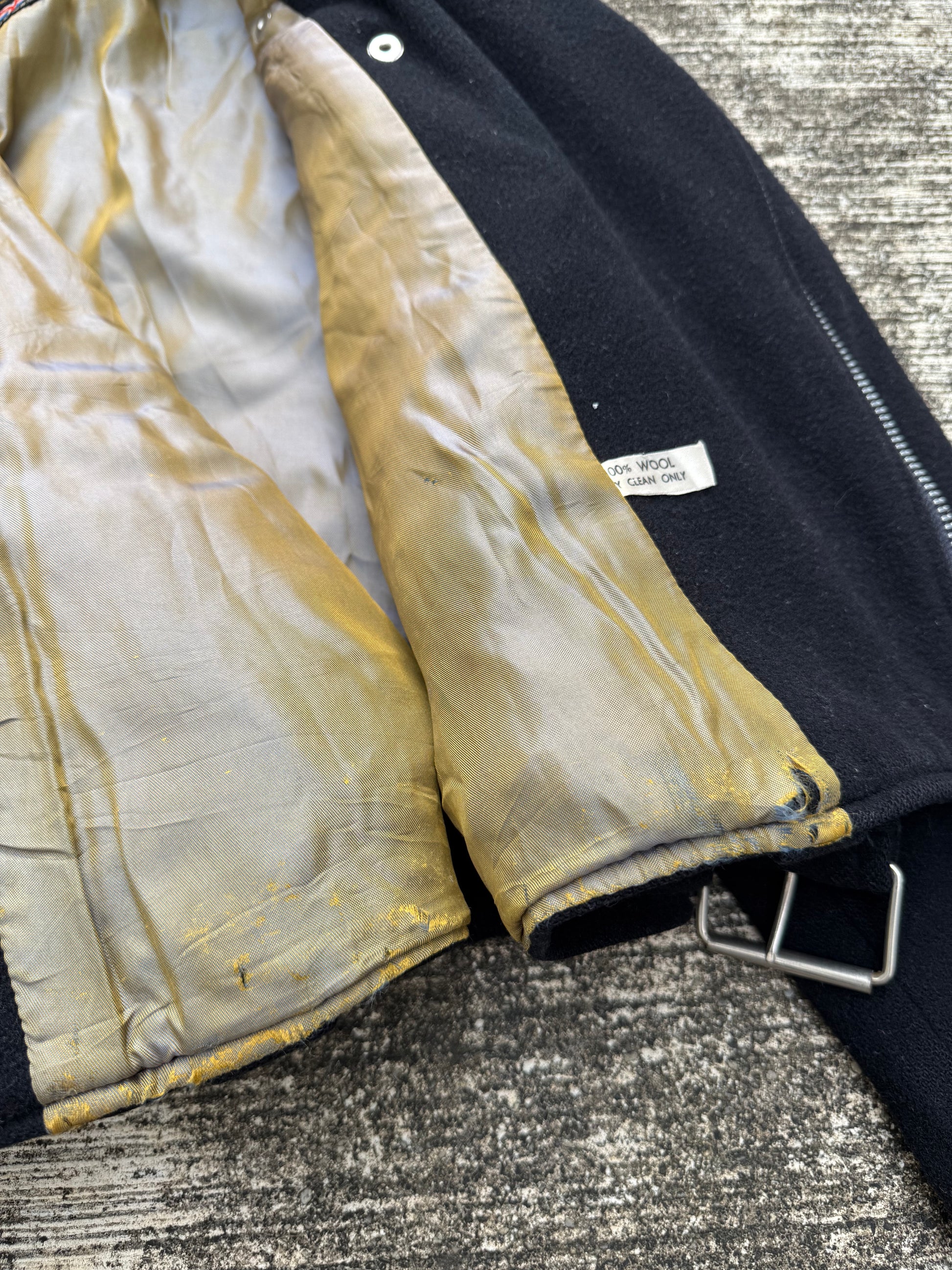 Features include asymmetrical zip closure, three front zippered pockets, shoulder epaulettes, belted waist, and zip cuffs. Lined with golden satin interior. Original Union Jack woven label intact.