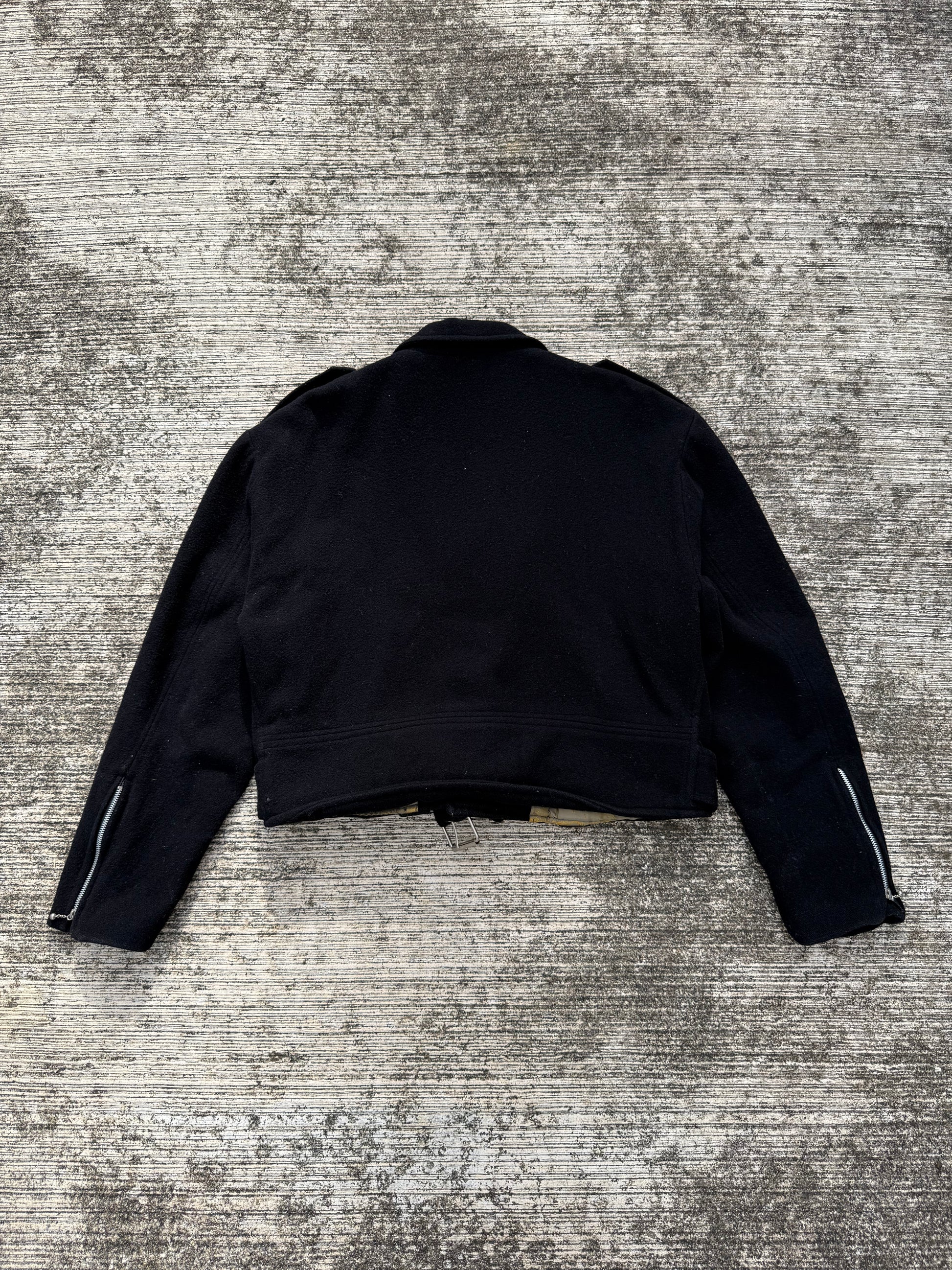 Constructed from heavy black wool melton with a cropped fit, this piece channels the iconic motorcycle jacket silhouette in a non-leather version.