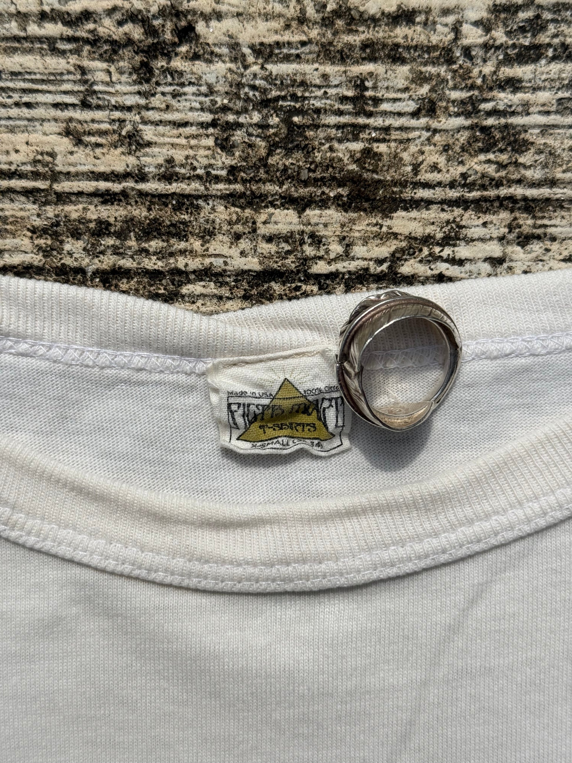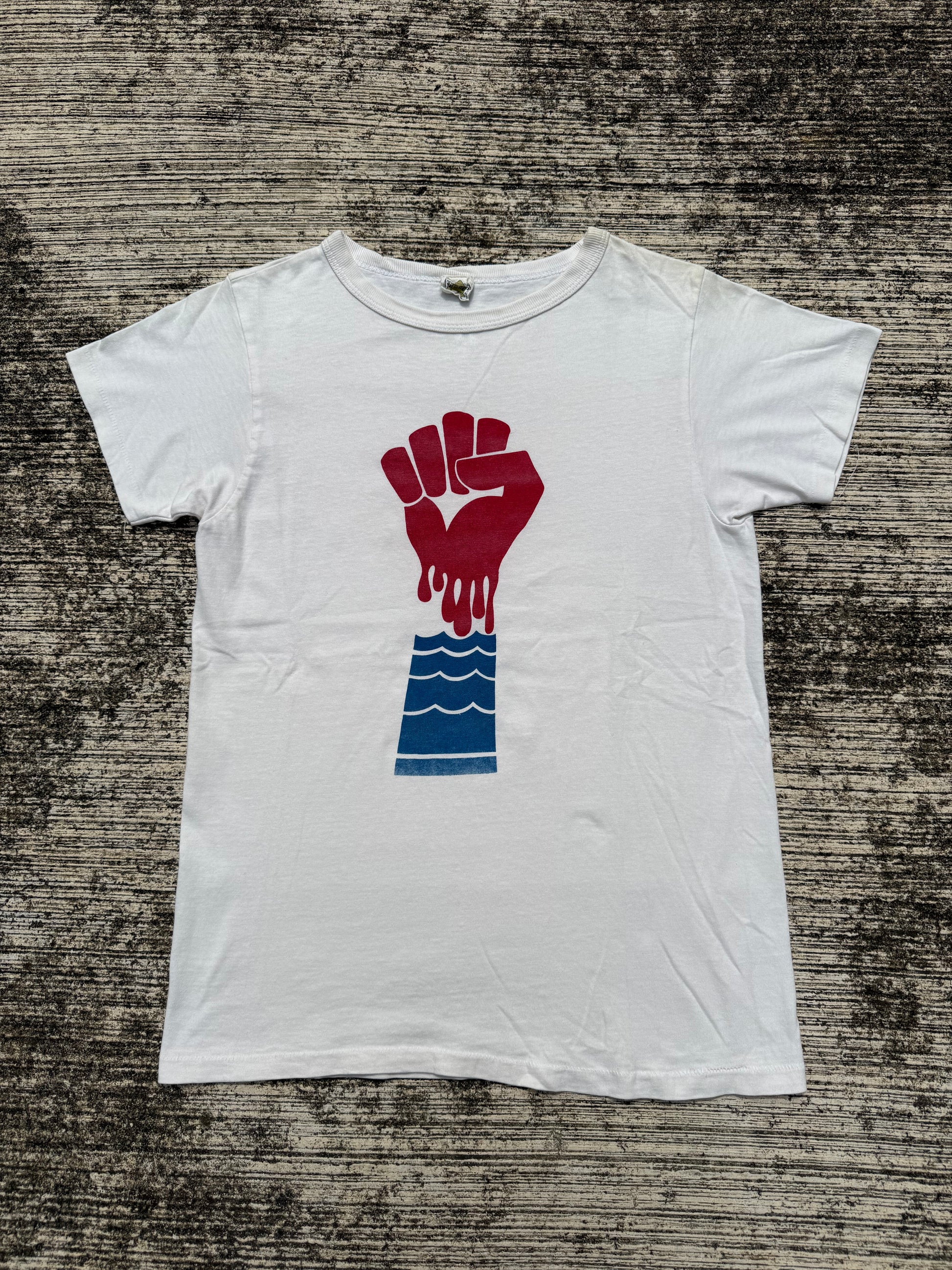 Original 1970s Fight Mart tee featuring a bold protest-inspired fist graphic dripping into blue wave lines. Printed on Fight Mart USA-made blank with classic soft cotton feel and single stitch construction. Rare piece of activist streetwear history with strong visual impact, perfect for collectors of protest graphics and vintage political tees.