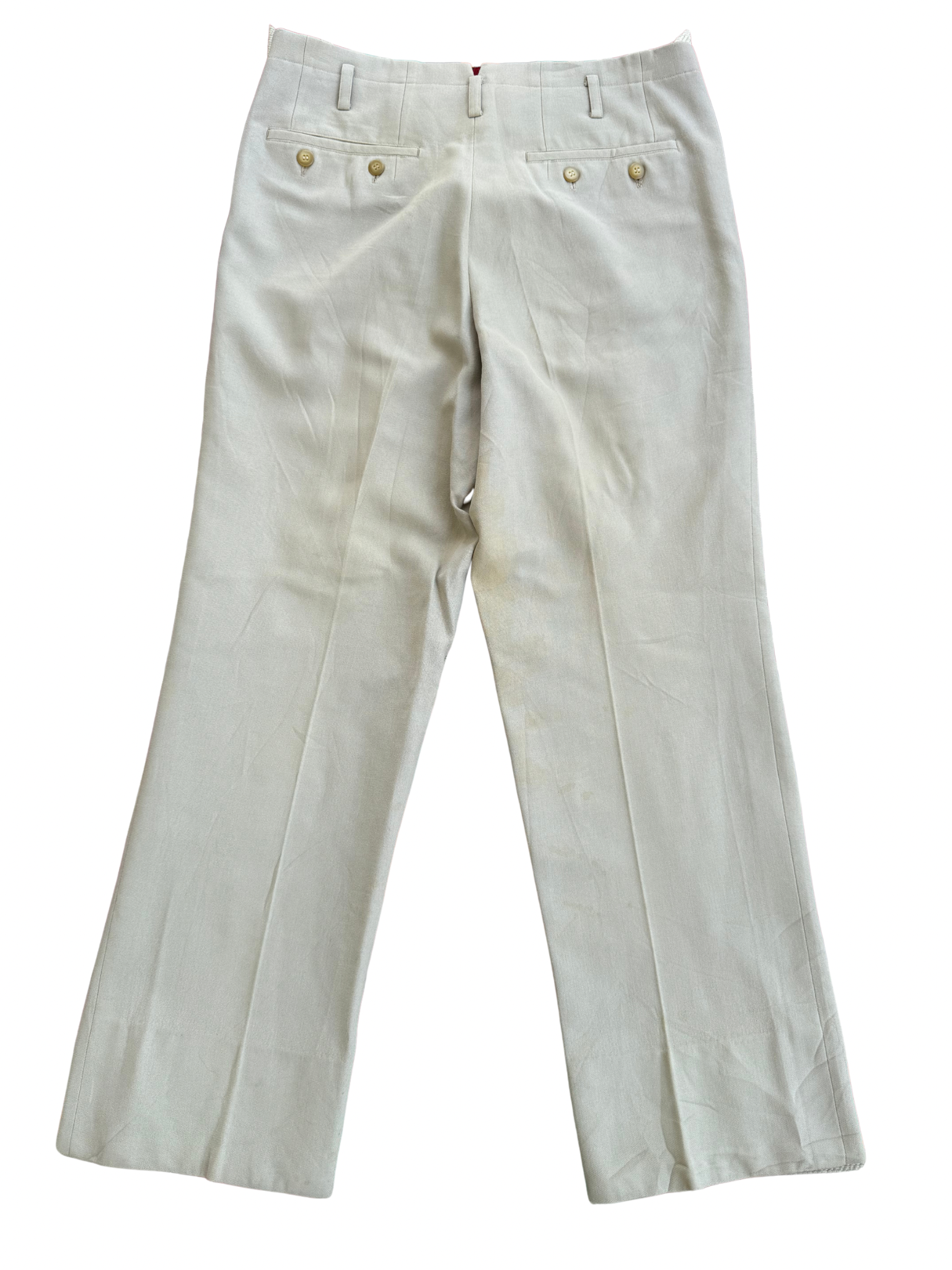 Original early 1970s gabardine trousers featuring Talon metal zipper and clean mid-rise straight cut. Constructed from heavyweight poly-cotton gabardine fabric with striped cotton waistband lining and twin back pockets.