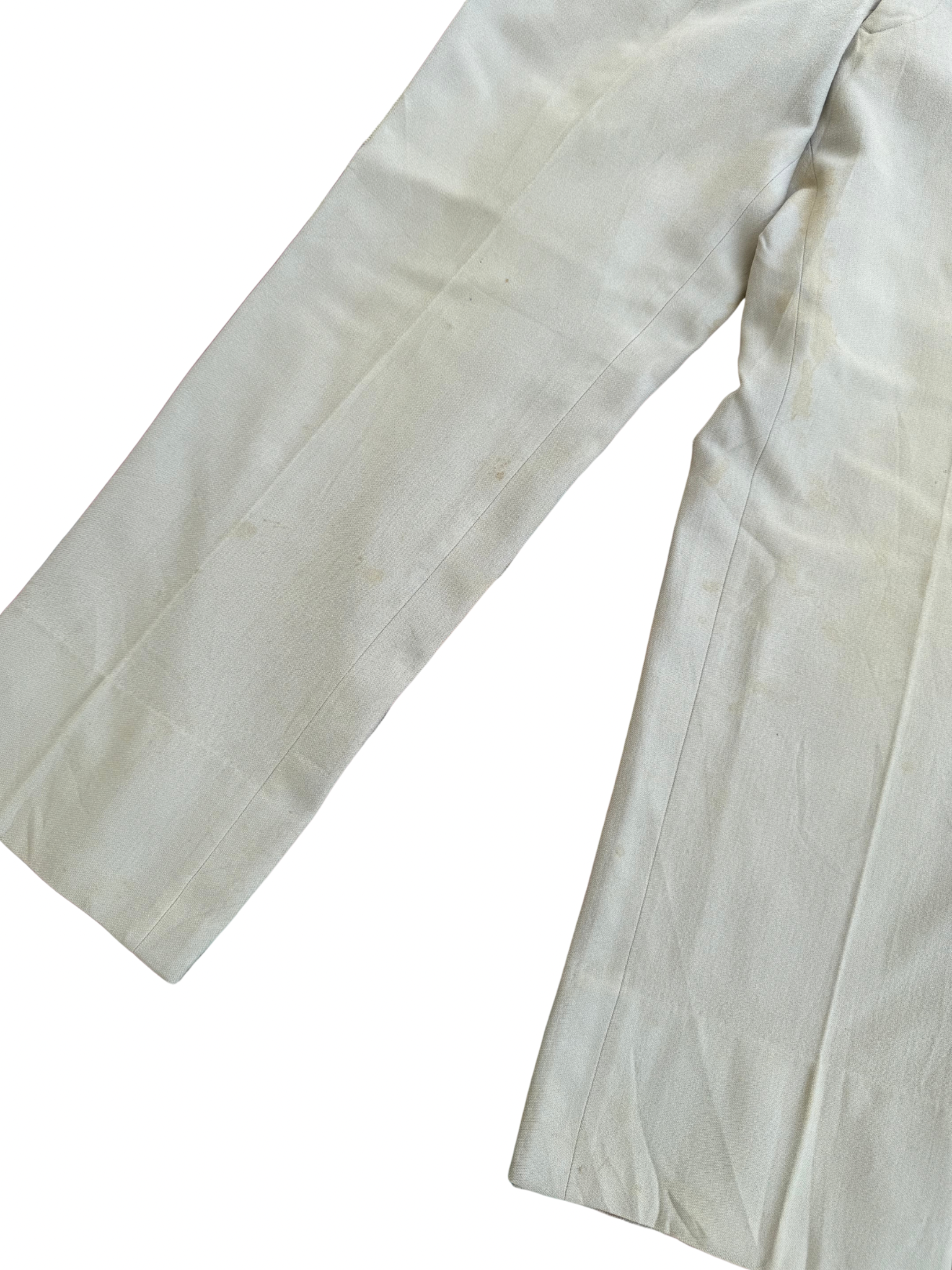 Has visible yellowing on inner thigh and back area (see photos). Good vintage condition with visible discoloration and minor wear consistent with age. Still structurally solid and wearable.