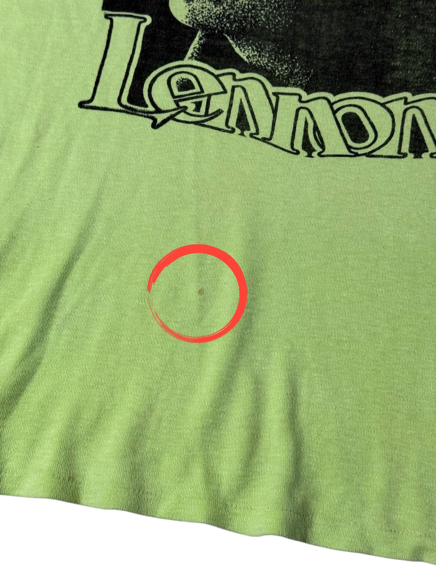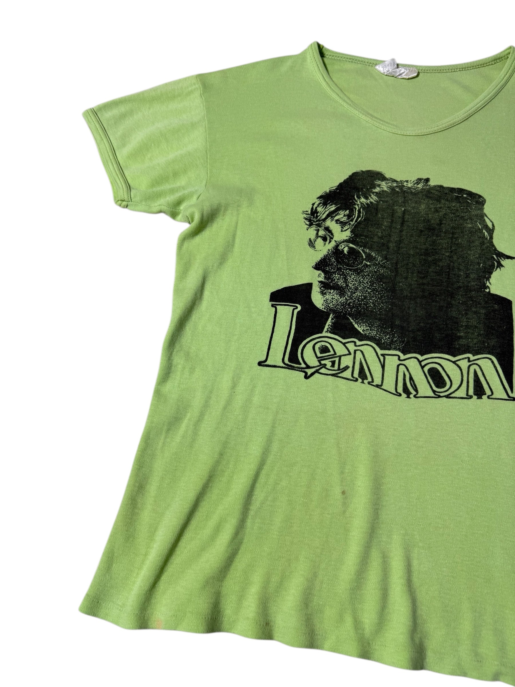 Original 1970s John Lennon fan tee in bright lime-green cotton.