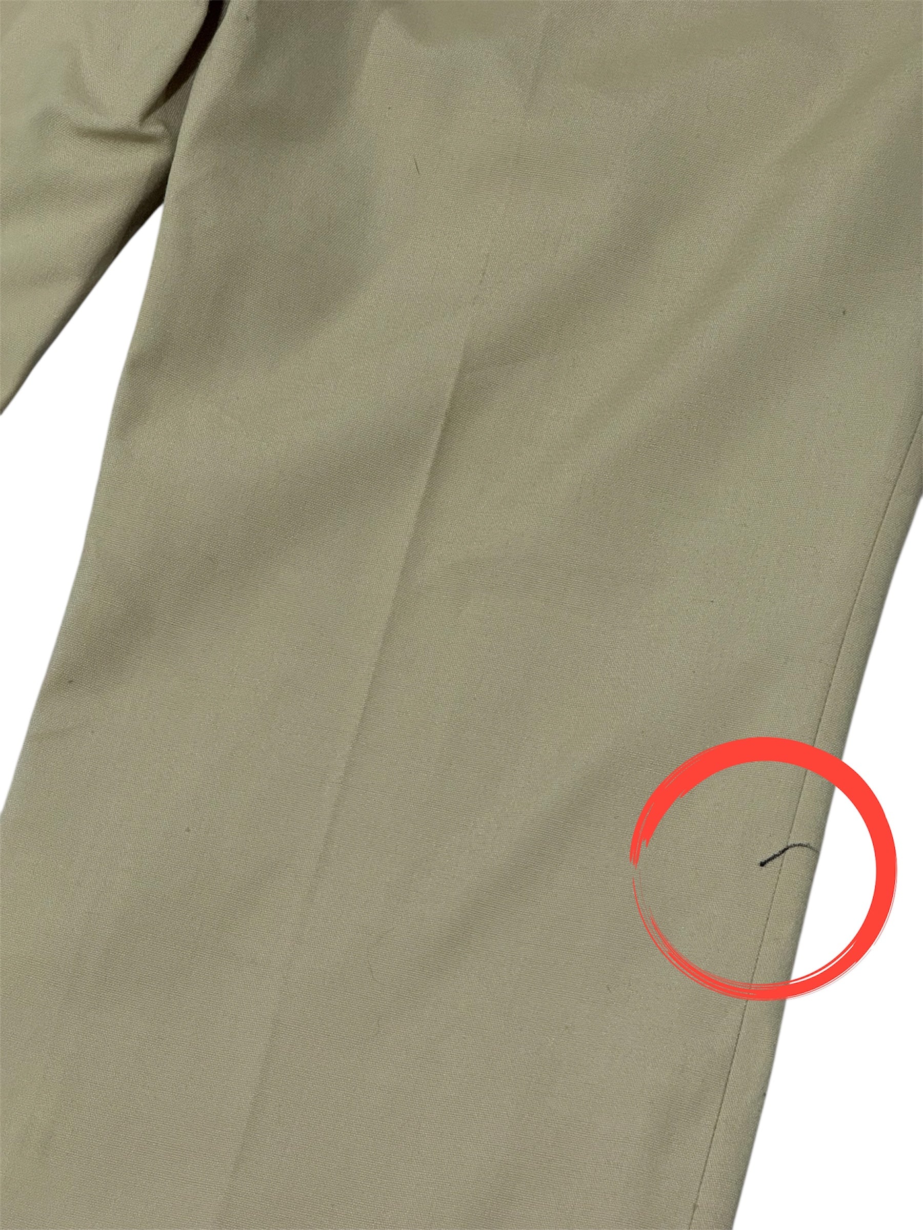 Original JoS. A. Bank Clothiers trousers from the 1970s, made in the USA during the early “permanent press” era. Features a Talon nylon zipper, metal hook closure, and durable poly–cotton gabardine blend in classic khaki beige. Designed as part of JoS. A. Bank’s wash-and-wear tailoring line, no ironing needed, with a crisp front crease and dual welt back pockets. A timeless American staple reflecting clean 1970s menswear aesthetics.