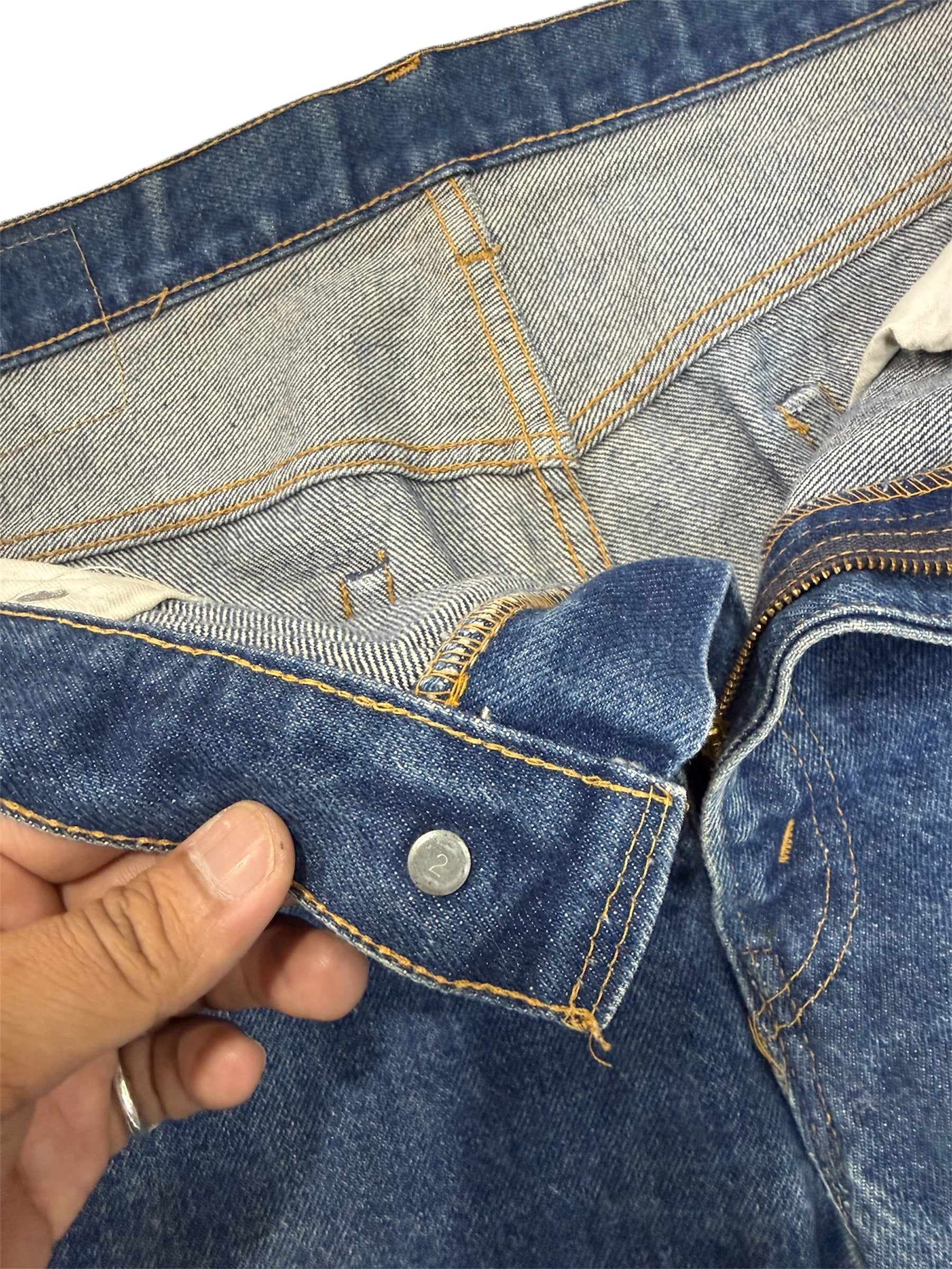 Good vintage condition for 70s denim. Minor wear on buttonhole and belt loop. No holes. Zipper works smoothly.