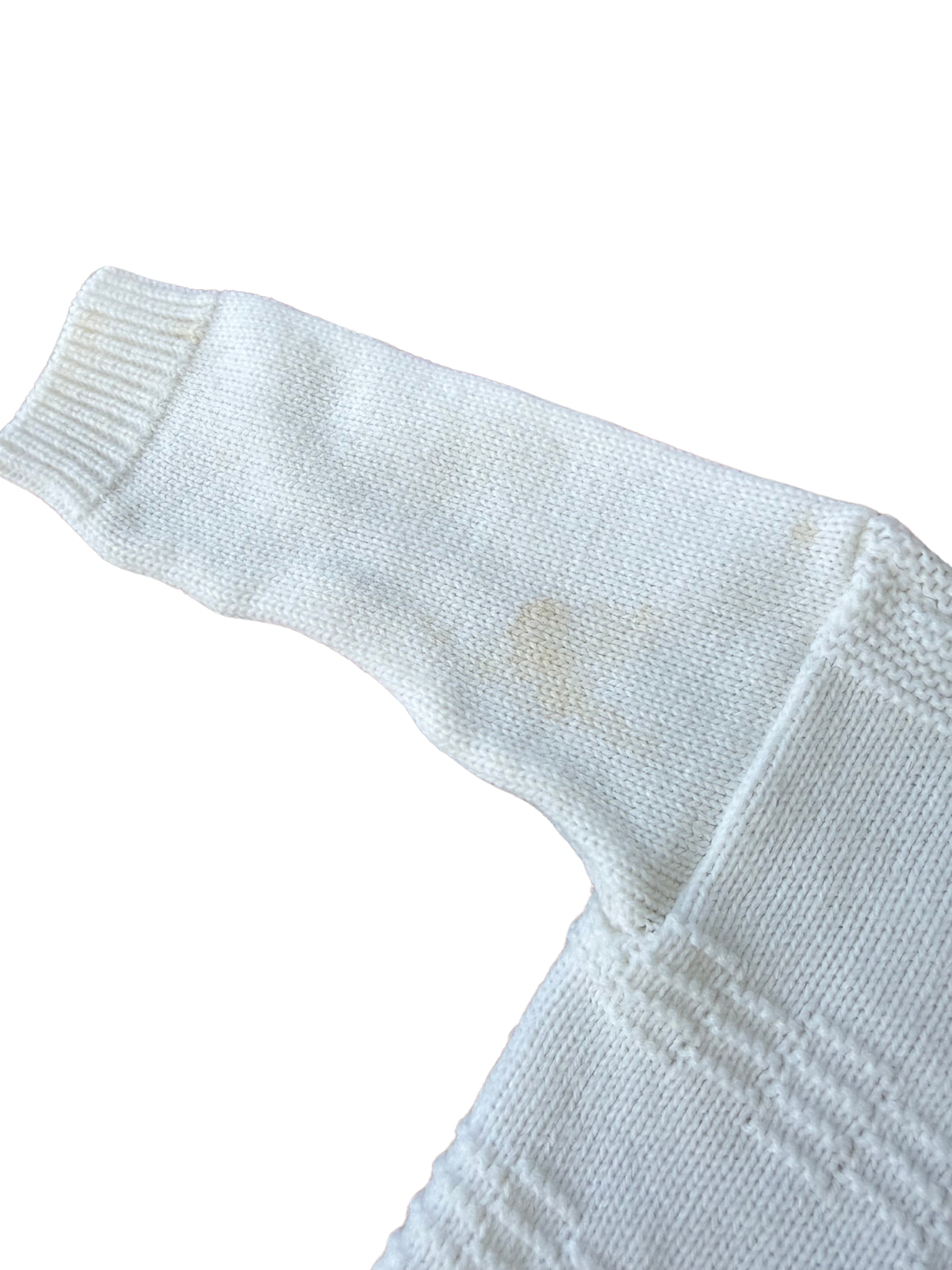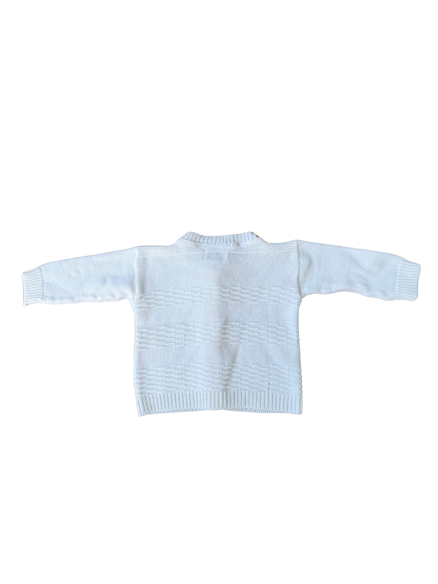 Original 1970s Little Togs Knitwear baby cardigan in soft ivory white. Made in USA from 100% acrylic with subtle textured check pattern and vintage pearl-style buttons. Classic mid-century baby knit aesthetic, warm, light, and perfect for layering.