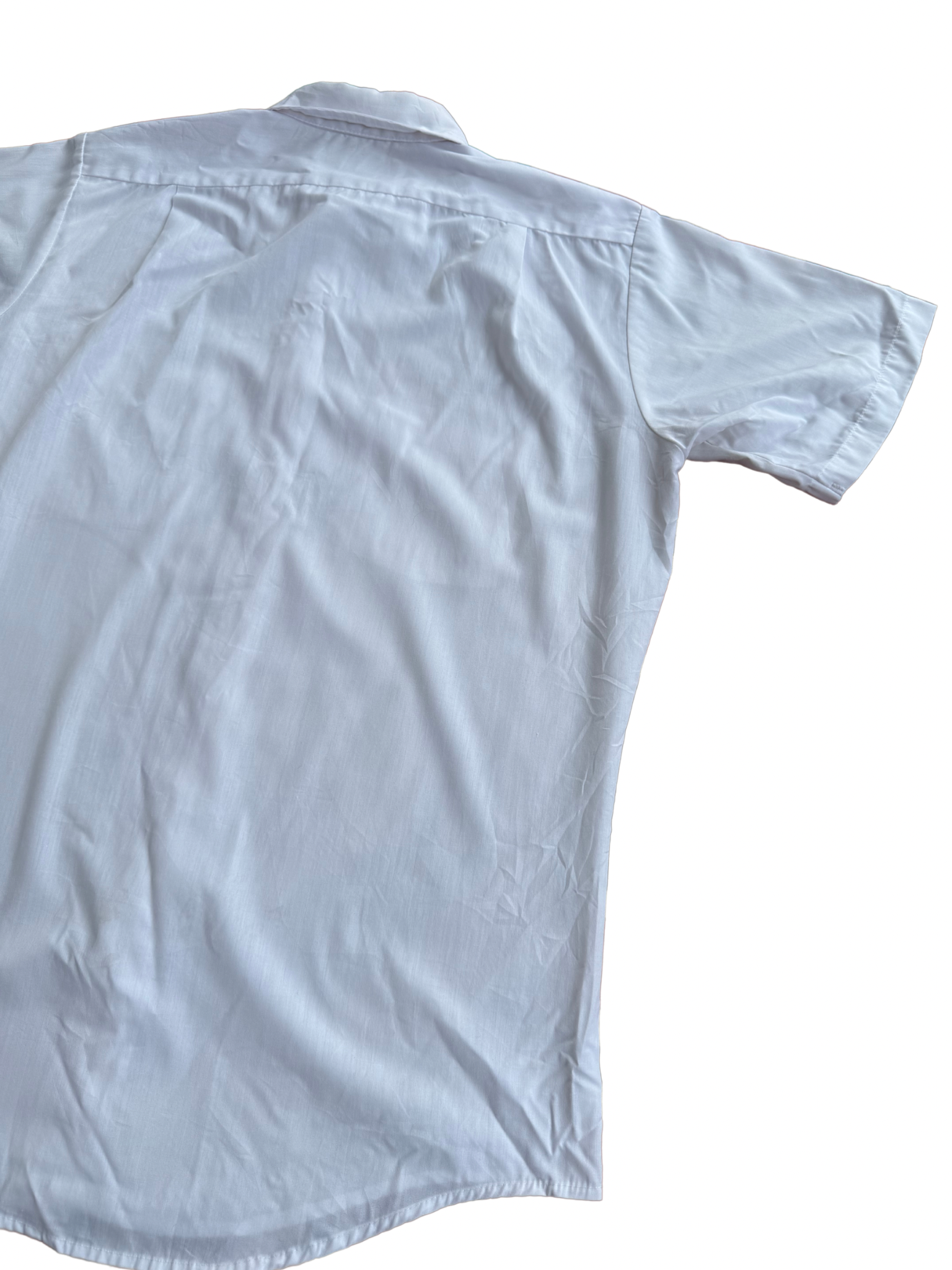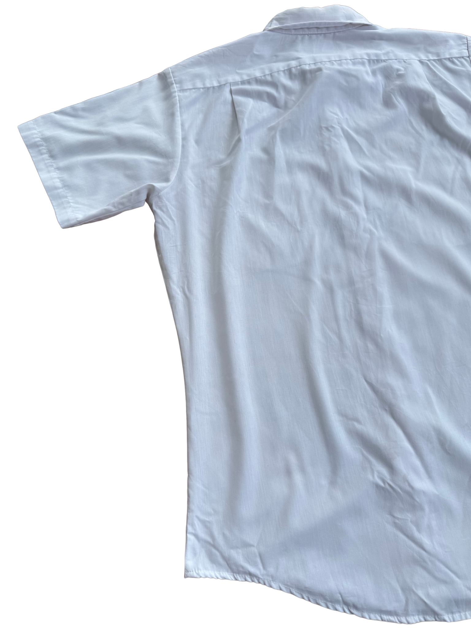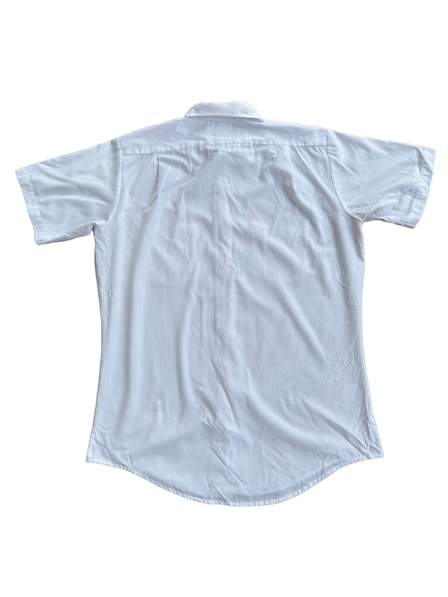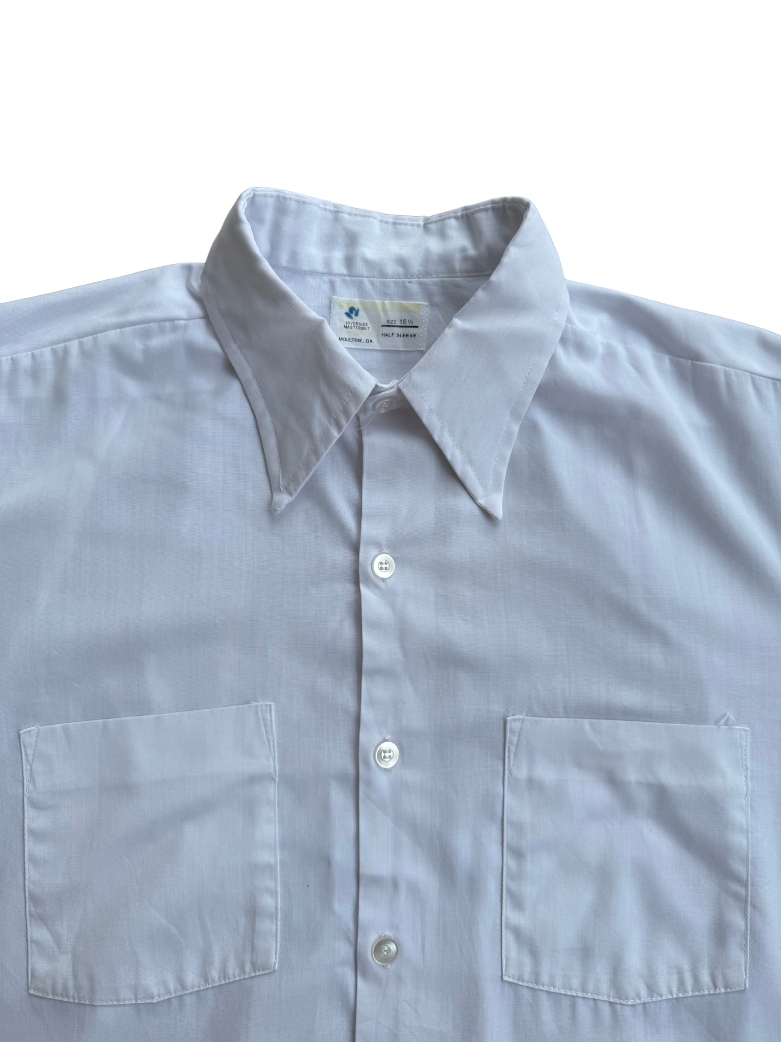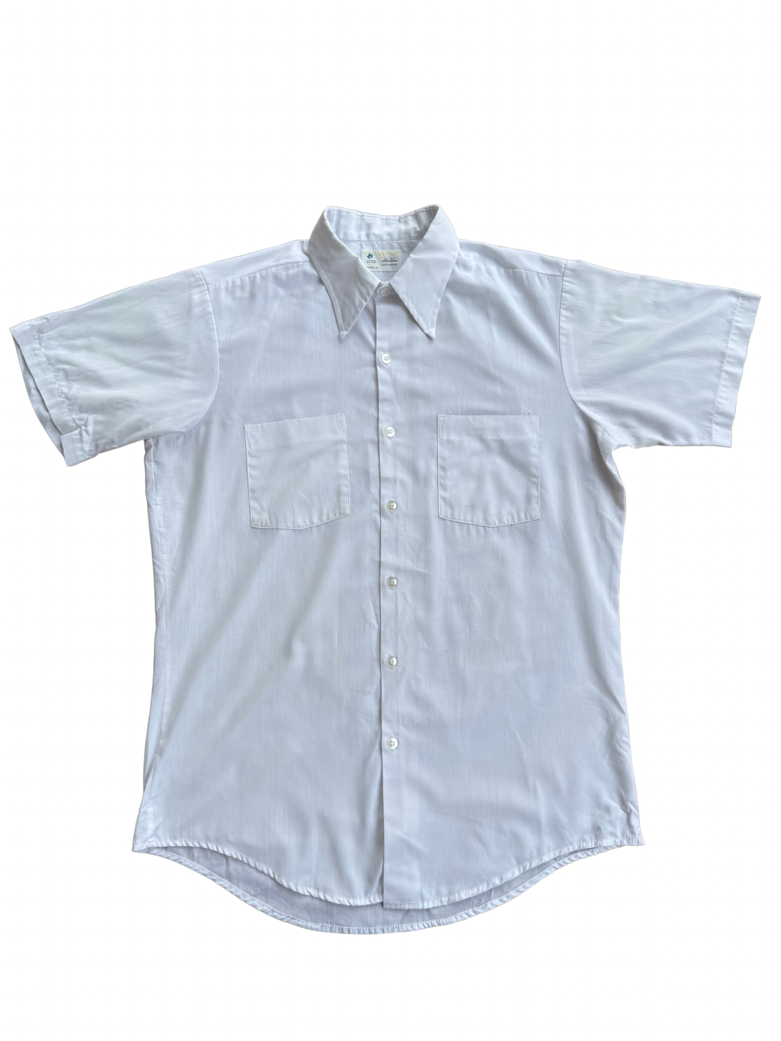 Vintage Riverside Masterbilt short sleeve shirt made in Moultrie, Georgia, USA. Dating from the early 1970s, this piece features a crisp cotton-blend construction with dual chest pockets and wide spearpoint collar, a classic example of mid-century American uniform tailoring.