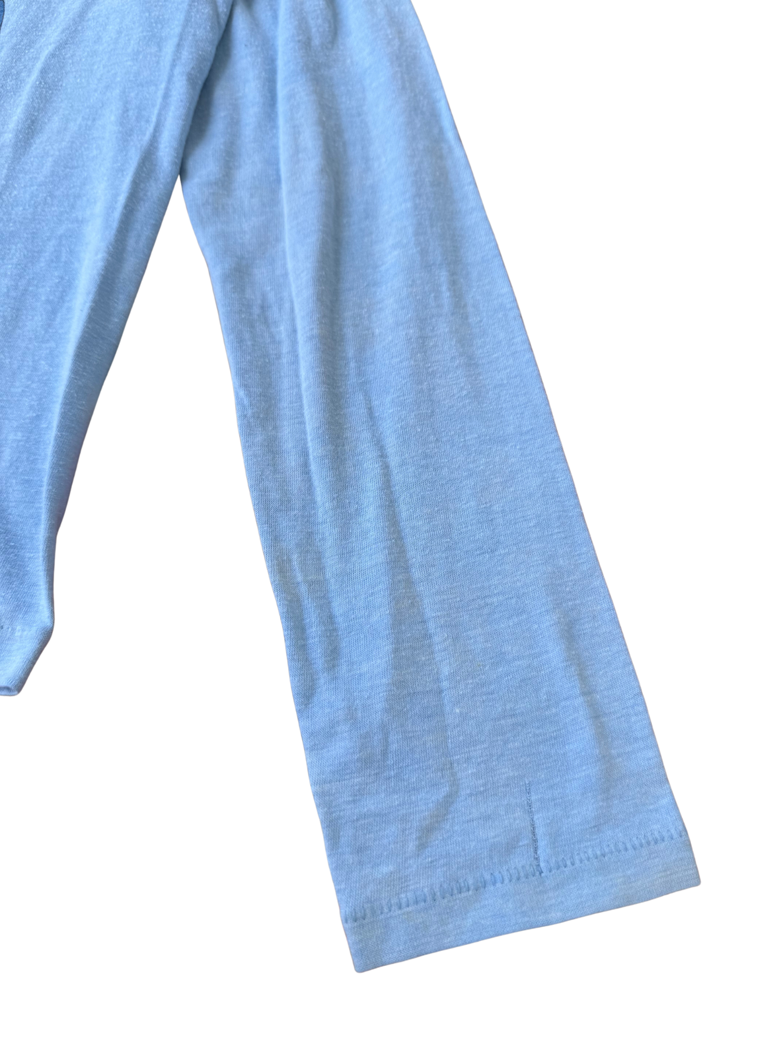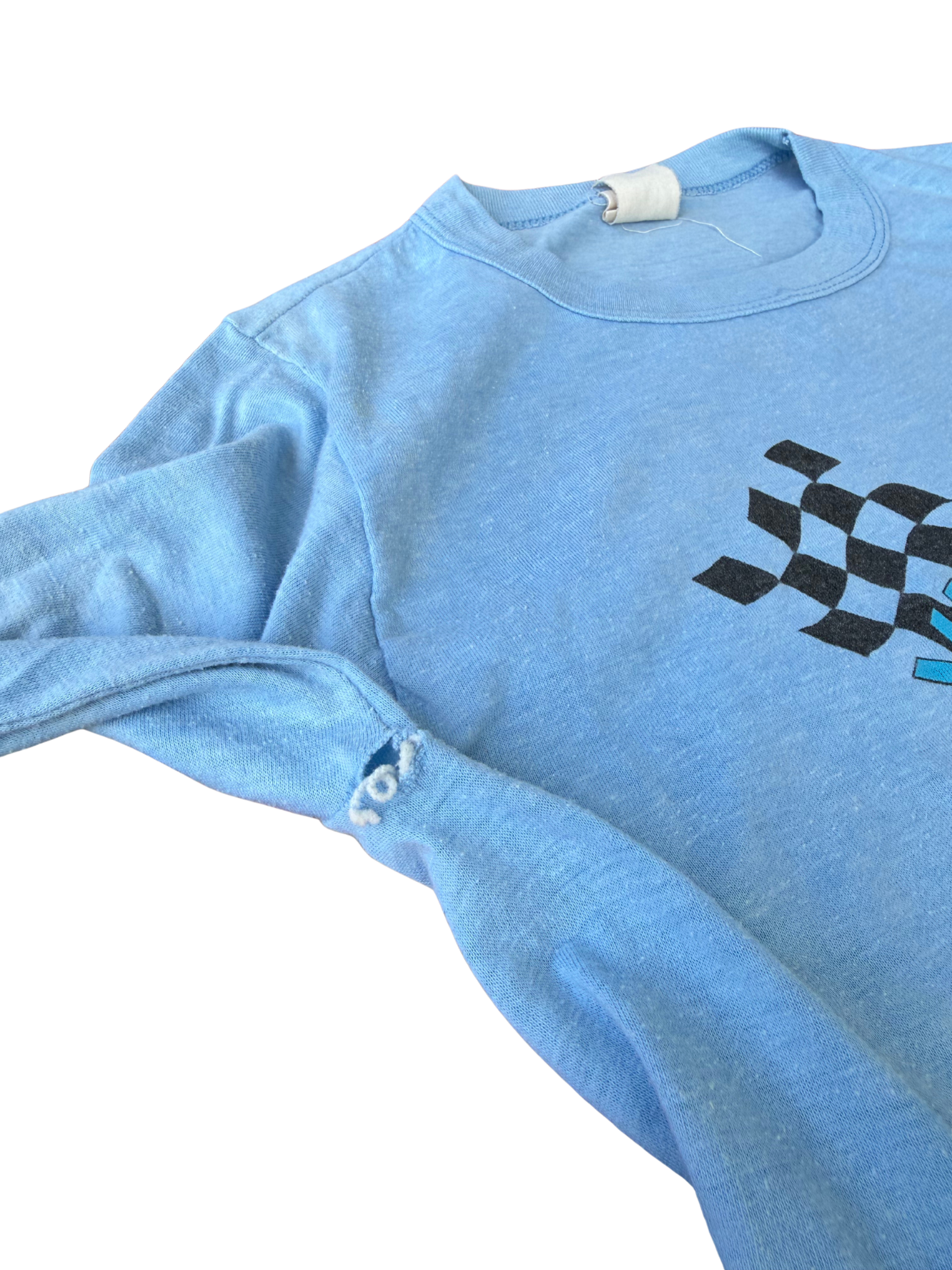 Original late-1970s Sears Boys long sleeve tee featuring “Vantastic Cruising” hot-rod van graphic with checkered flags motif. Made in USA from soft cotton blend in sky-blue colorway. Artwork signed “Gambon”, reflecting the playful late-70s van-culture craze in American youth fashion. Lightweight, naturally faded fabric with perfect vintage drape.