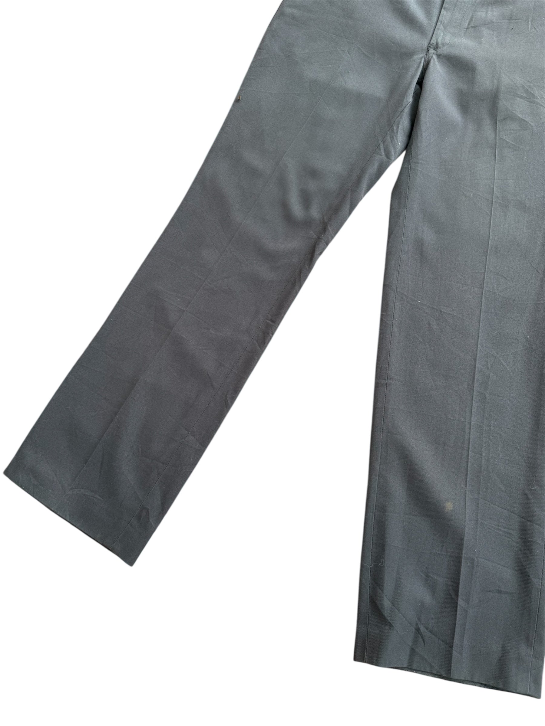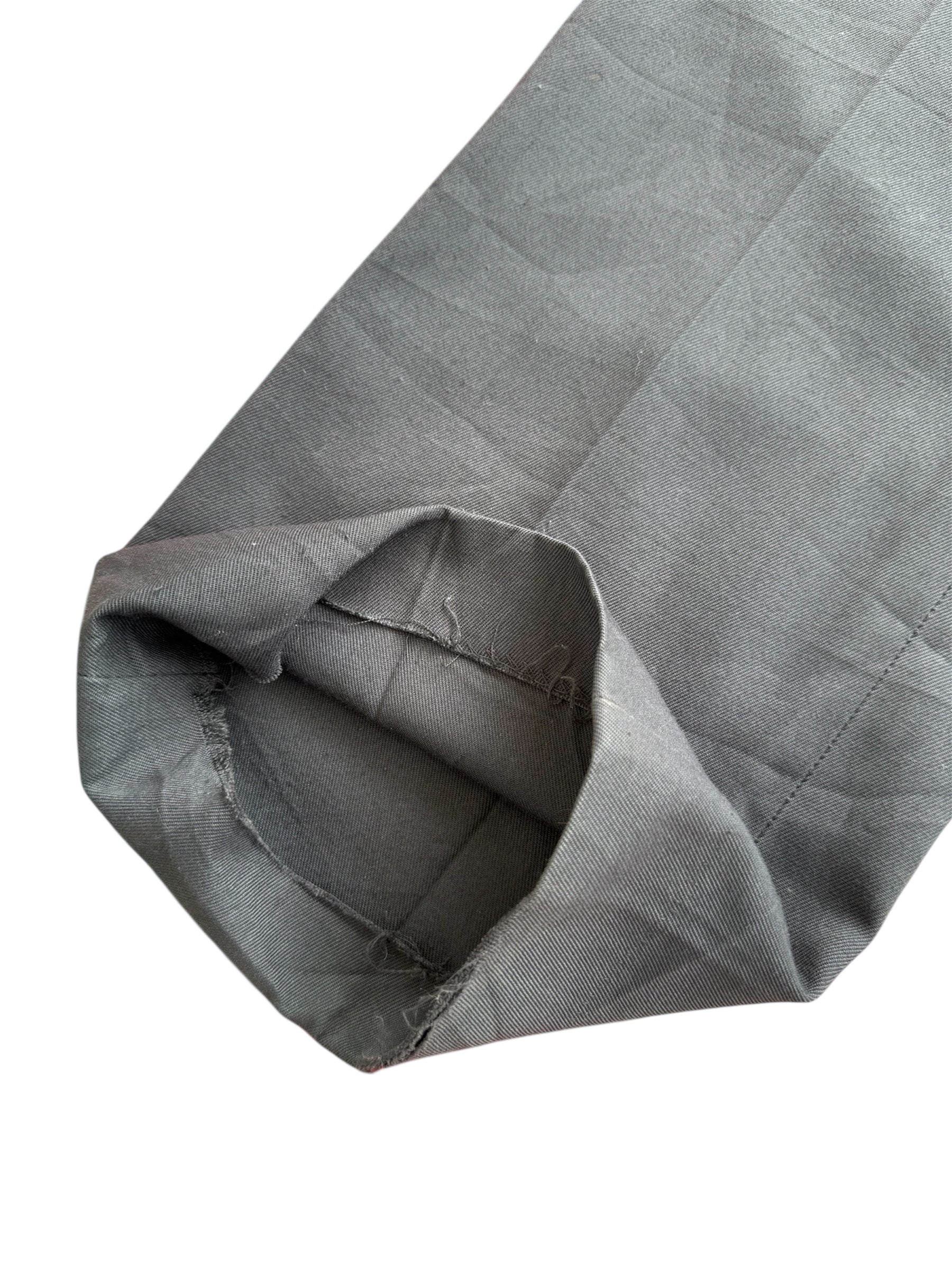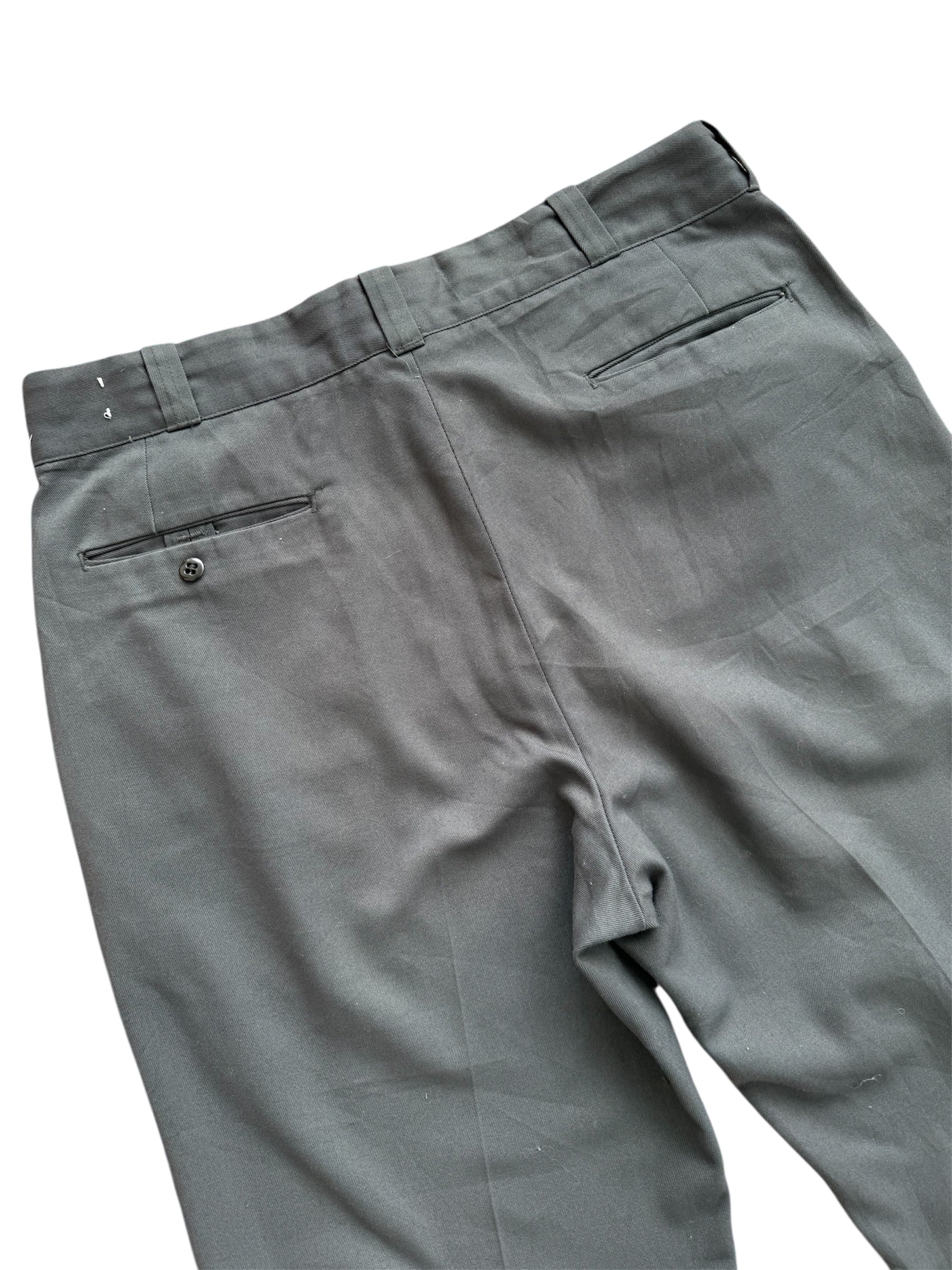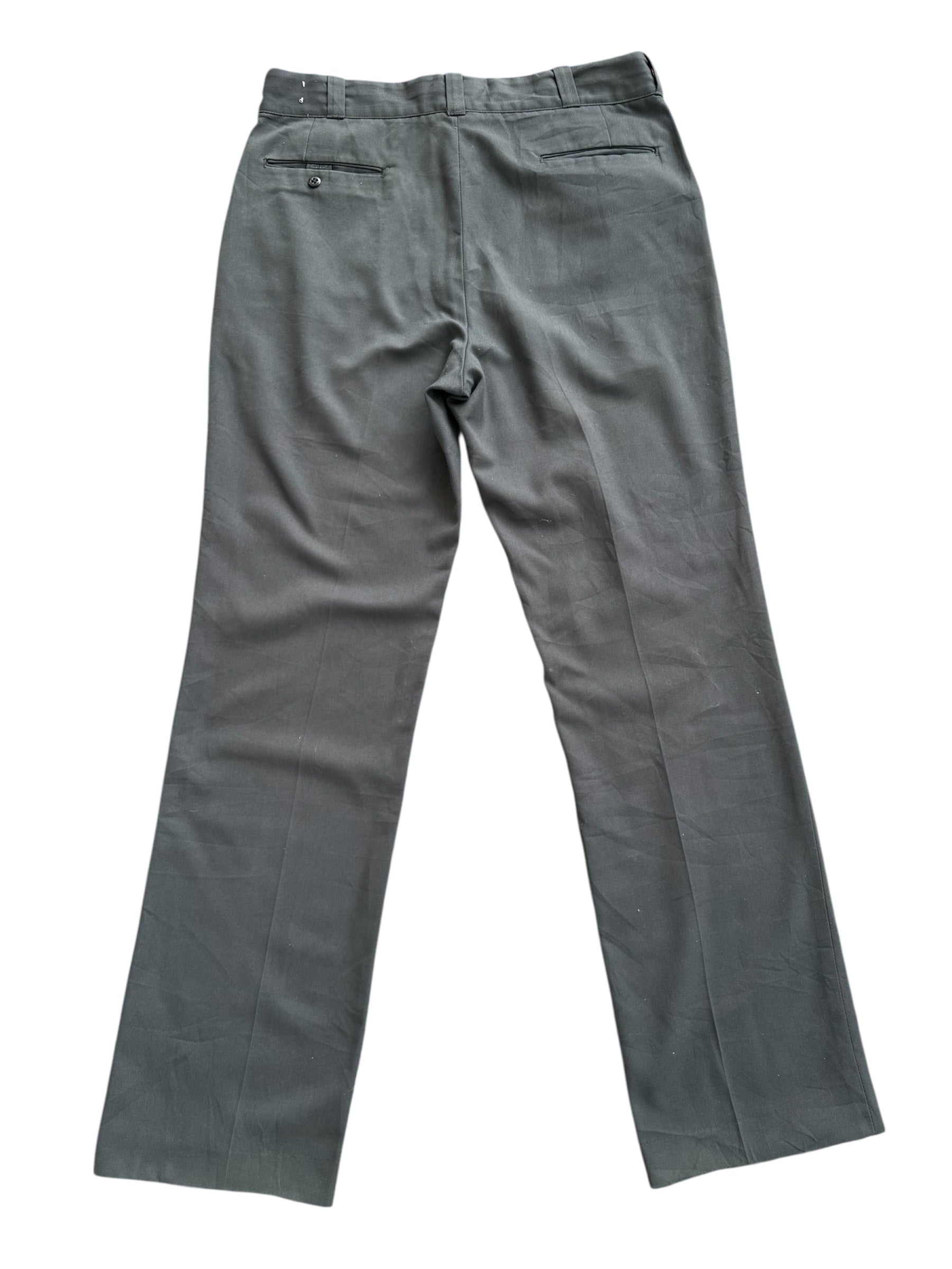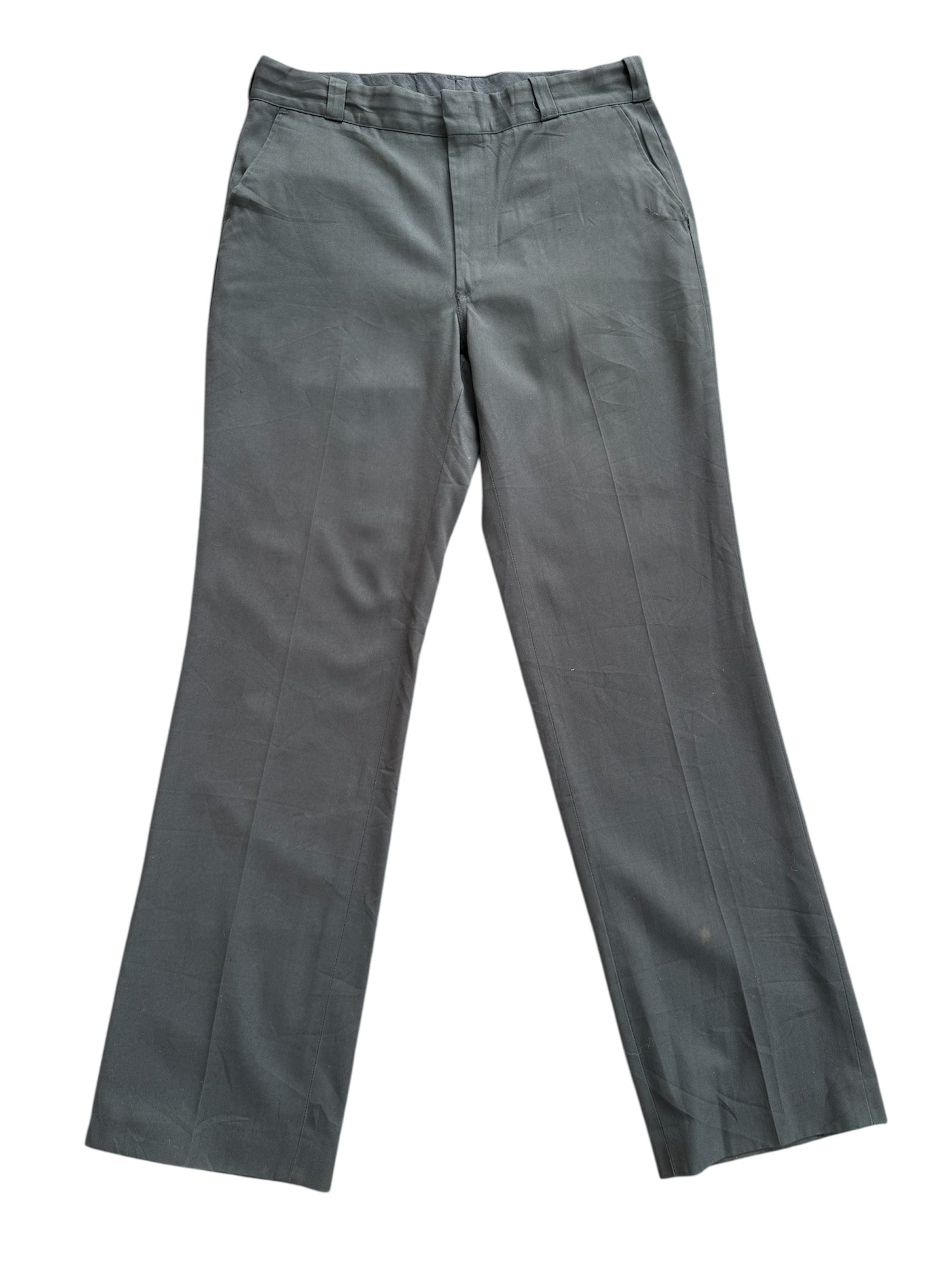 Original Unitog work trousers from the 1970s, made in USA. Constructed from durable poly-rayon twill with a permanent press finish, smooth, midweight fabric ideal for industrial or uniform wear. Features a Talon 42 brass zipper, flat front, and straight-leg cut with dual back pockets. Classic American workwear silhouette with clean tailoring and vintage utility details.