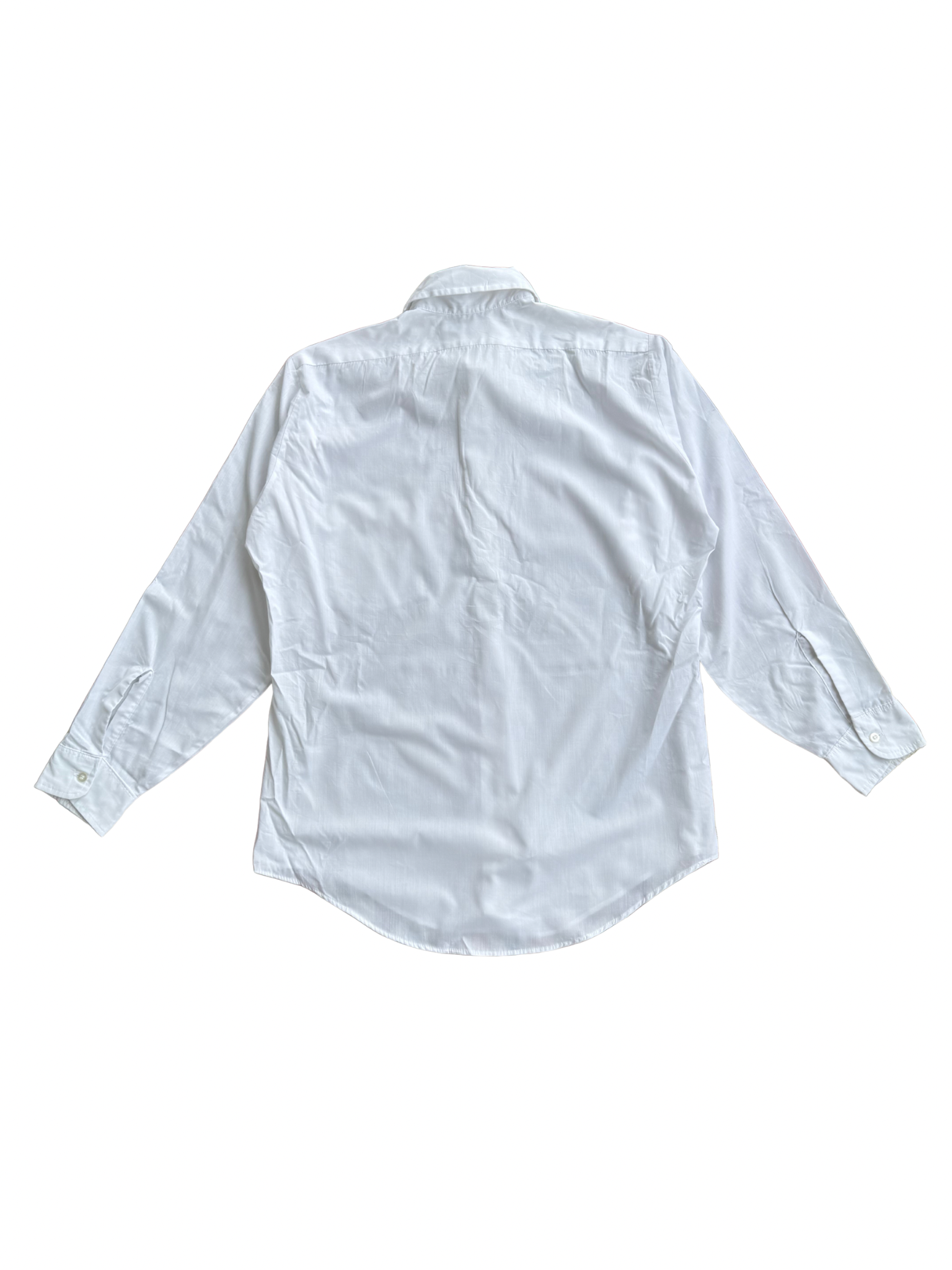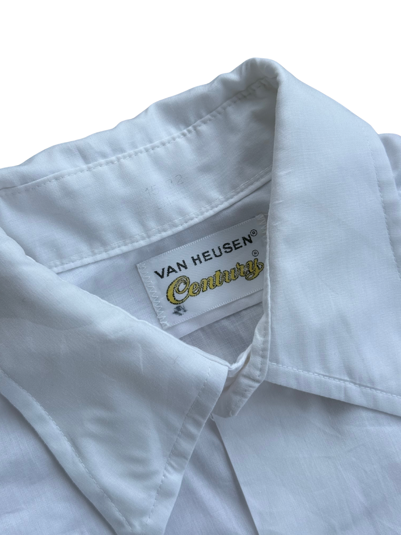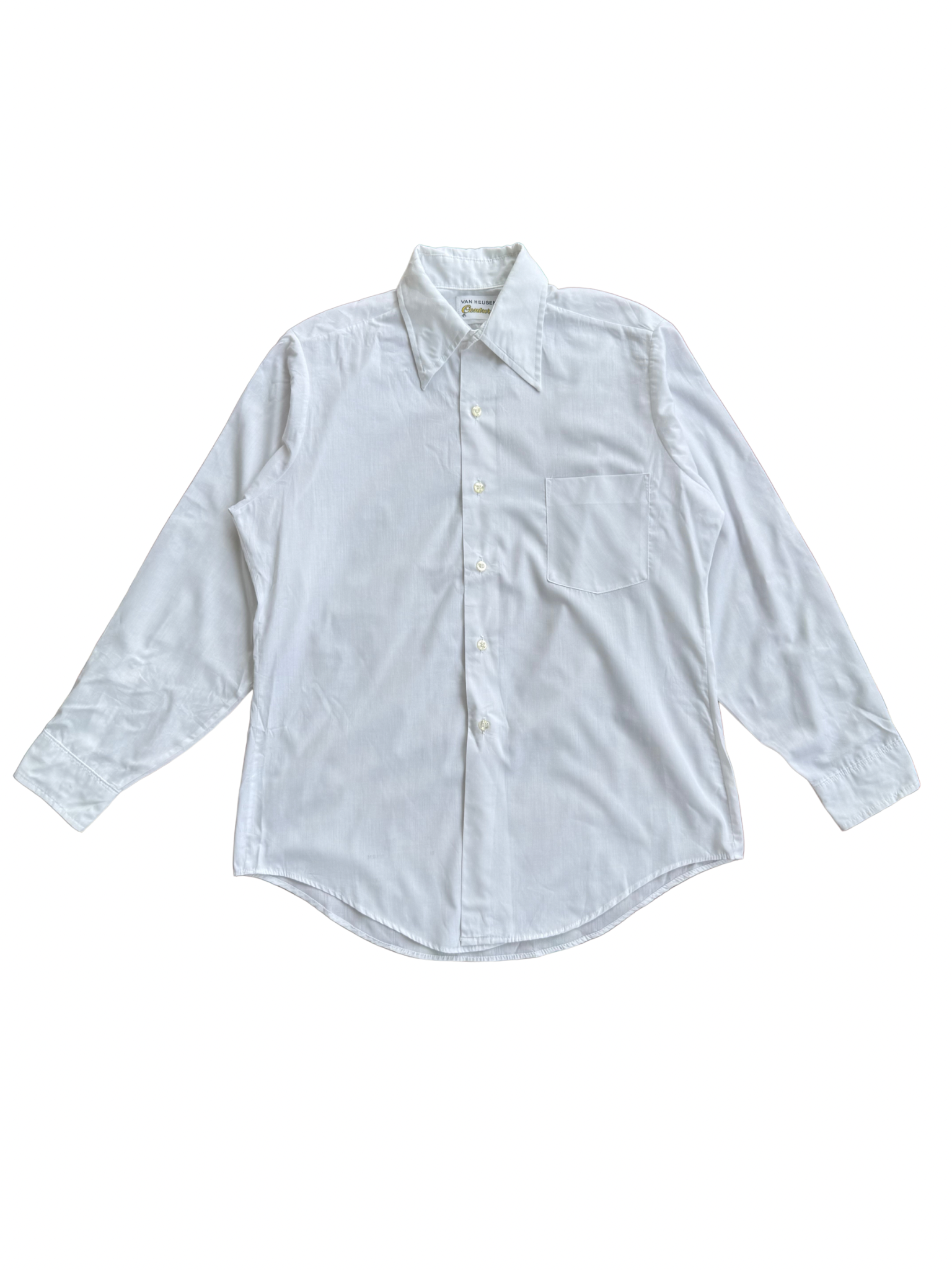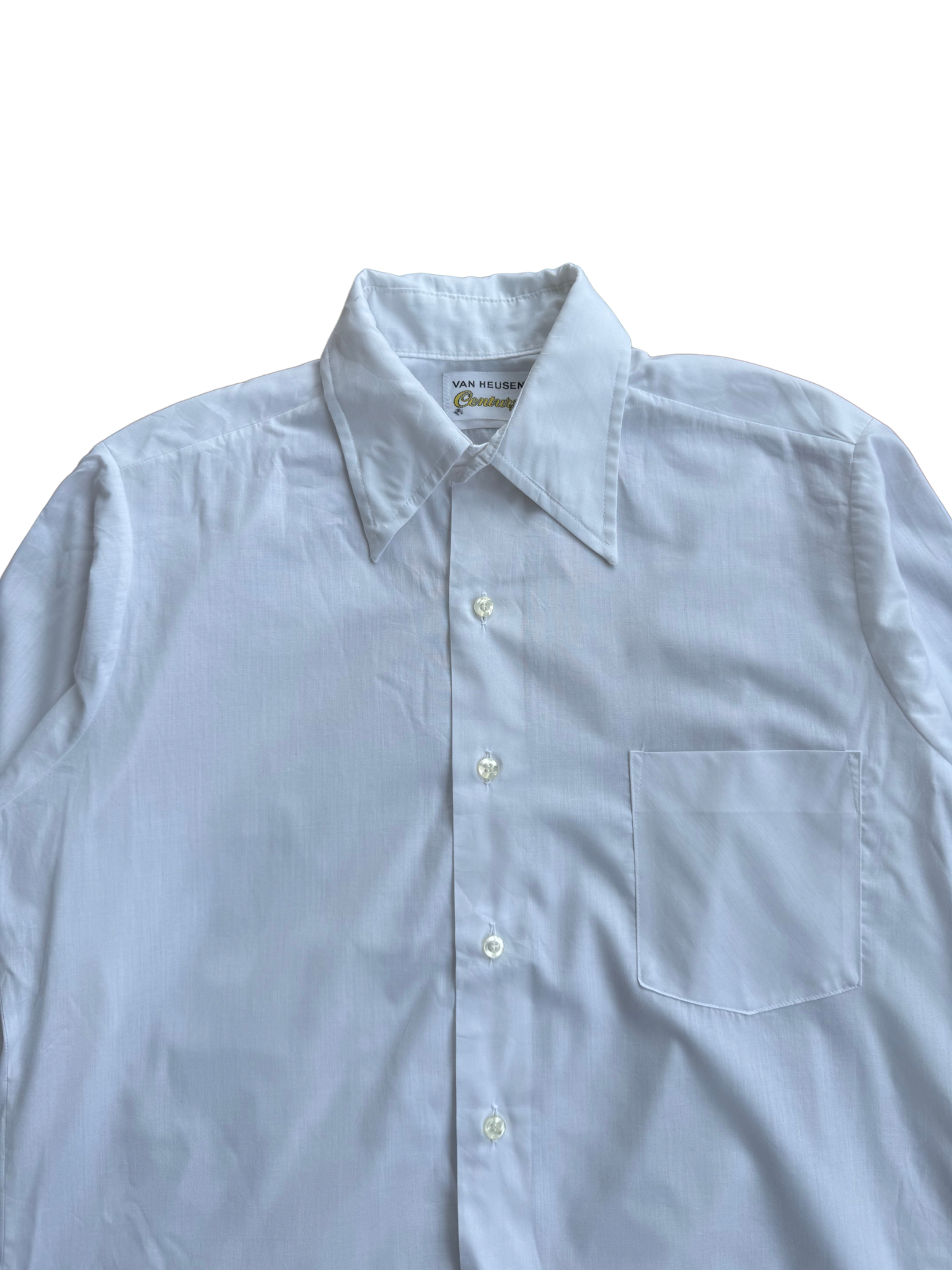 Original Van Heusen Century dress shirt from the 1970s, featuring the brand’s signature spearpoint collar and classic single-pocket design. Made in USA from early poly-cotton blend fabric engineered for easy care and light sheen, part of Van Heusen’s revolutionary Century Collection, known for wrinkle-resistant comfort and crisp structure.