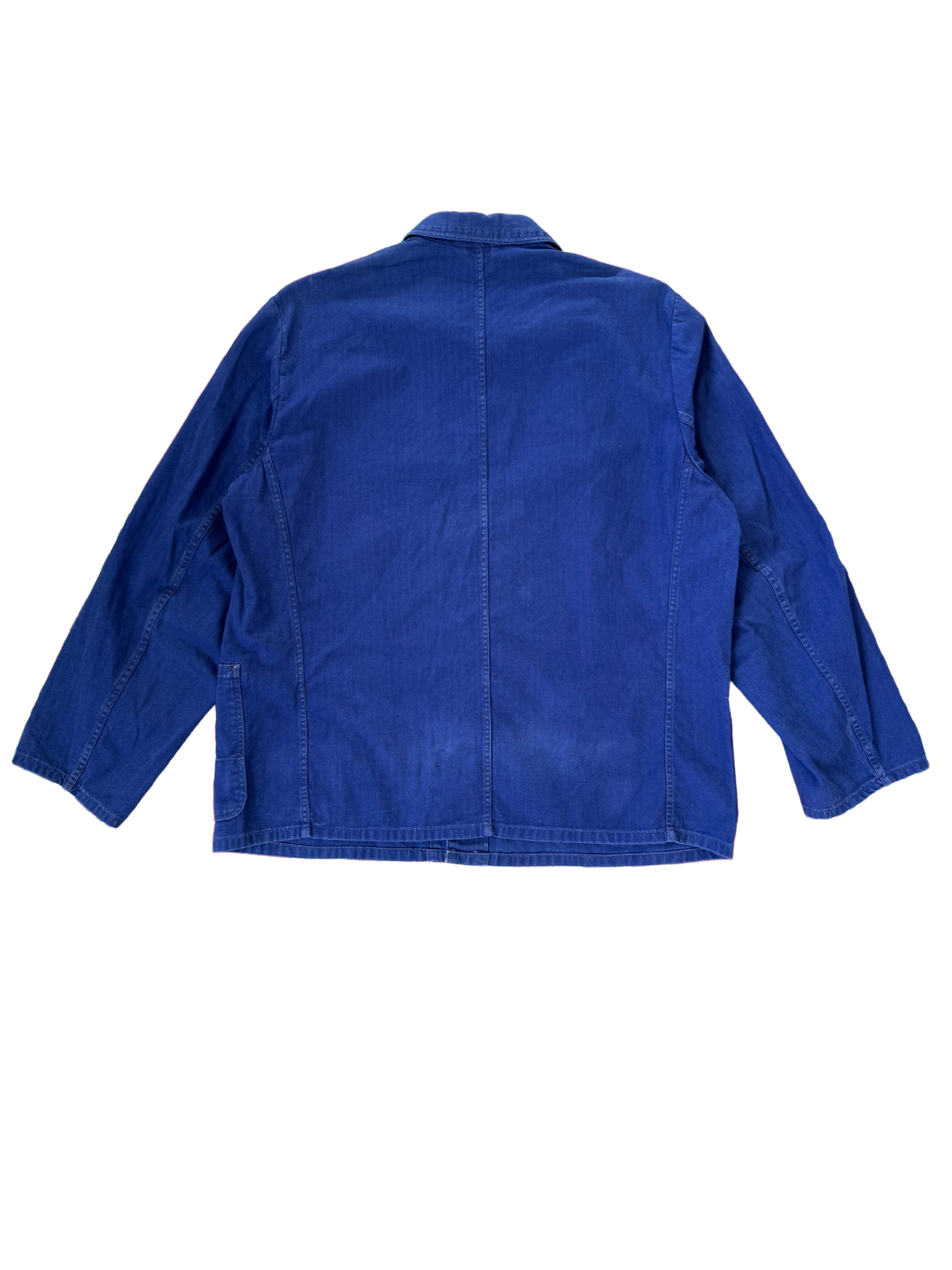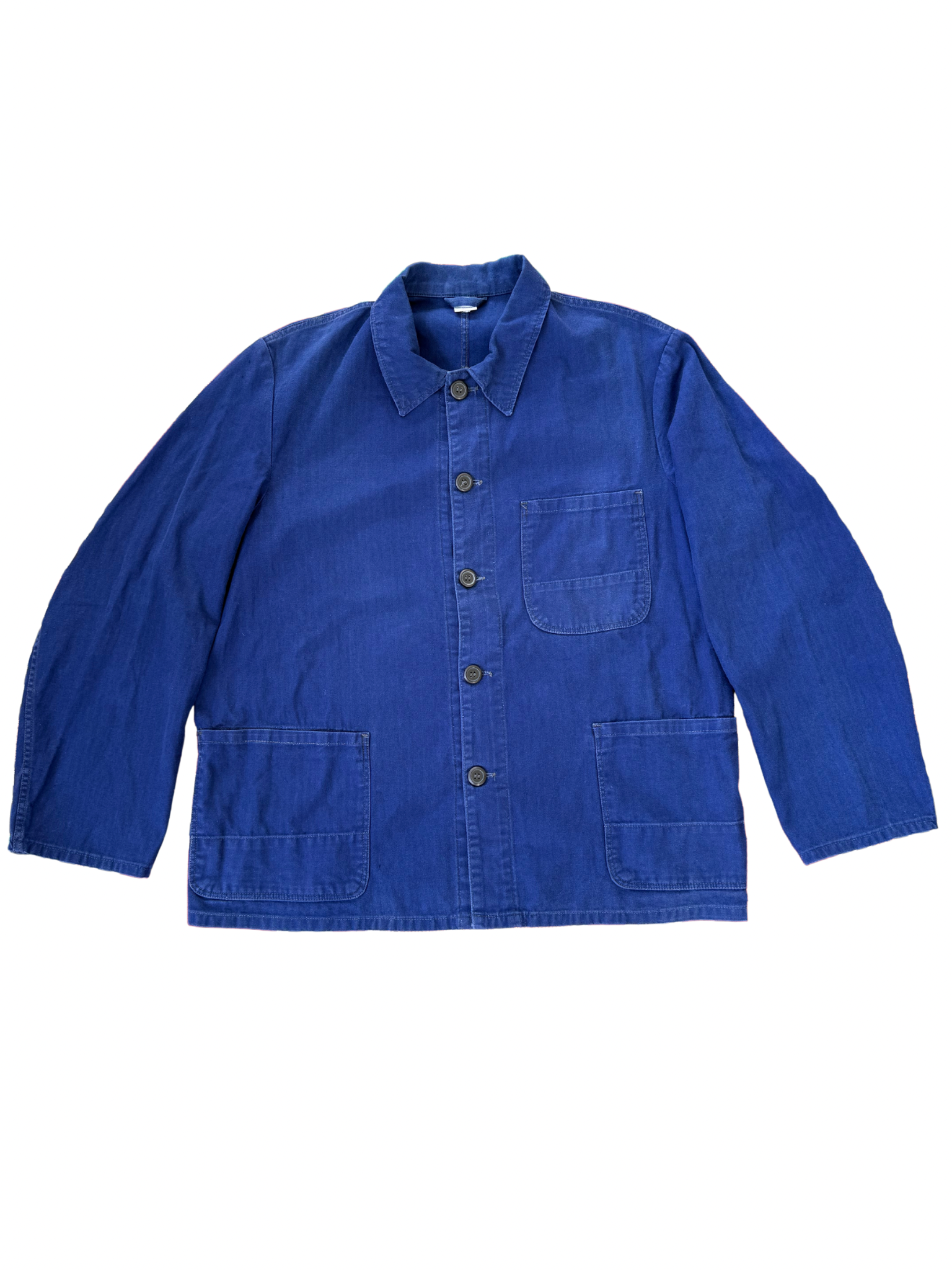 Original West German workwear chore jacket in deep indigo blue cotton herringbone twill. Features three front patch pockets, simple 4-button closure, and sturdy construction with Sanforized cotton to prevent shrinkage. Classic utilitarian design worn by factory and workshop workers in the 1970s–80s. Beautiful soft fade and patina throughout.