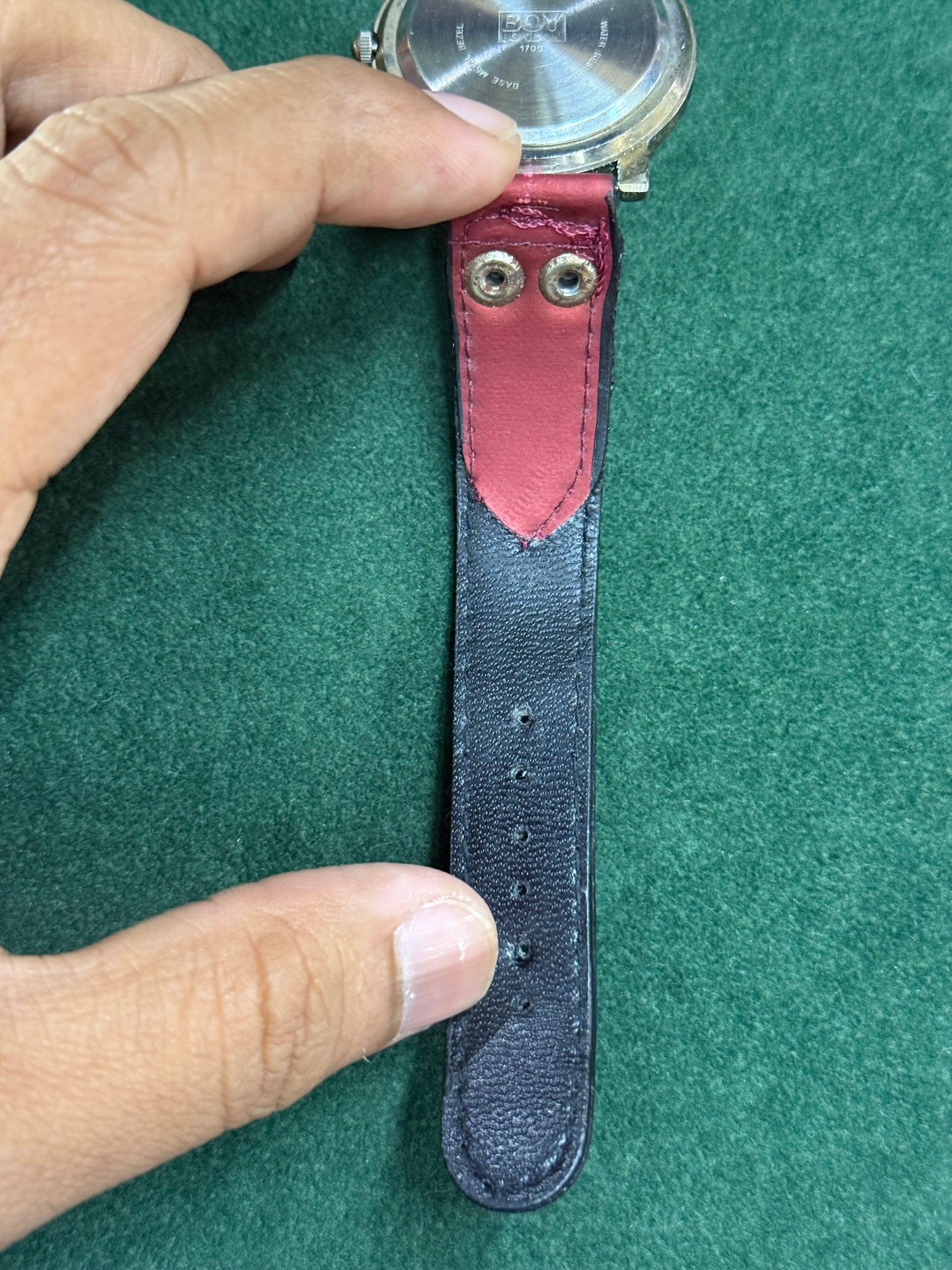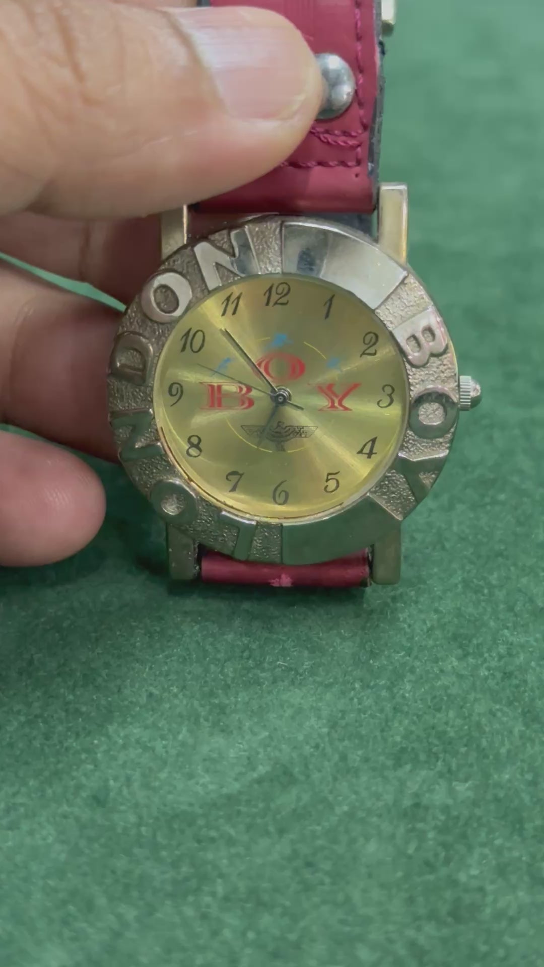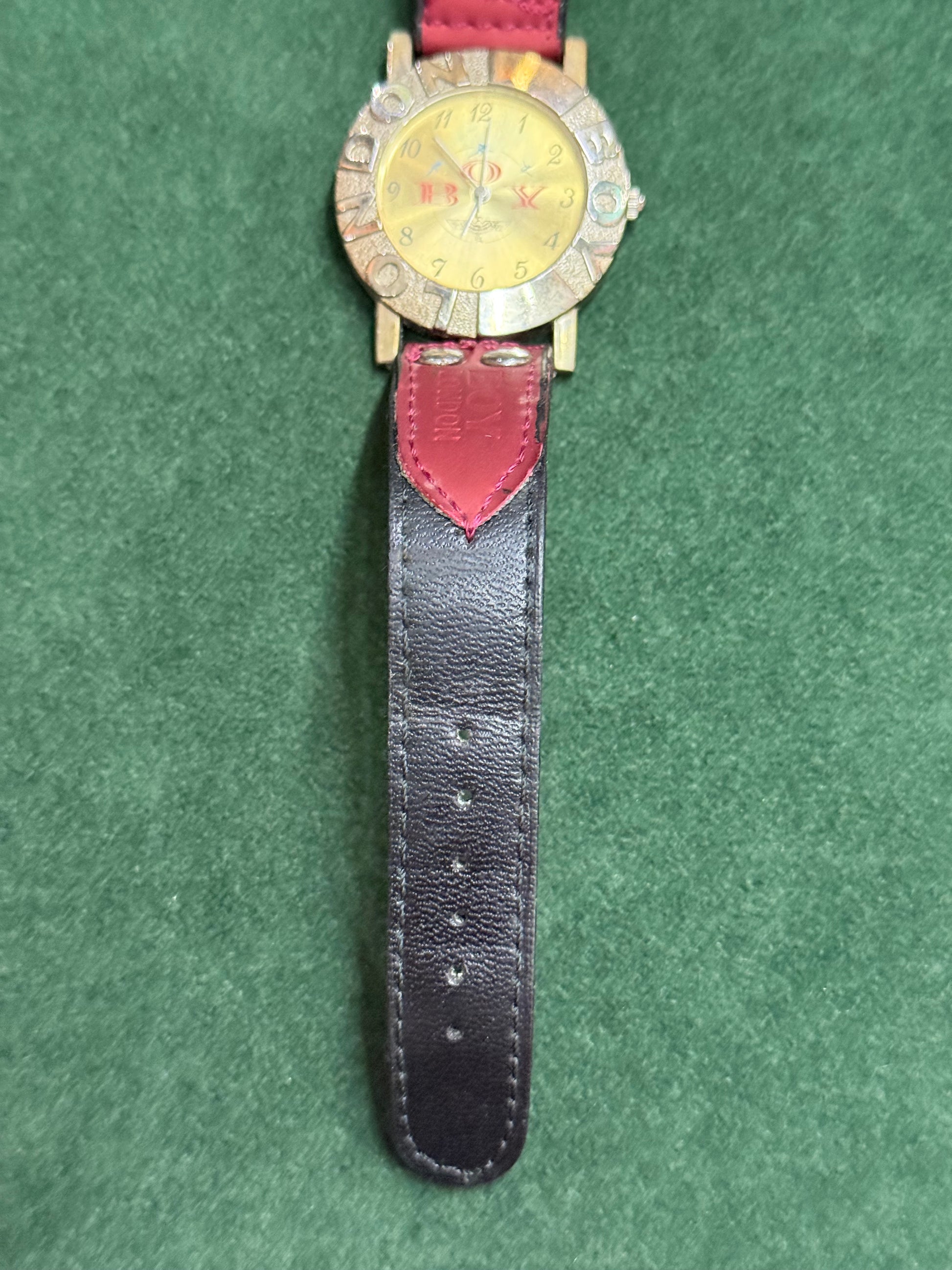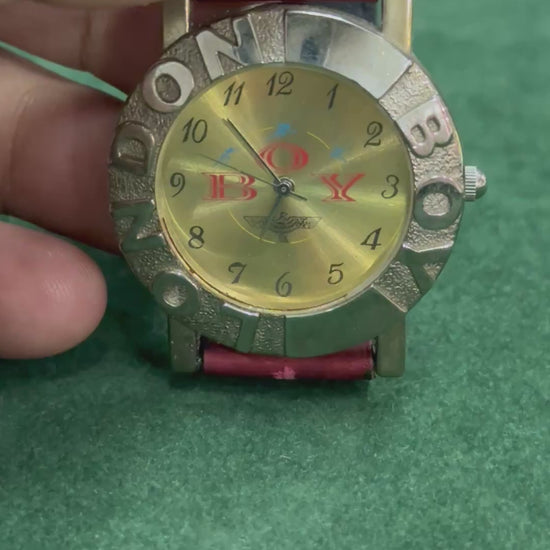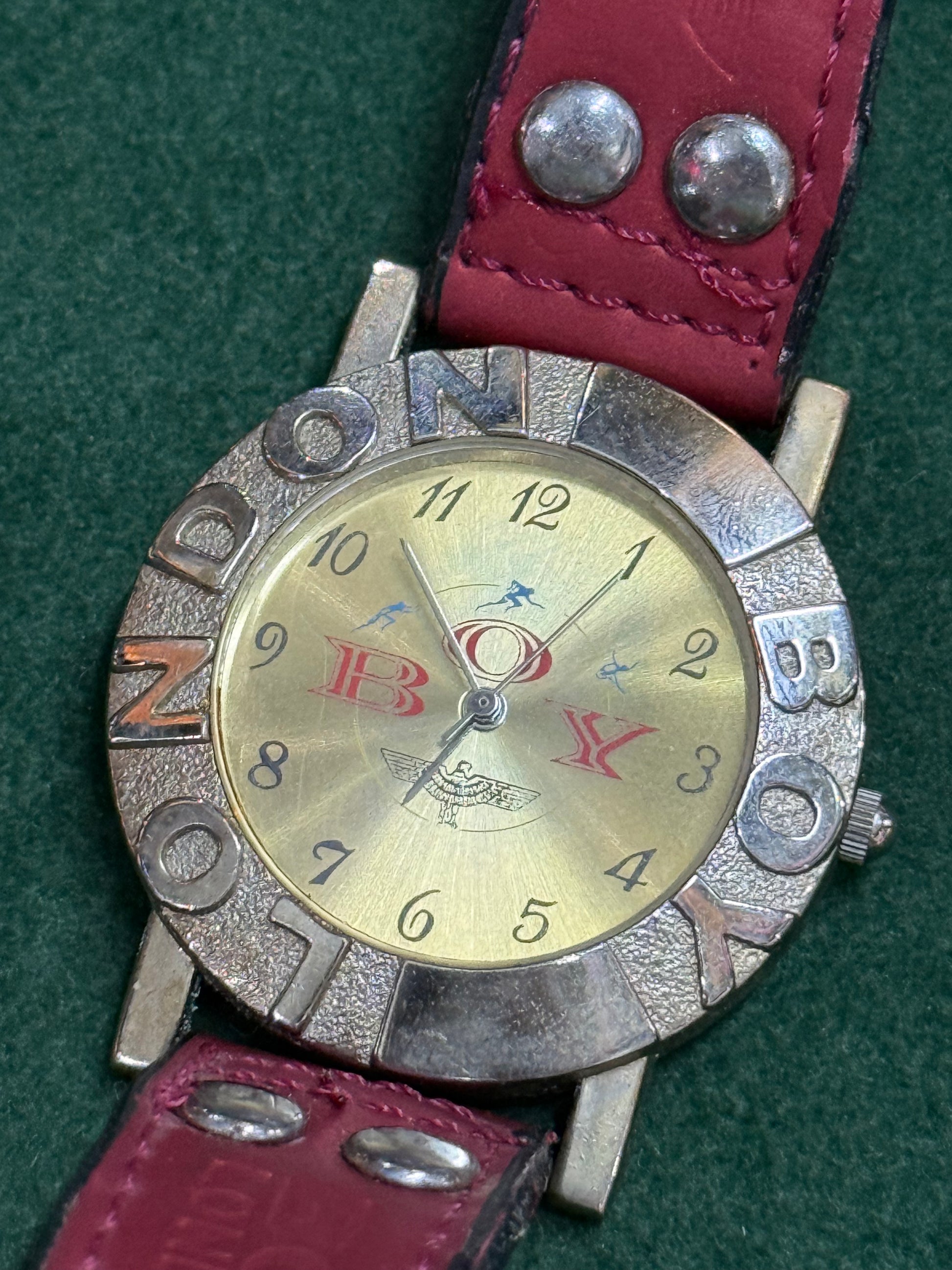 Original BOY London fashion watch from the late 80s/early 90s featuring a 37mm case, punk-styled bezel, gold-tone dial, and original BOY leather strap with BOY buckle. Stainless steel caseback. True vintage BOY London piece from the peak punk era.