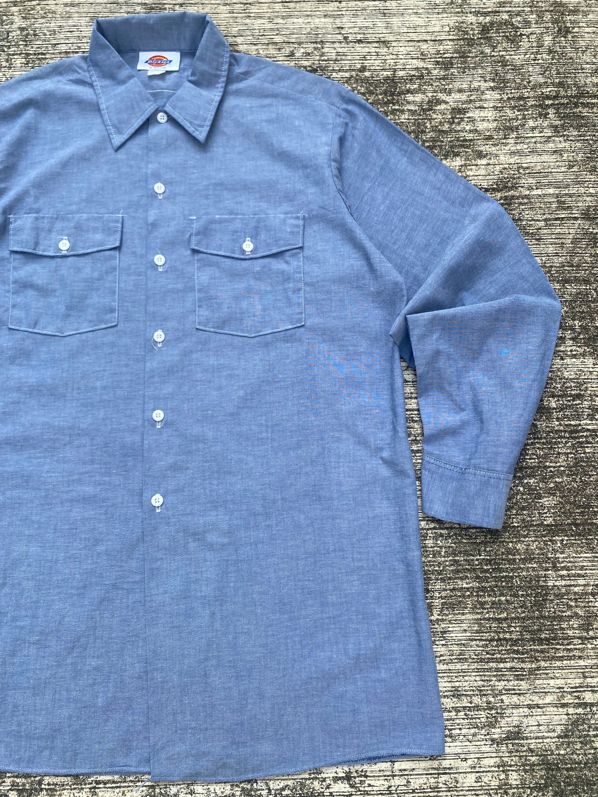 Original Dickies long sleeve chambray work shirt, Made in USA. Features dual chest pockets with button flaps, white contrast stitching, and classic straight hem cut. Midweight cotton chambray fabric ideal for layering. Late 1980s to early 1990s production based on tag design.