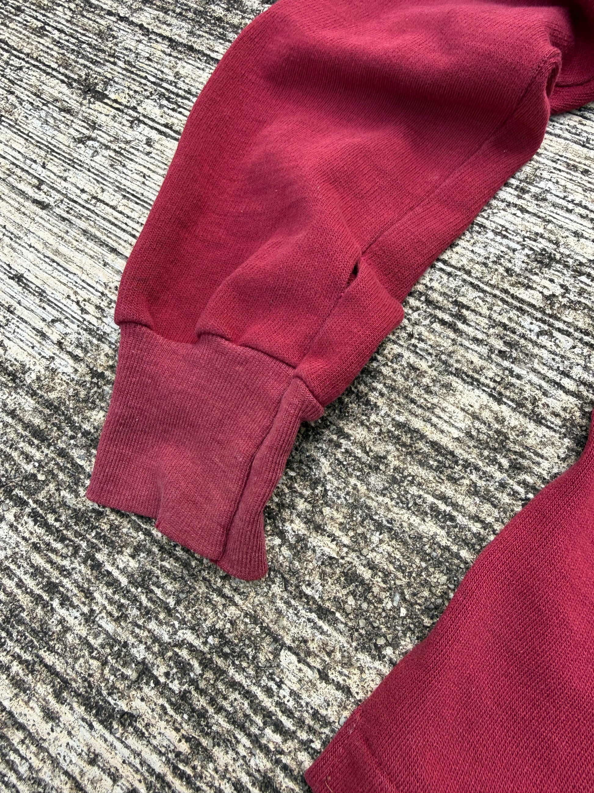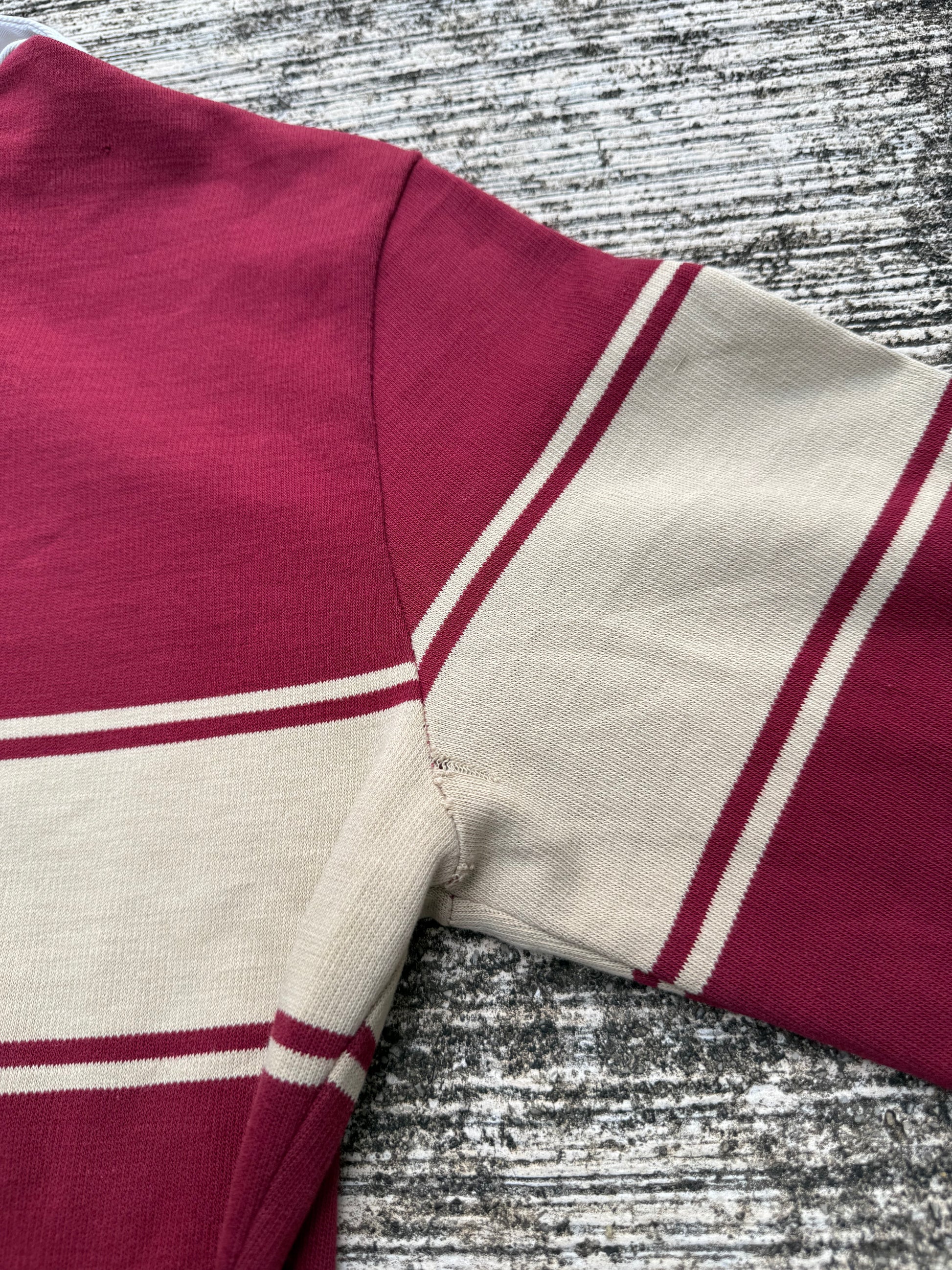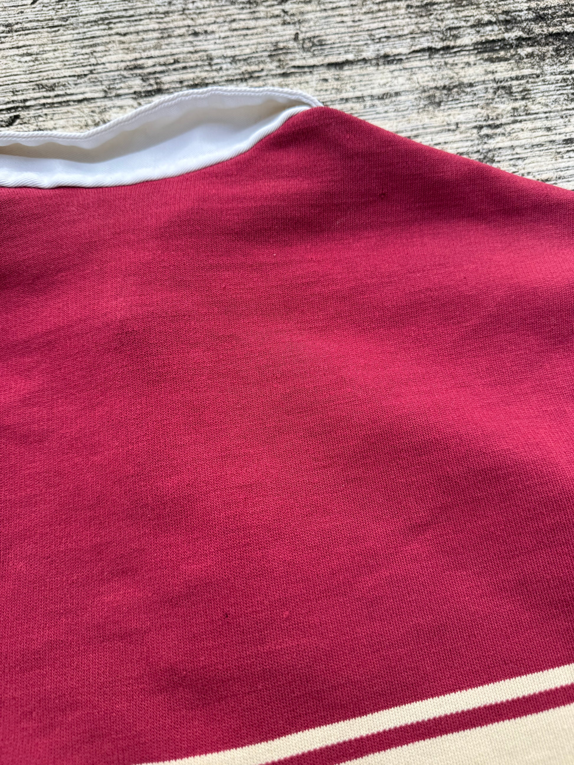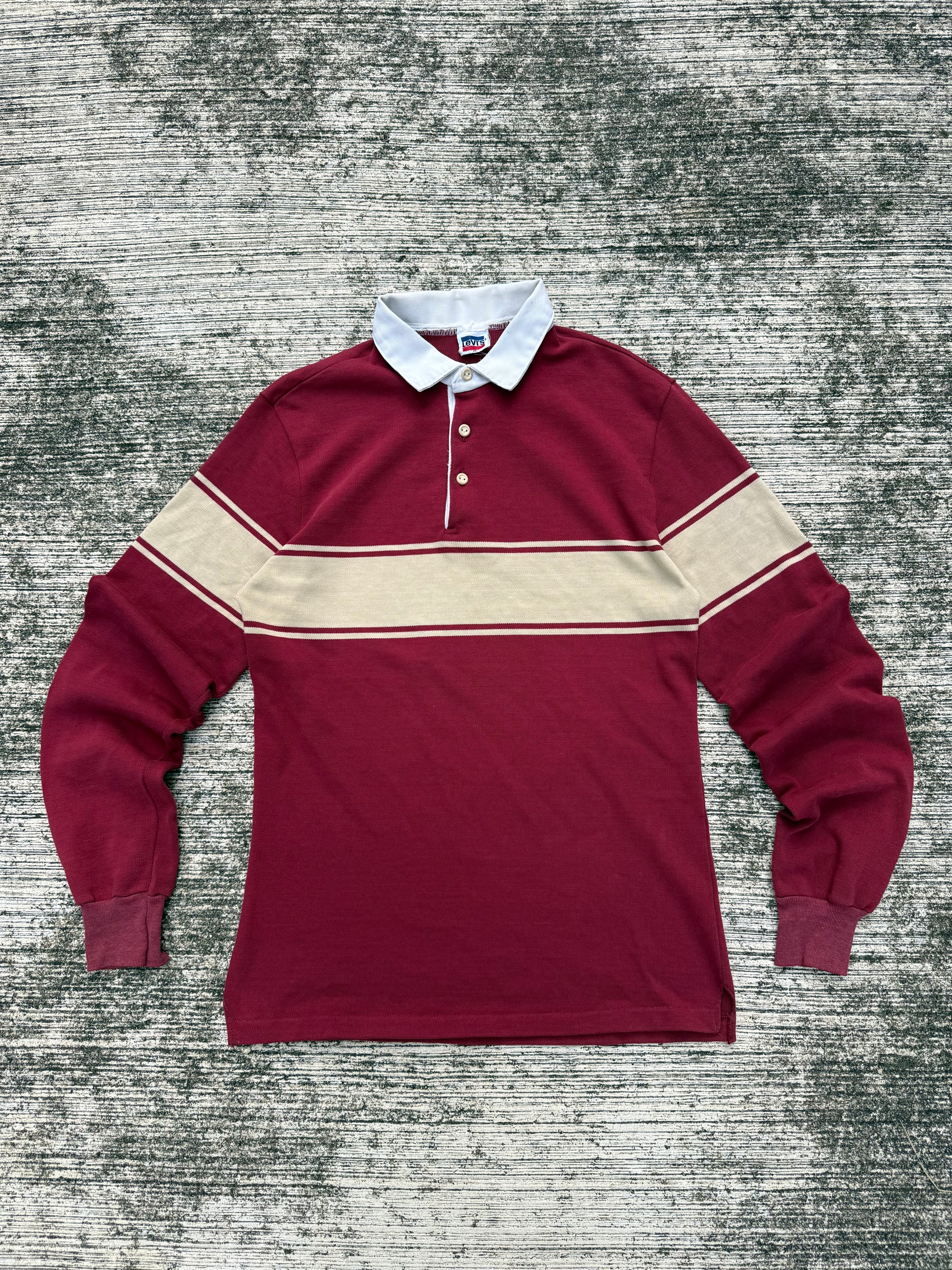 Vintage Levi’s long sleeve rugby shirt. Maroon base with cream stripe, white collar, and 3-button placket. Classic heavy cotton knit.
