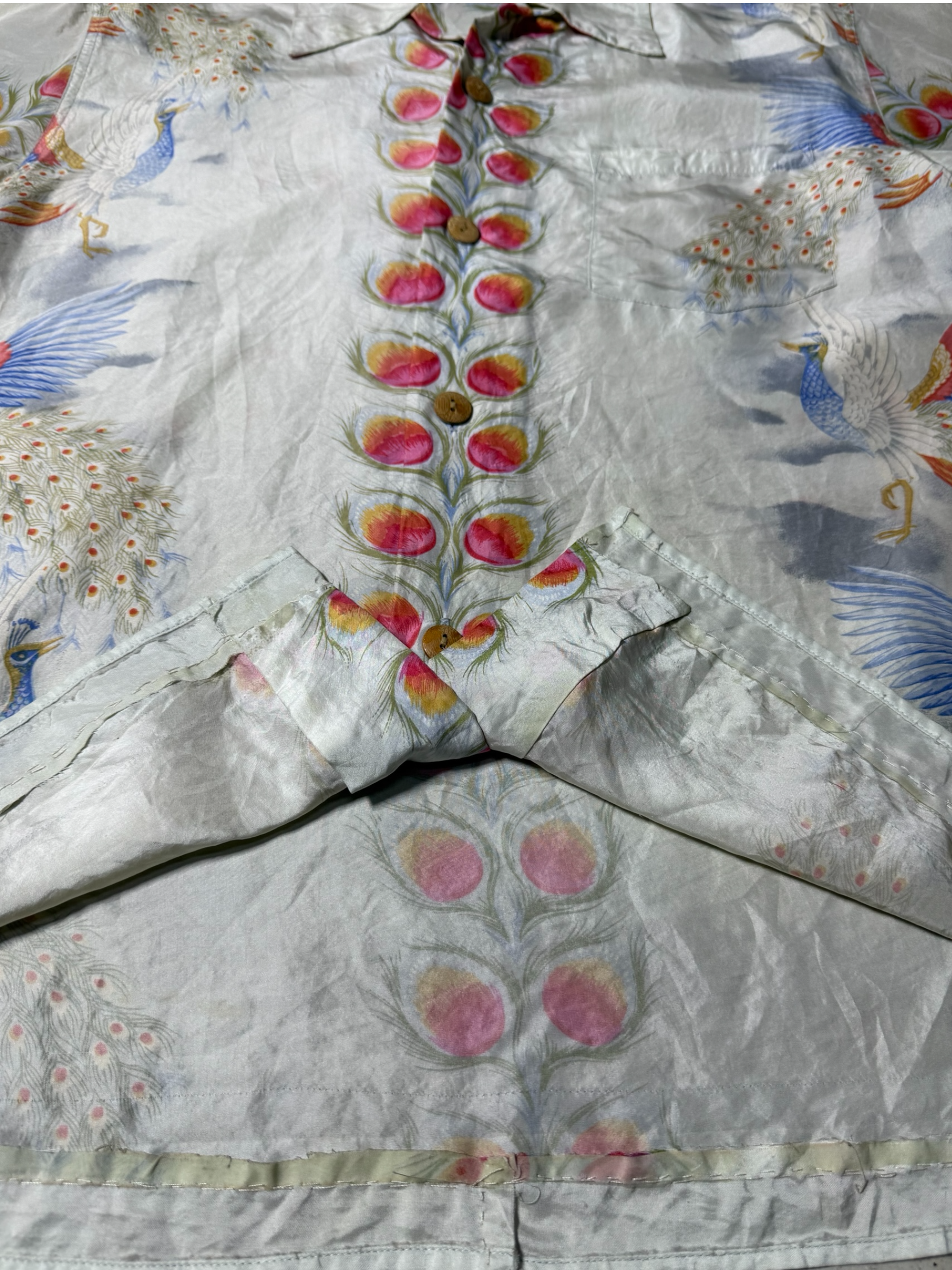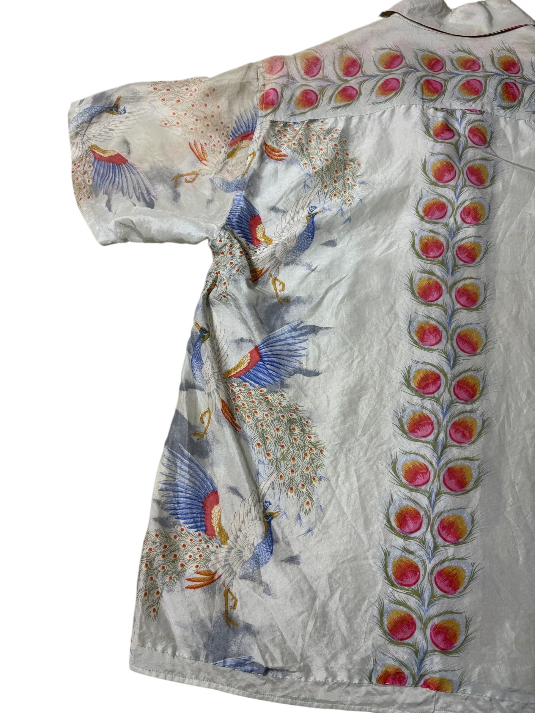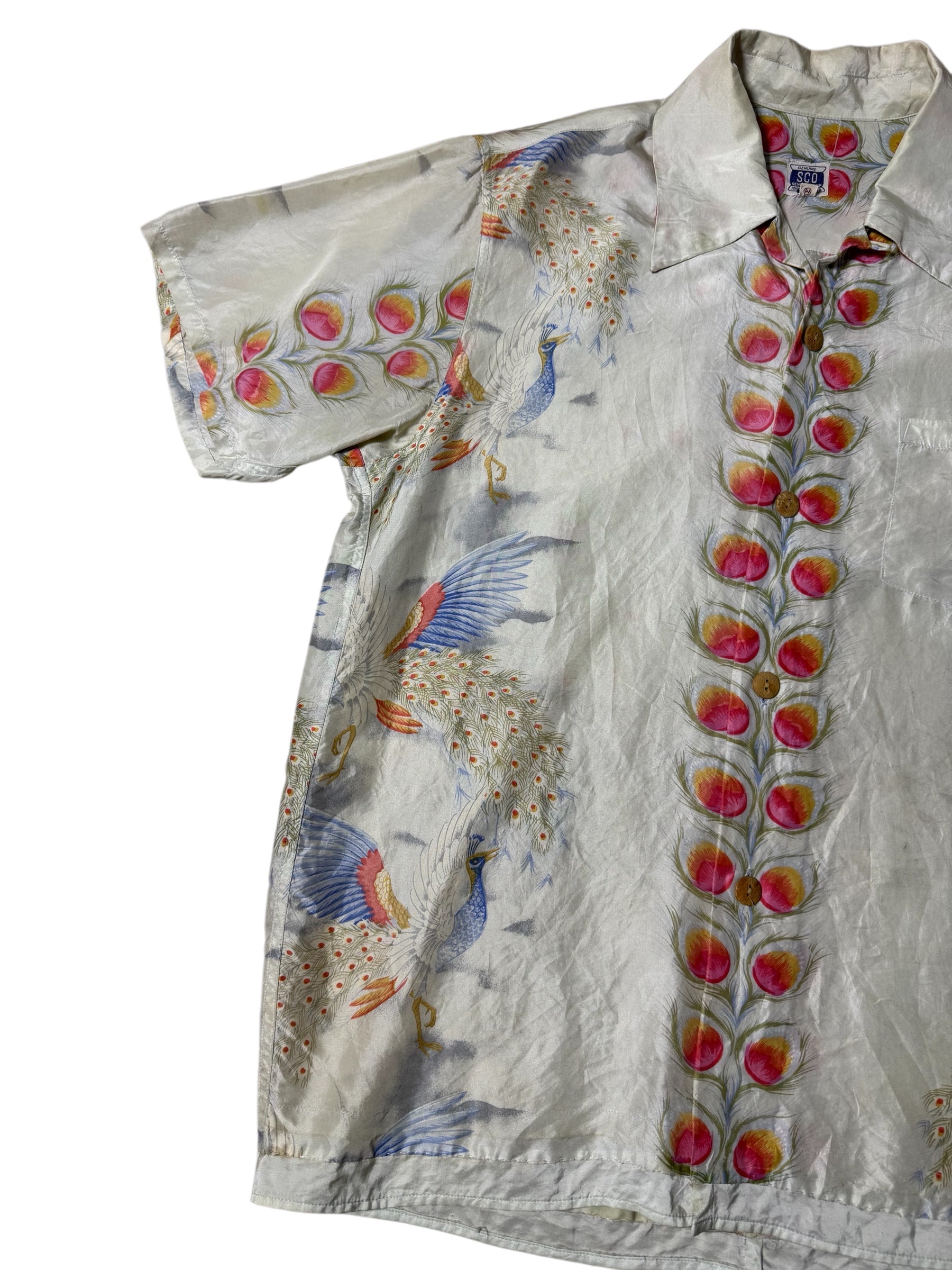 Vintage 1980s SCO Sewing Chop Hawaiian shirt made from soft, lightweight silk. Features a beautiful hand-painted style peacock and feather motif with vibrant pink, blue, and gold tones on a pale silver base. Smooth drape and classic boxy aloha silhouette.