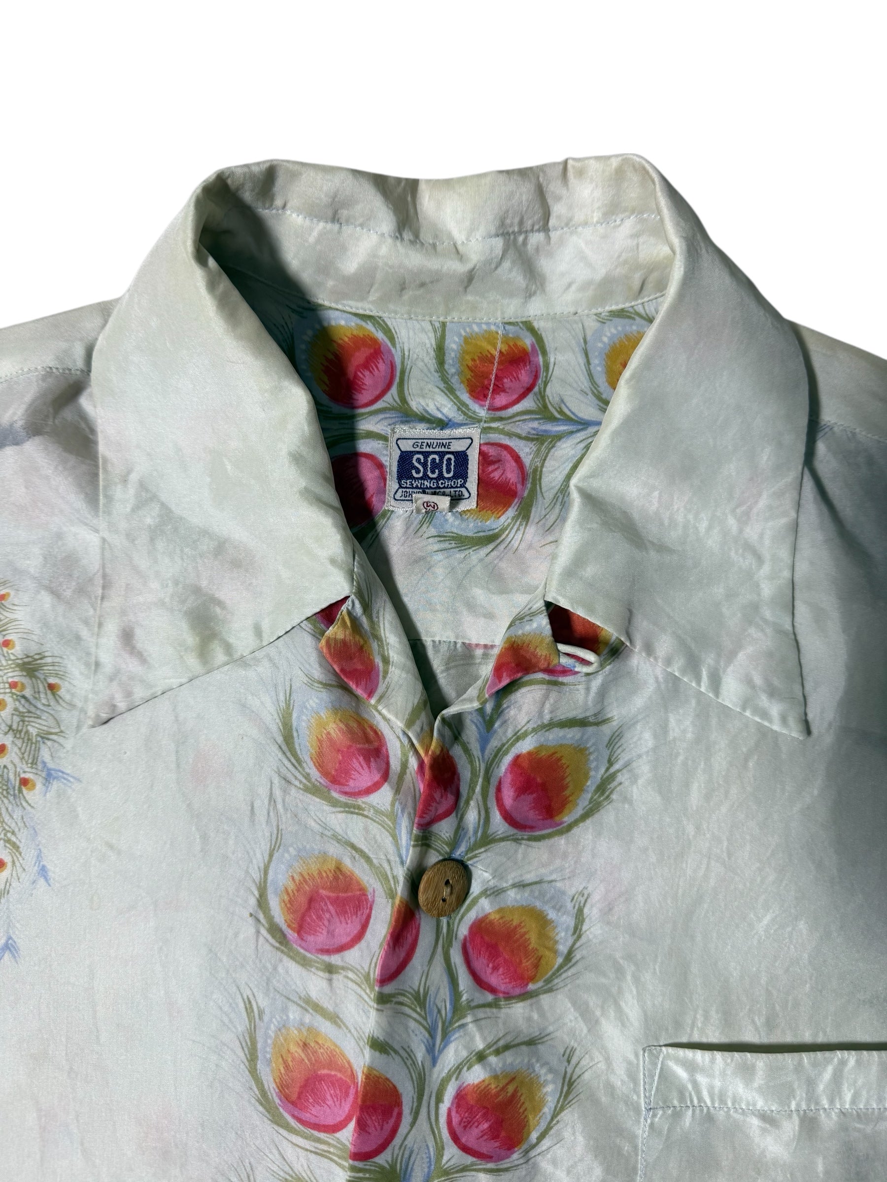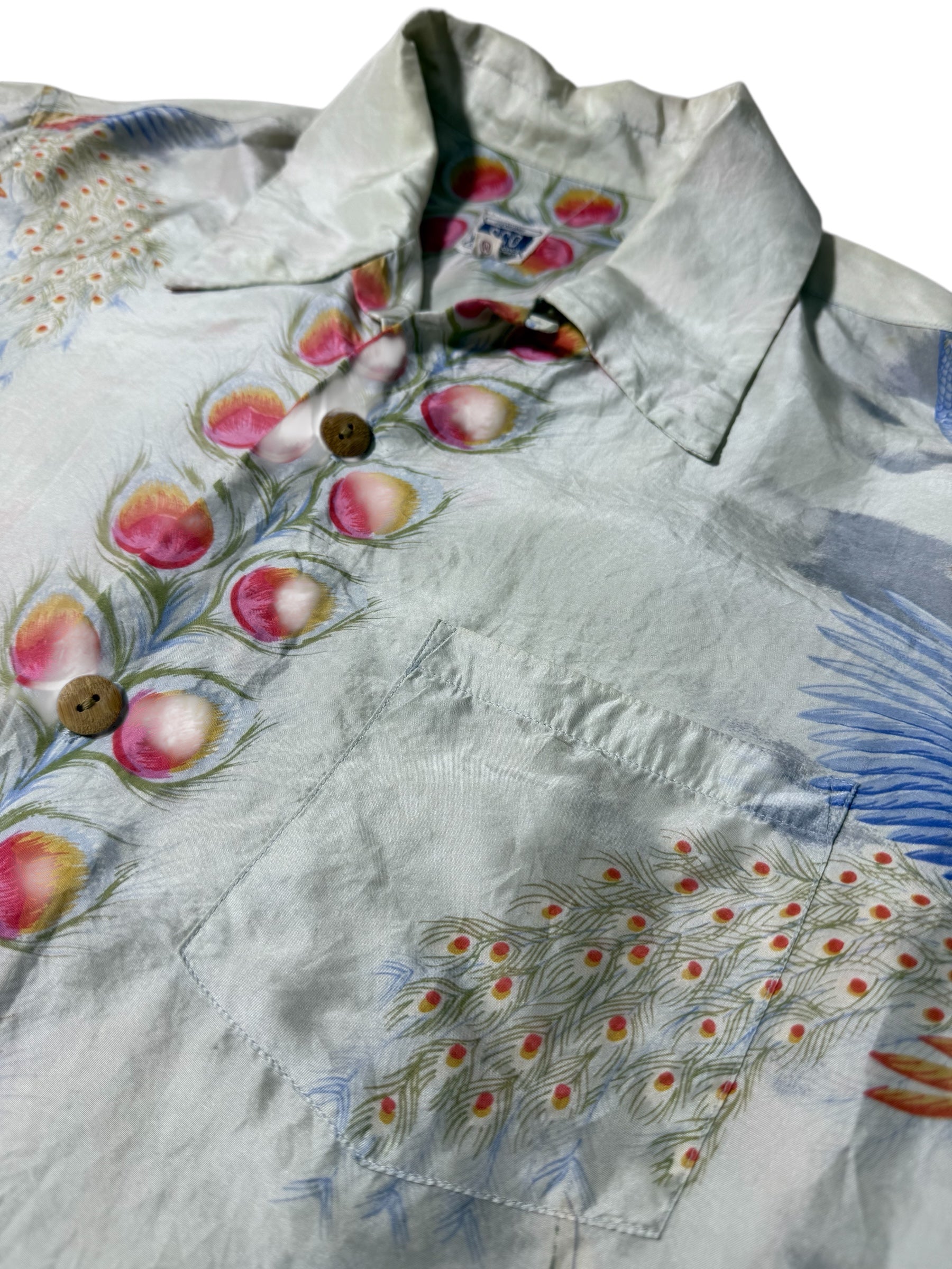 Vintage 1980s–90s SCO Sewing Chop Silk Aloha Shirt Peacock Feather Print
