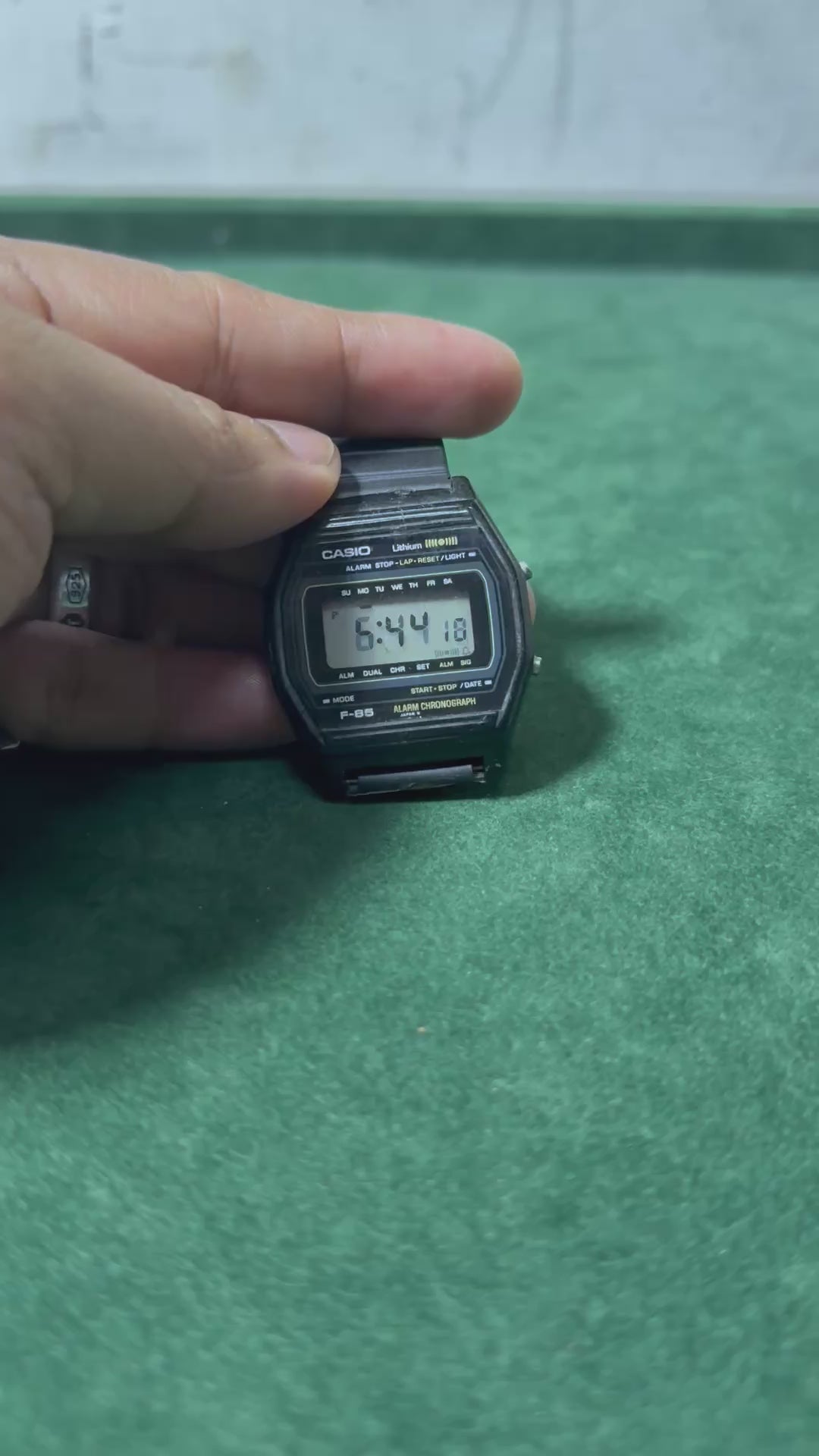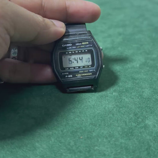 Original vintage Casio F-85 from the early 1980s, one of Casio’s classic slim digital models with alarm/chronograph functions. Housing and buttons still complete, strap original, and the watch still powers on.