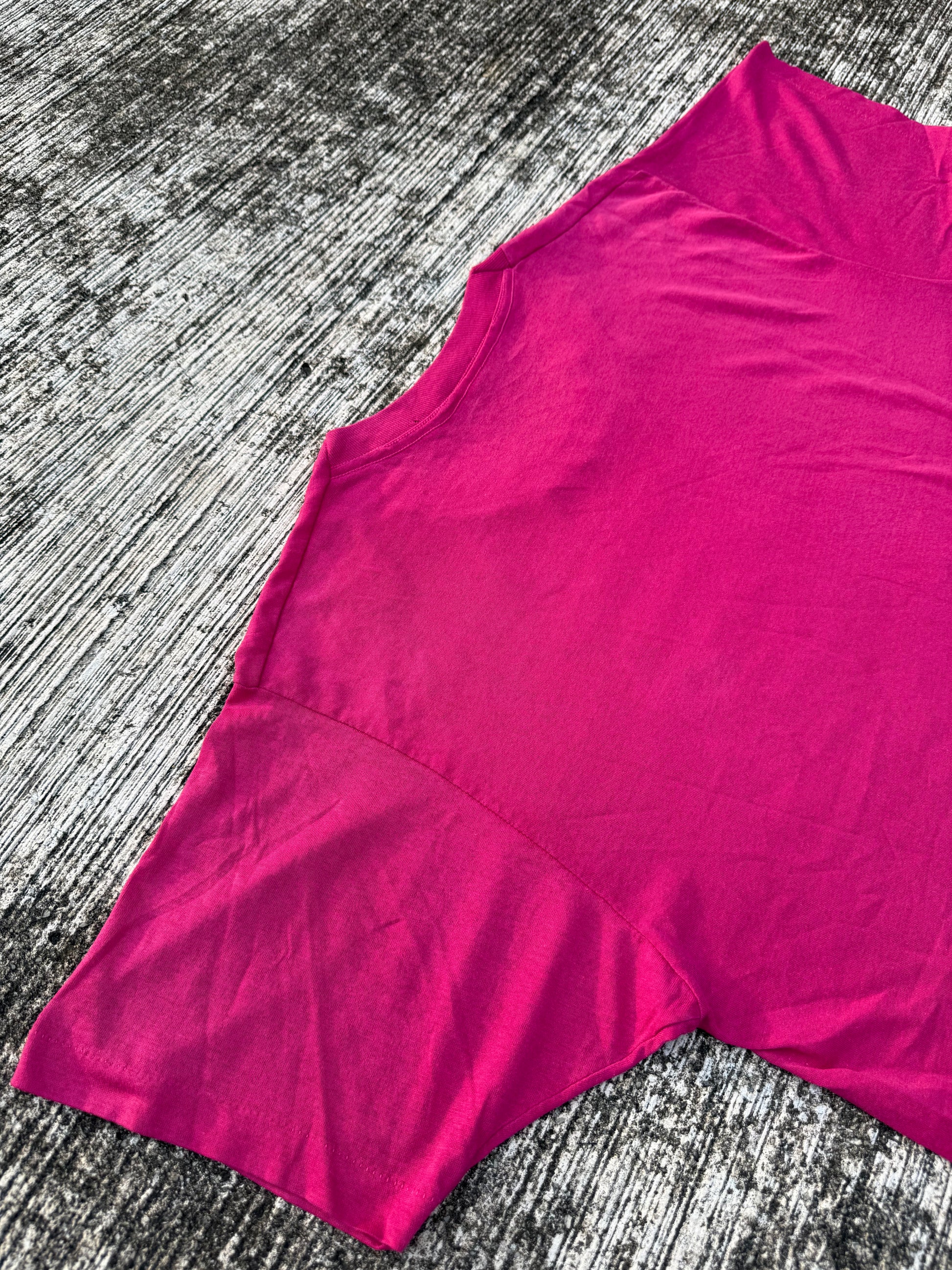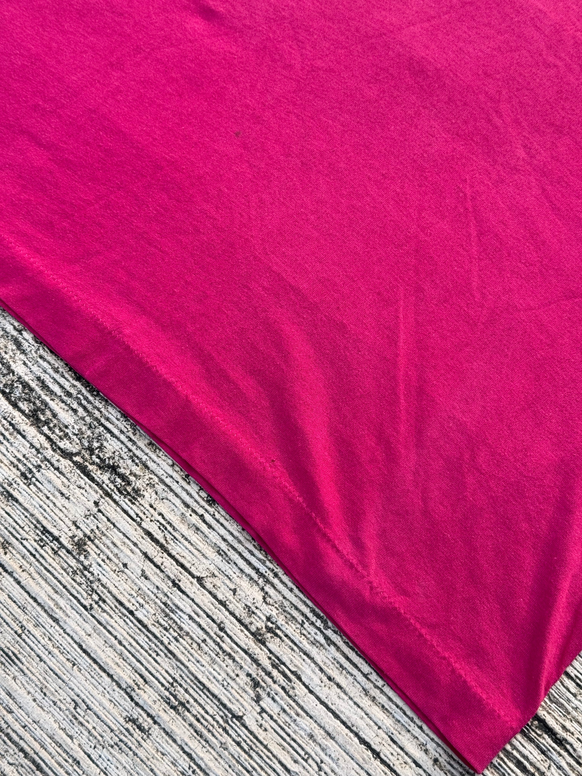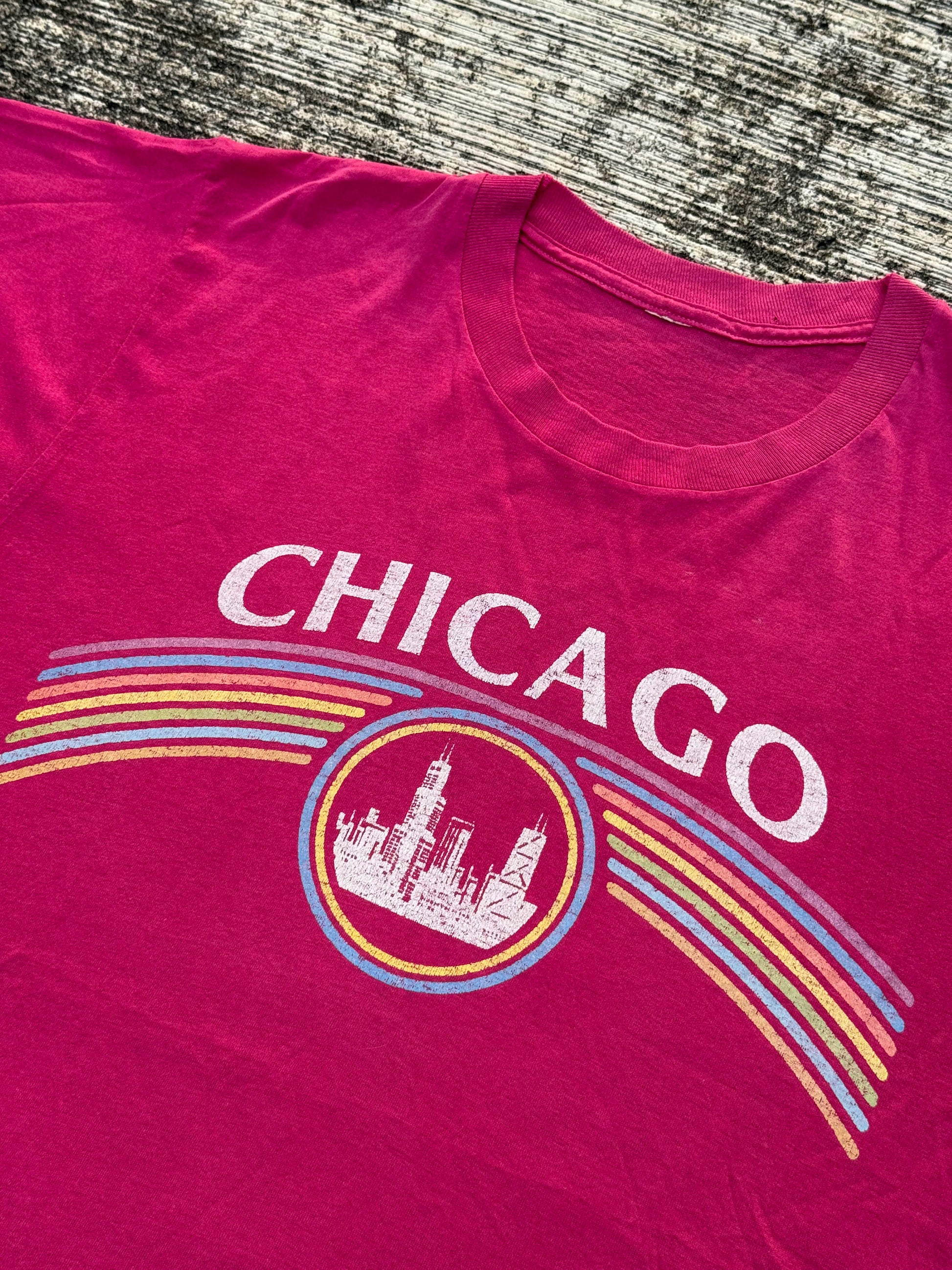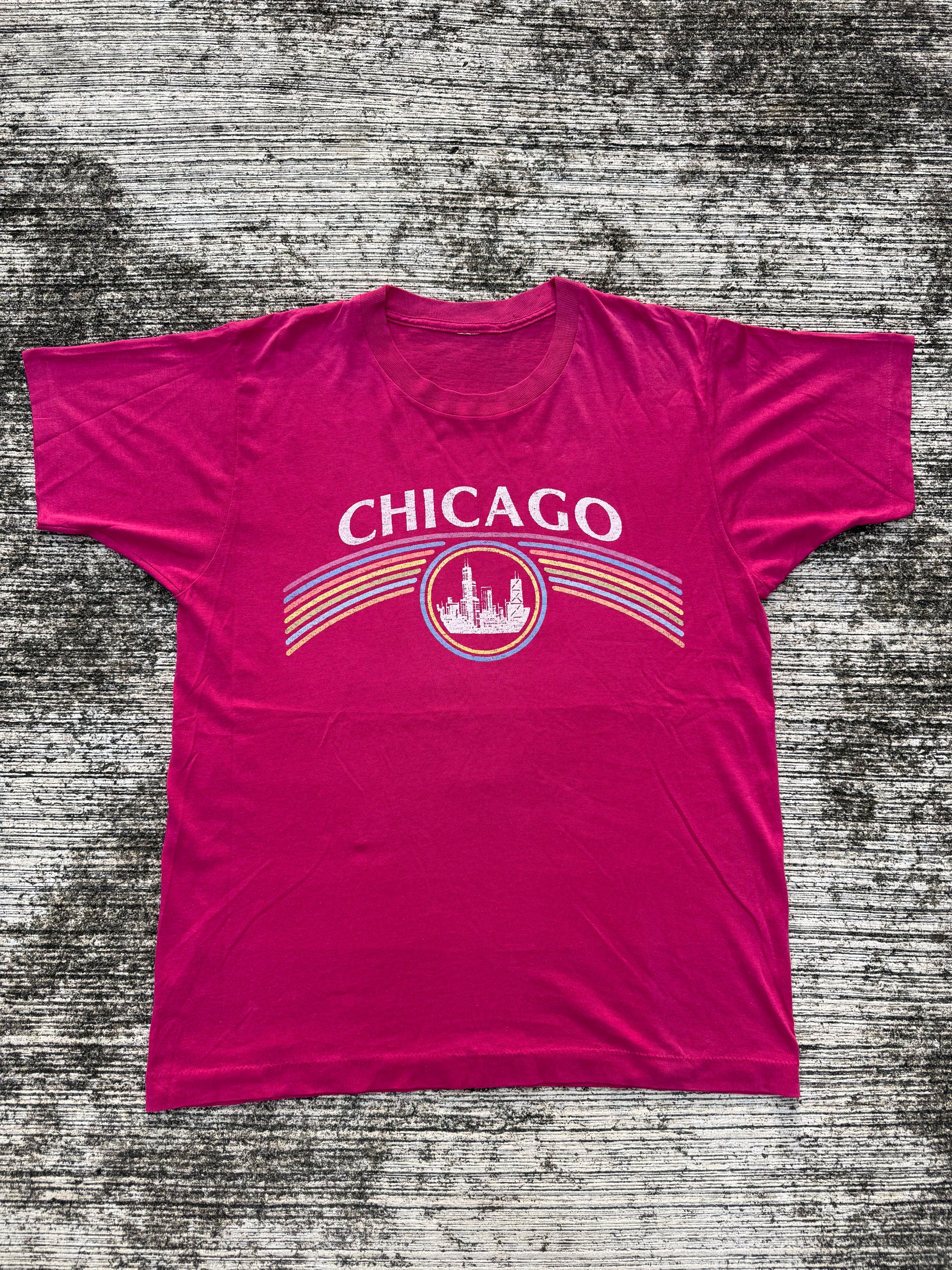 Original 1980s Chicago souvenir tee featuring bold white “CHICAGO” lettering with rainbow stripes and skyline graphic printed across the chest. Comes in a striking magenta/purple poly-cotton blend blank with soft vintage wear. A classic piece of retro Midwest tourist Americana, perfect for collectors of travel tees and city merch.