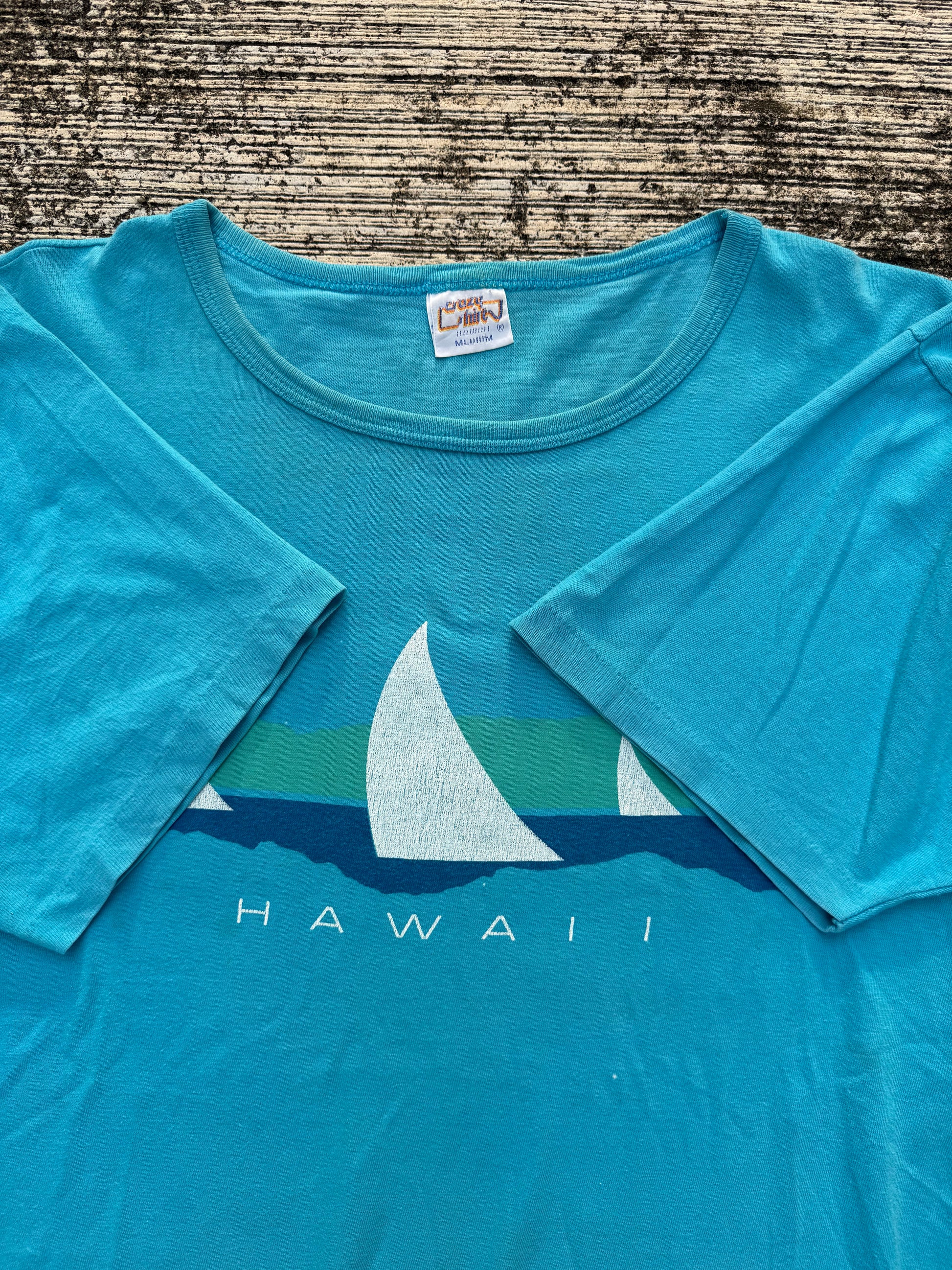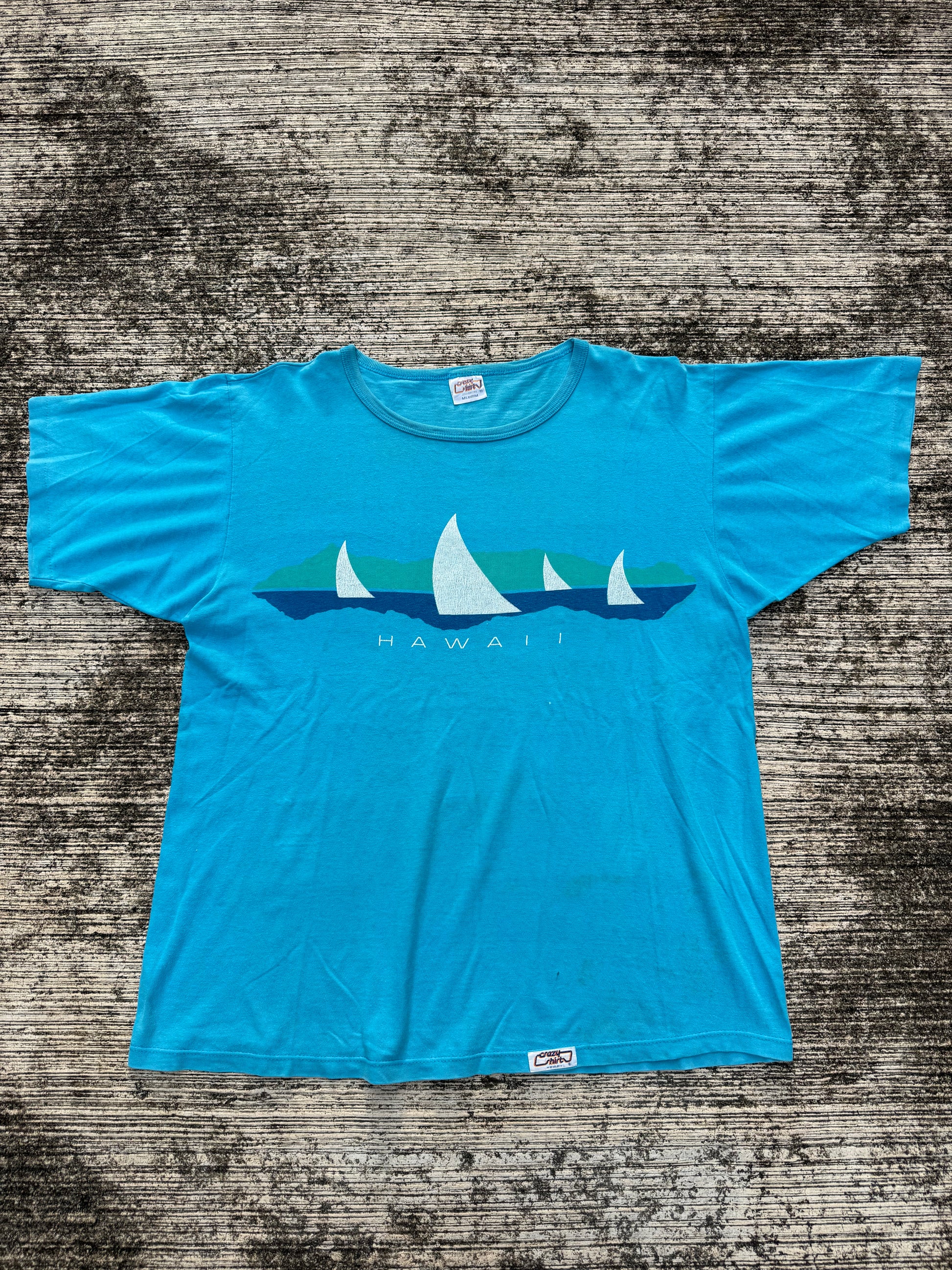 Original 1980s Hawaii souvenir tee featuring a minimalist sailboat regatta graphic across the chest and back, set against a turquoise sea and island horizon. Printed on a Crazy Shirts Hawaii blank, made in USA, soft and lightweight cotton-poly blend with true single stitch construction. A rare vintage Hawaiian tee with classic island resort vibes and timeless graphic appeal.