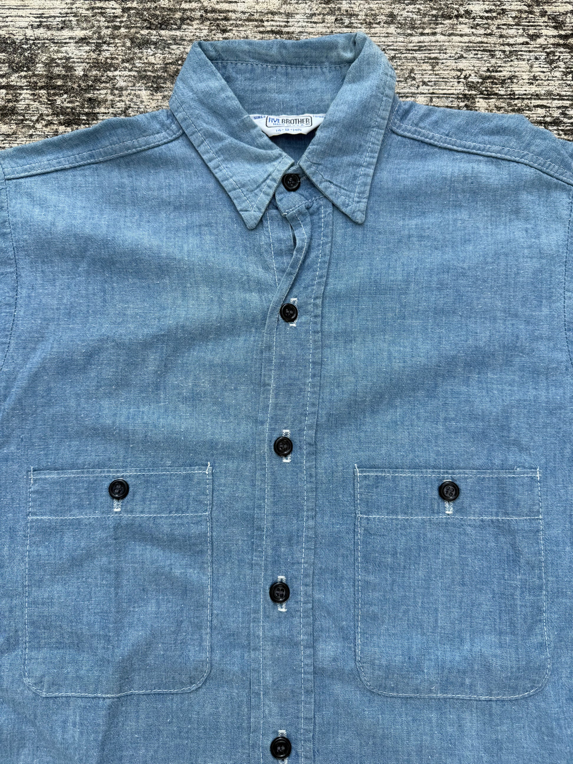 Original Five Brother short sleeve chambray work shirt, Made in USA. Features dual flap chest pockets with black buttons and reinforced stitching. Classic workwear fit with durable cotton chambray fabric. Early 1980s production based on label design.