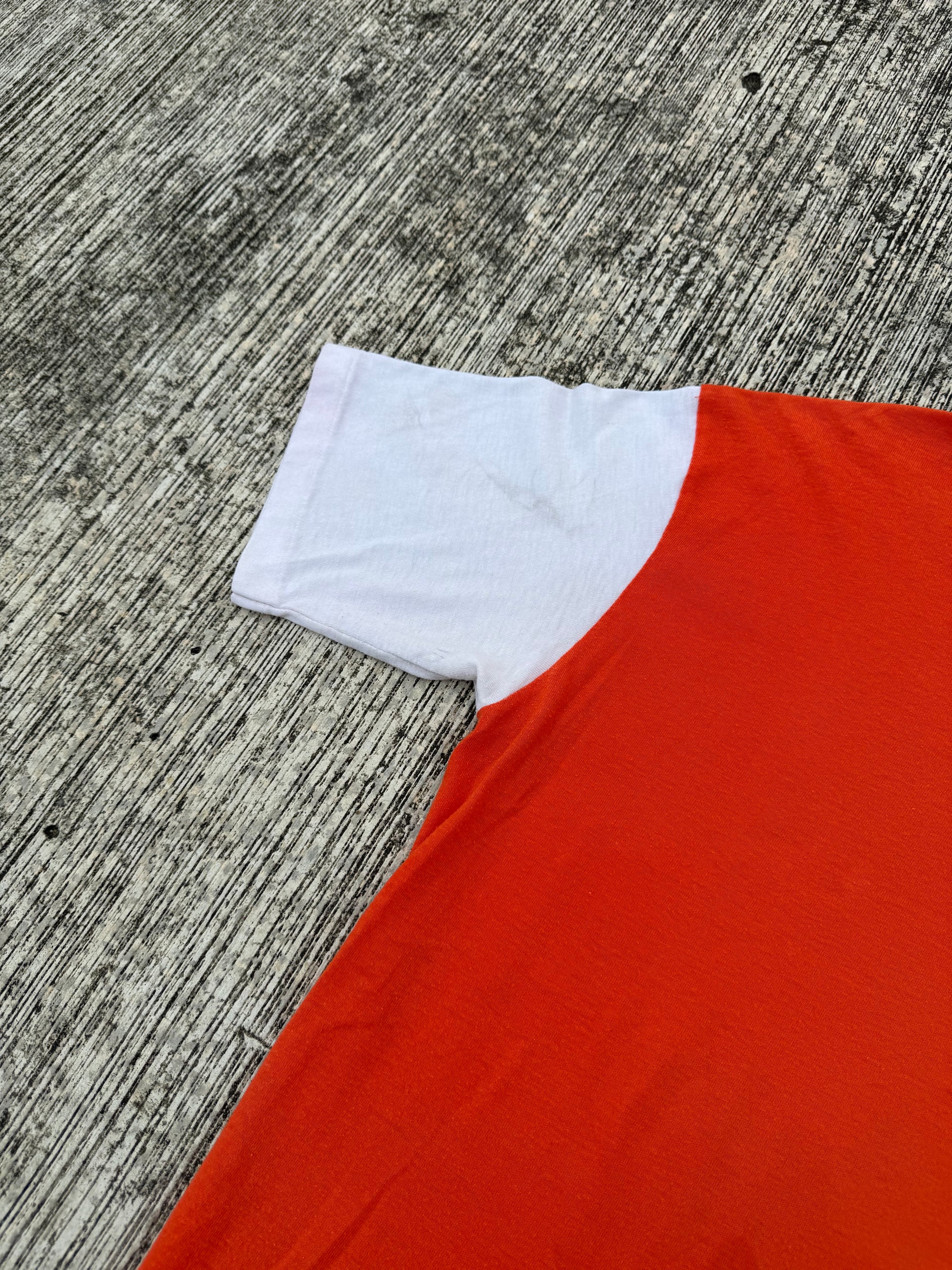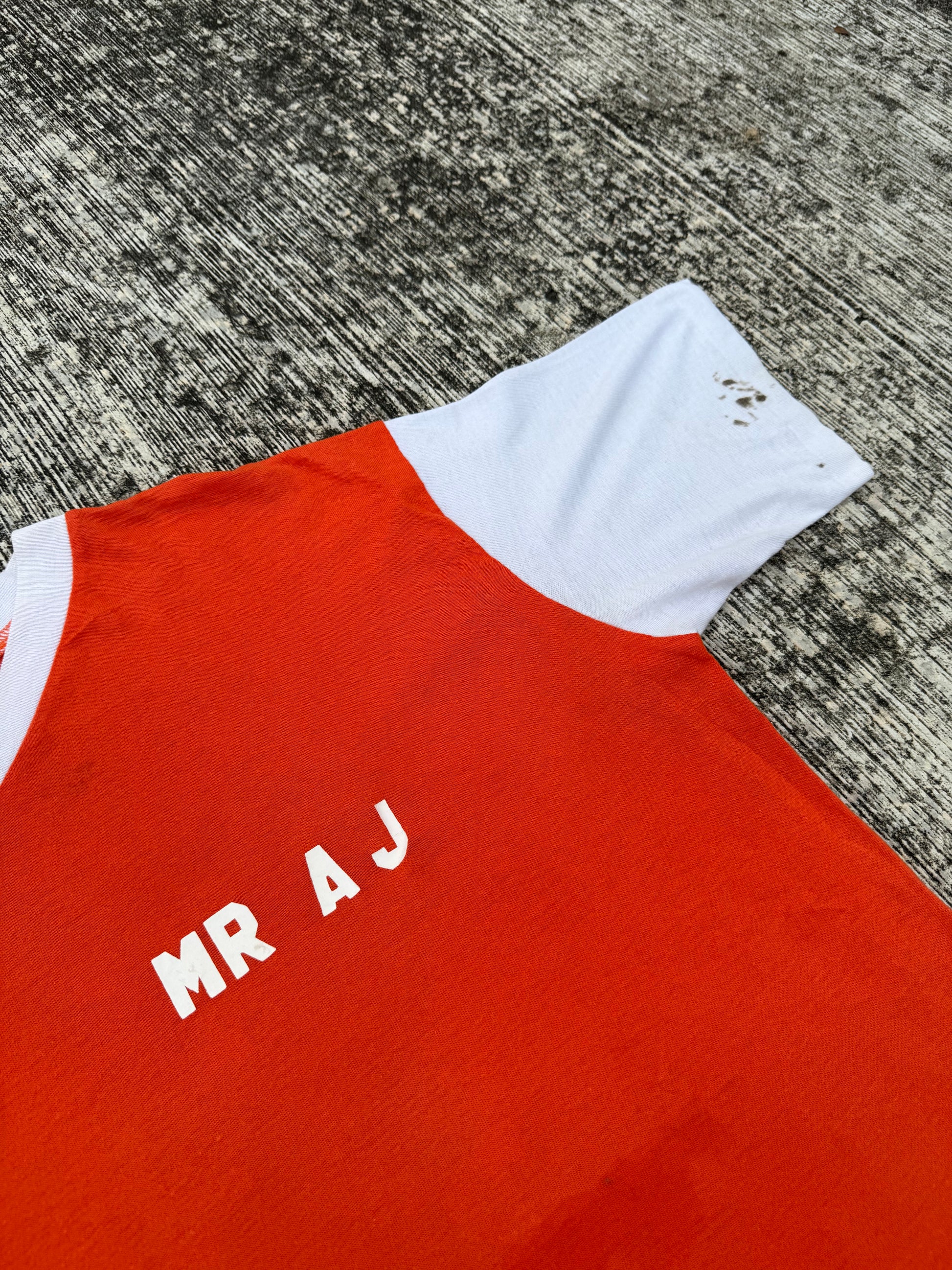 Rare 1980s bowling team t-shirt from Hill Top, Dallas TX. Features classic red body with contrasting white sleeves and v-neck trim. Front has personalized “MR AJ” lettering, while the back sports a bowling pins and triangle motif with bold “HILL TOP – DALLAS, TX.” print. A unique piece of American sports/league history with true vintage character.
