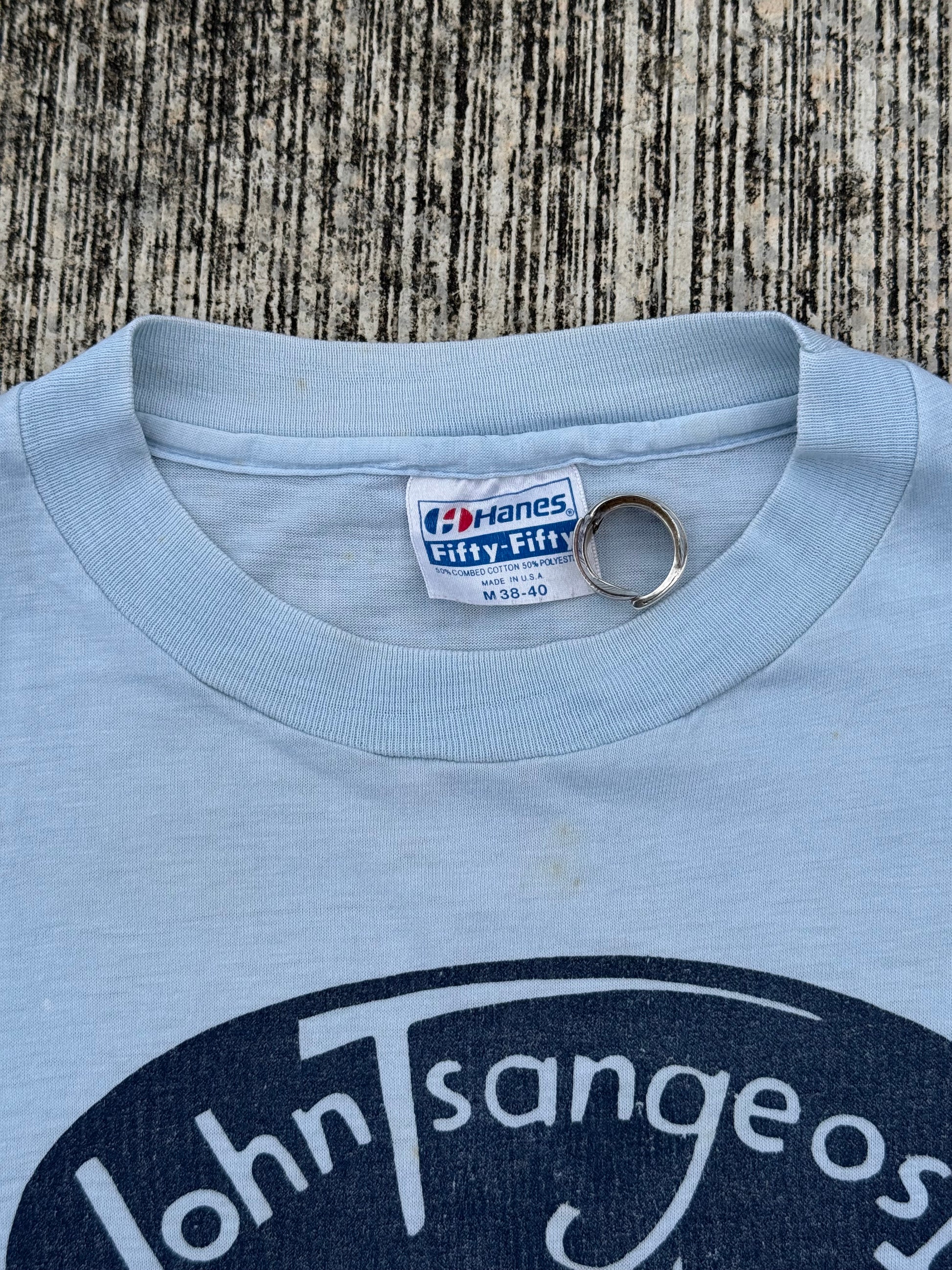 Vintage 1980s promotional tee for John Tsangeos II Jeweler, featuring a bold diamond graphic and hand-lettered typography. Printed on a soft Hanes Fifty-Fifty tag (50/50 cotton-poly blend), made in USA. Classic light blue single-stitch tee with local jeweler advertising charm. Collectible piece of small-town Americana advertising.