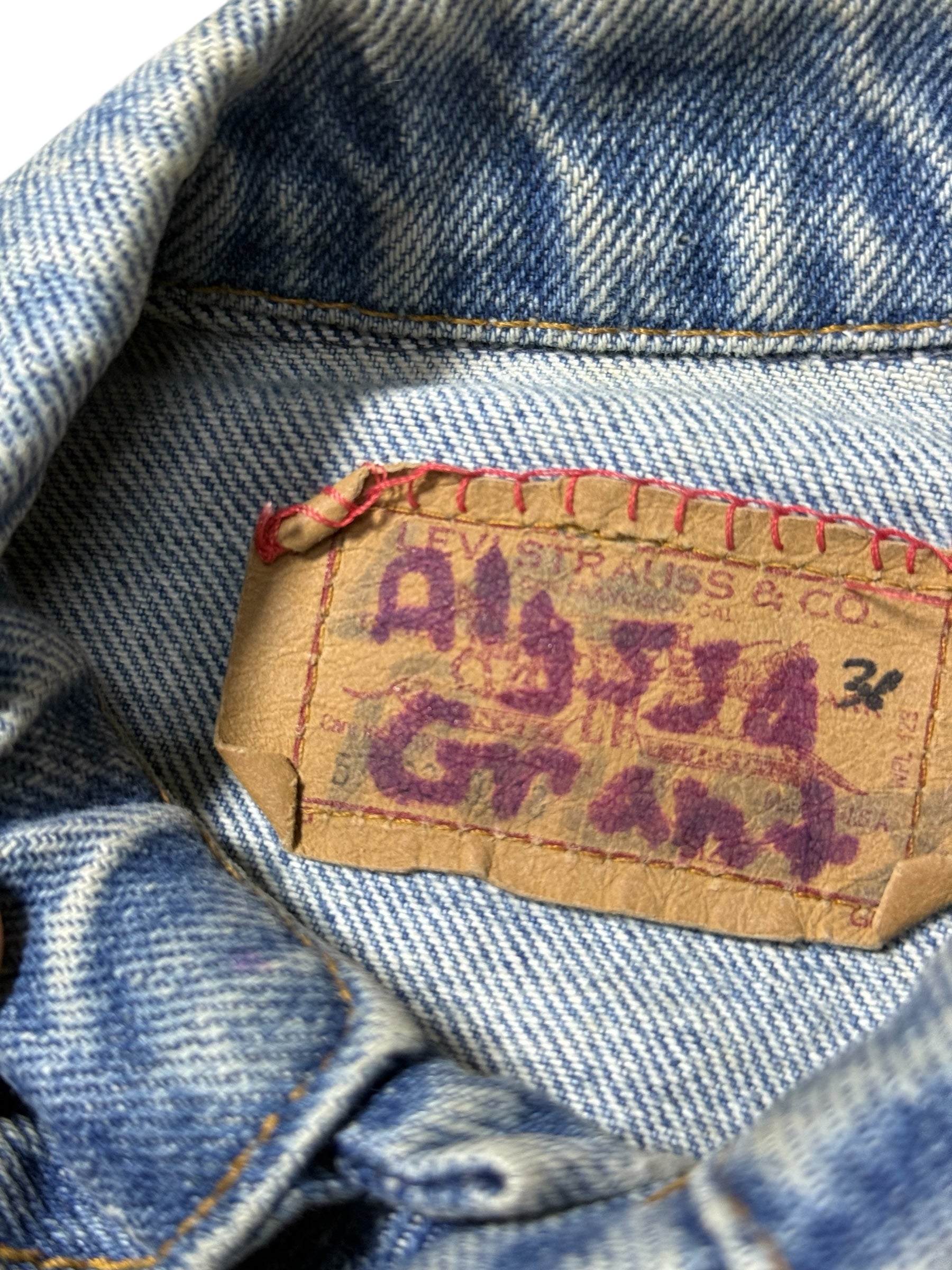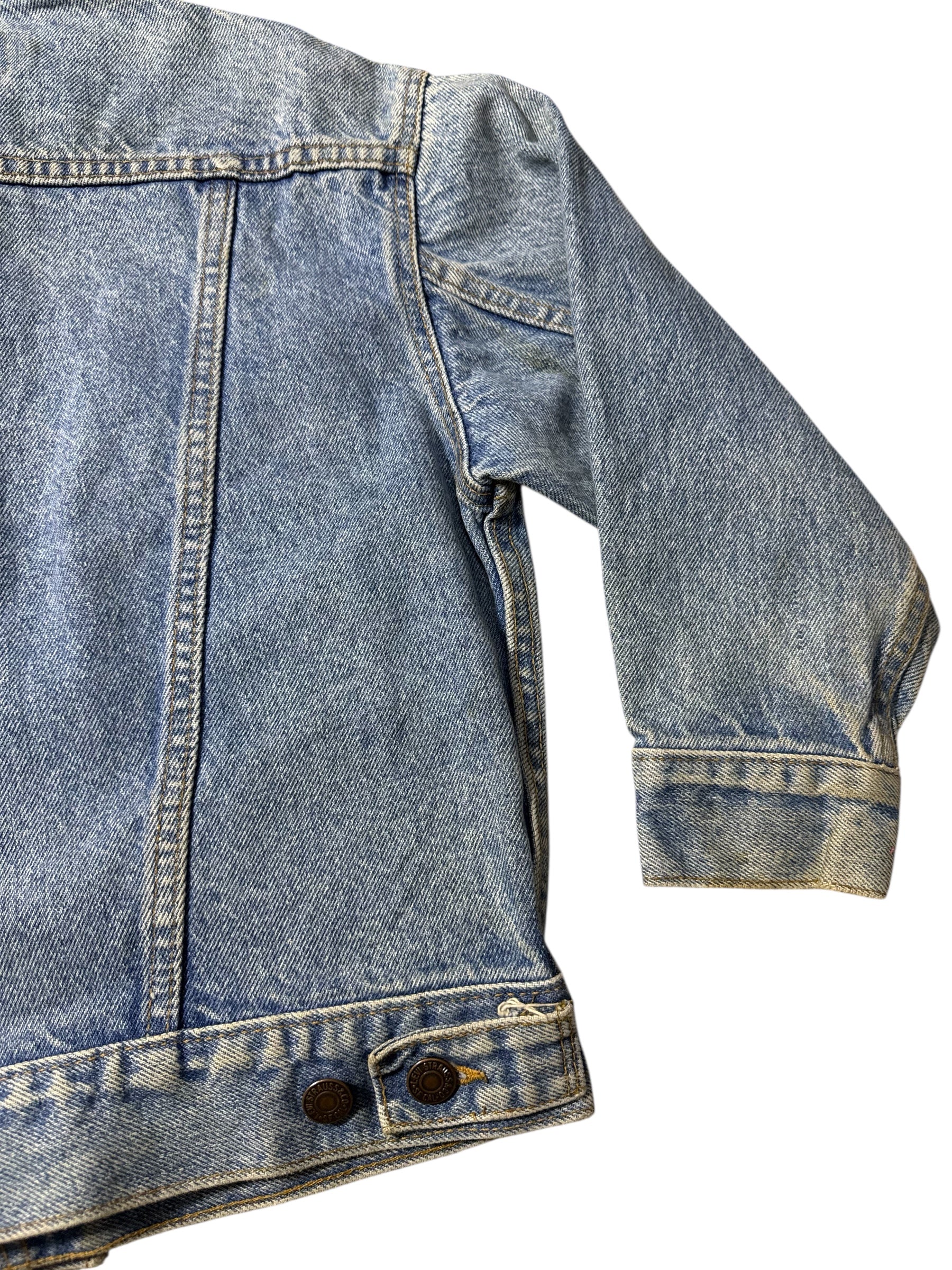 Original vintage Levi’s kids denim trucker jacket featuring classic Type III styling, authentic Levi’s hardware, and durable 100% cotton denim construction. Made in USA with period-correct care label and paper patch, showing natural vintage fade from age and wear.