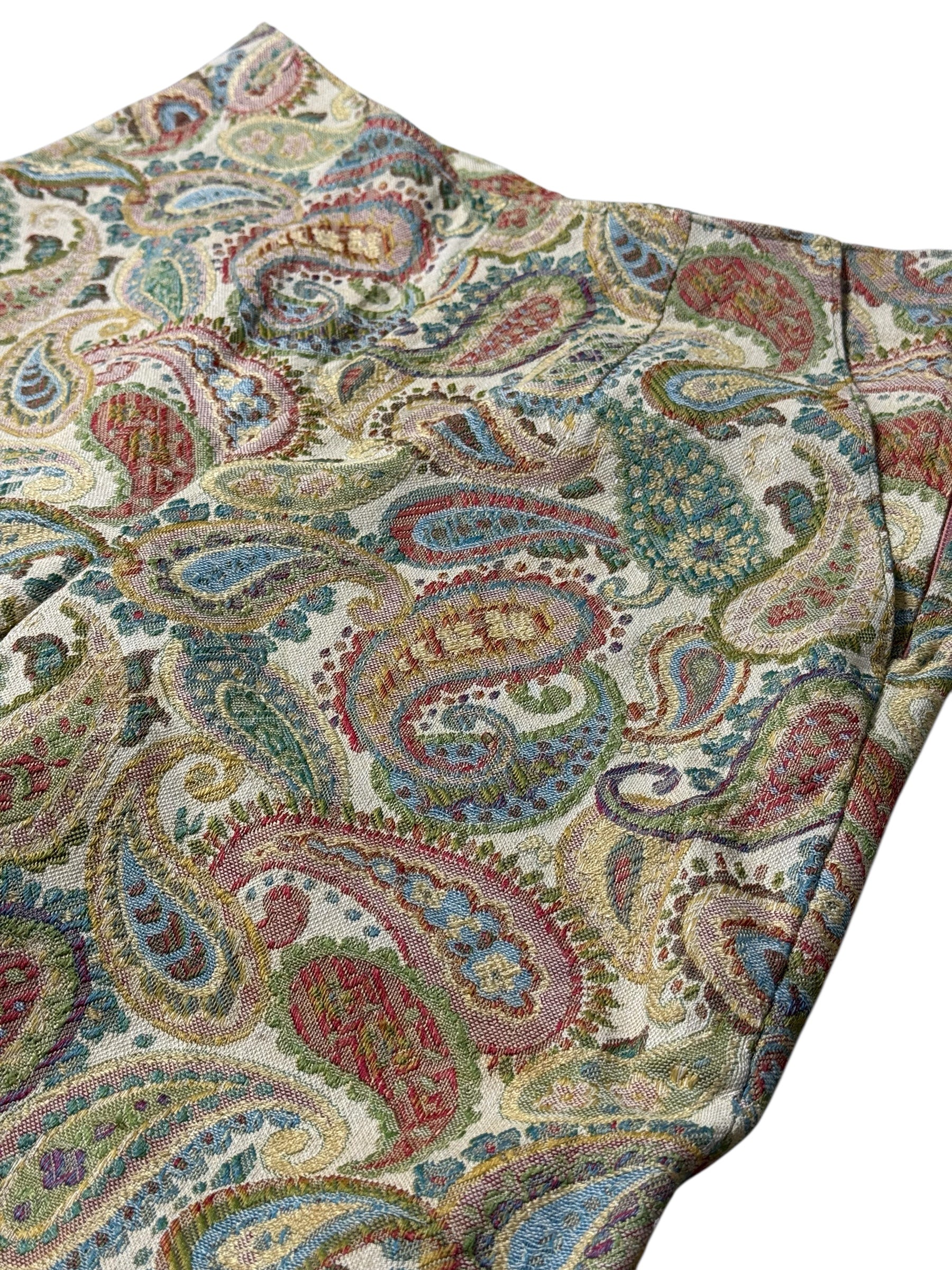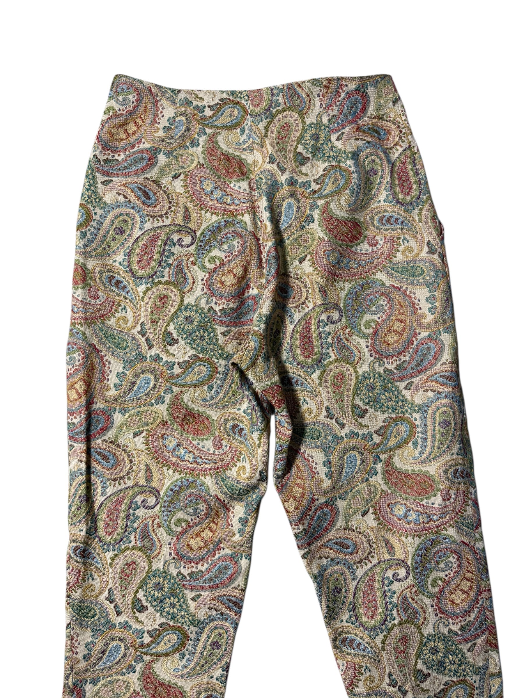 Vintage paisley-pattern trousers by MAG DELEINE Paris featuring all-over woven tapestry fabric with side zipper closure. Slim straight-leg cut with elegant vintage silhouette. Suitable for classic vintage, Parisian style, and statement outfits.