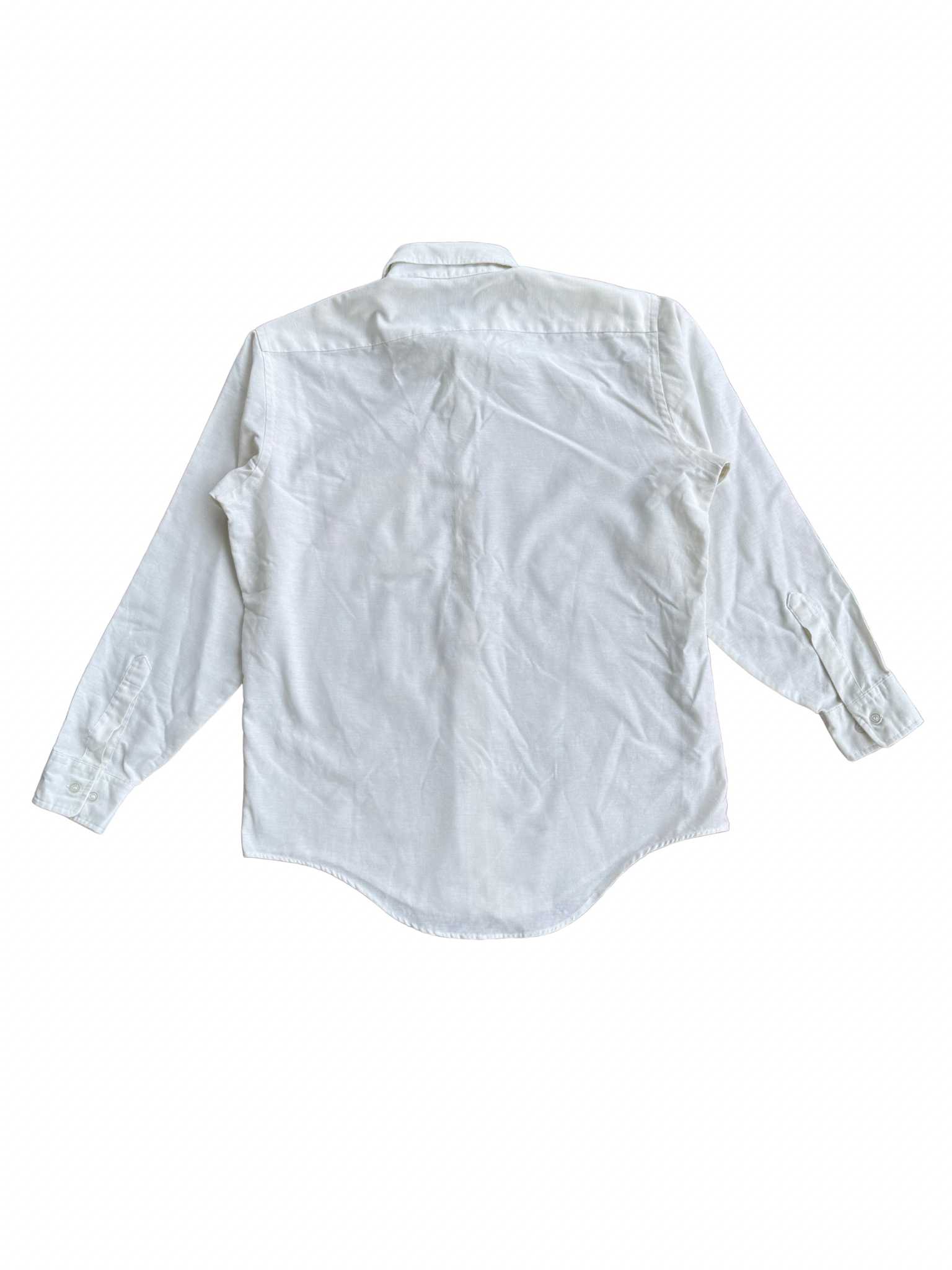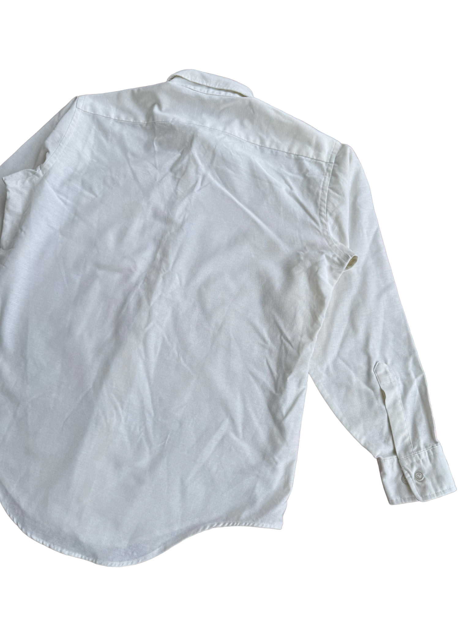 Vintage Manhattan oxford cloth button-down shirt made in U.S.A., dating from the late 1970s to early 1980s. Classic single-pocket design with soft roll collar, full front button closure, and back box pleat. Constructed from 50/50 cotton–poly blend for easy care with a subtle textured weave, lightweight yet durable, ideal for layering or daily wear.