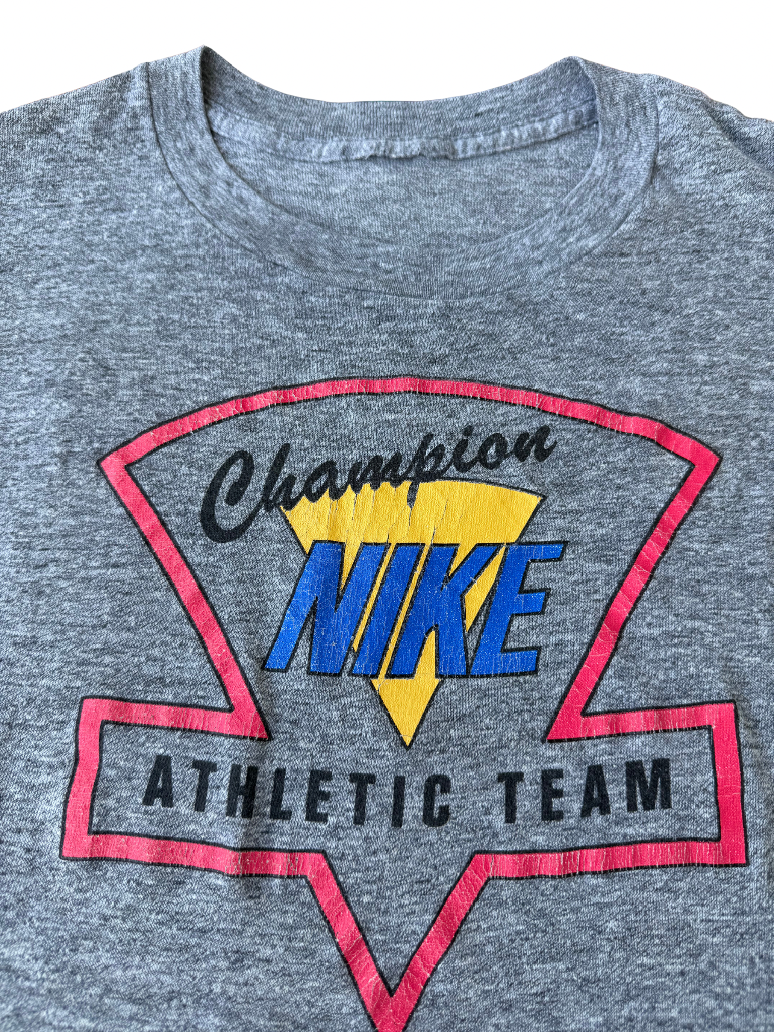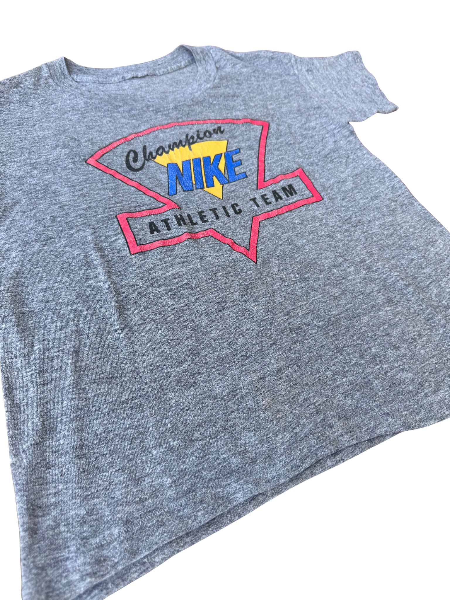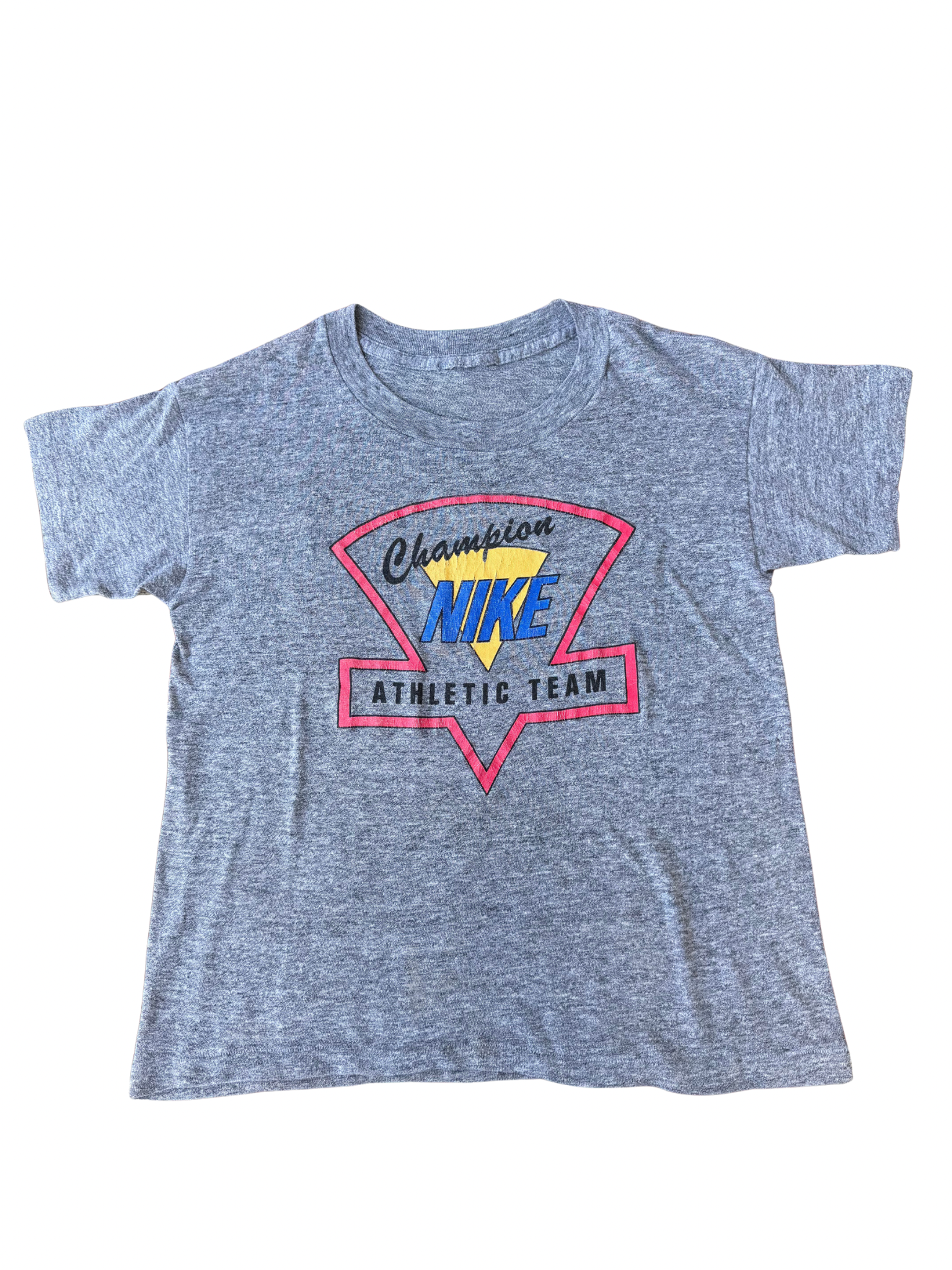 Original 1980s Nike “Champion Athletic Team” kids tee featuring bold retro triangle graphic in yellow, blue, and red. Made from a super soft tri-blend fabric (likely cotton-rayon-poly mix) lightweight, drapey, and breathable with signature vintage feel.
