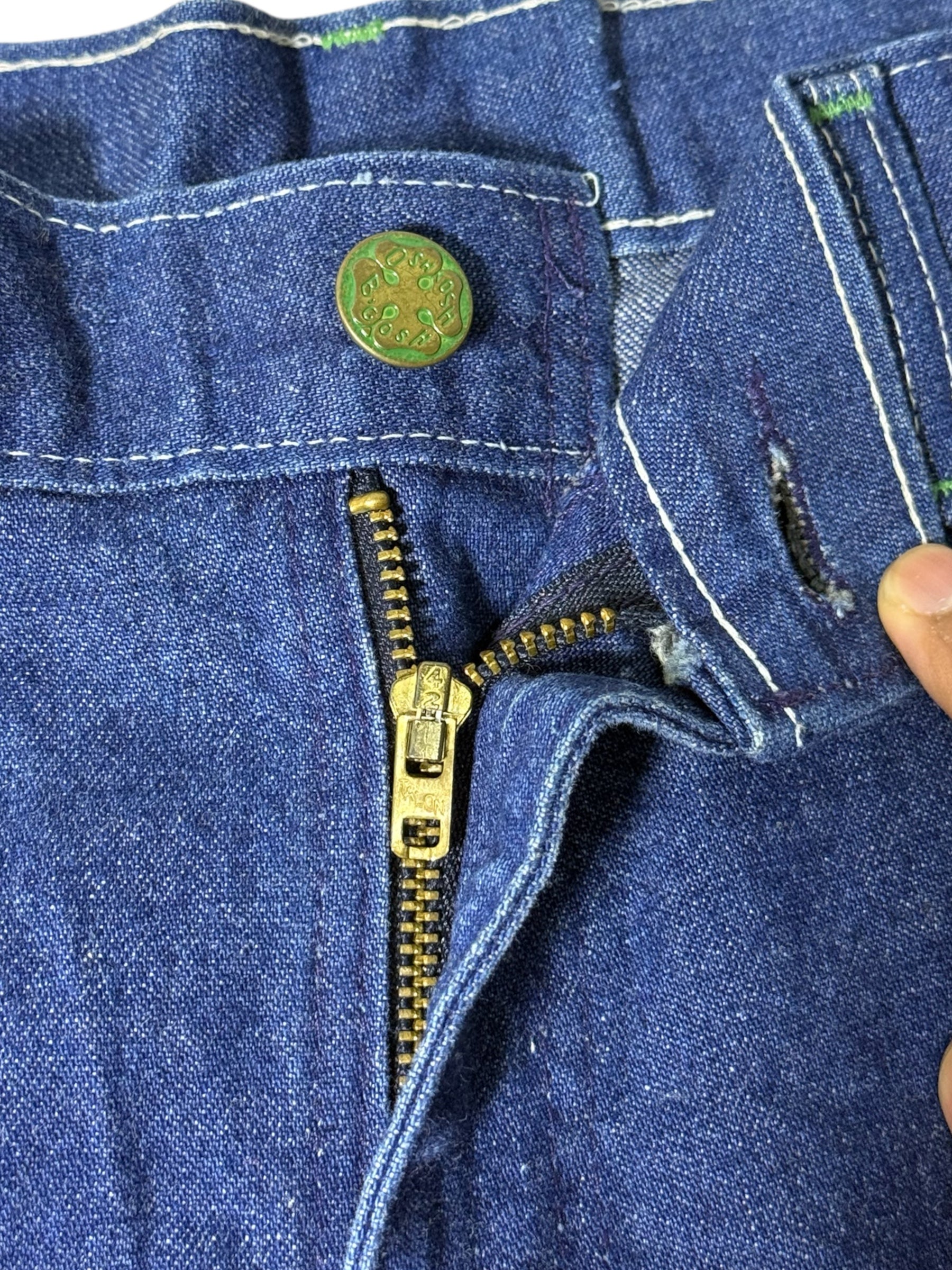 A classic pair of vintage OshKosh B’Gosh carpenter denim pants from the late 1980s to 1990s, made from sturdy 100% cotton denim with the iconic triple-stitch workwear construction. Features deep front pockets, hammer loop, reinforced back pockets, and that signature OshKosh yellow-blue patch.