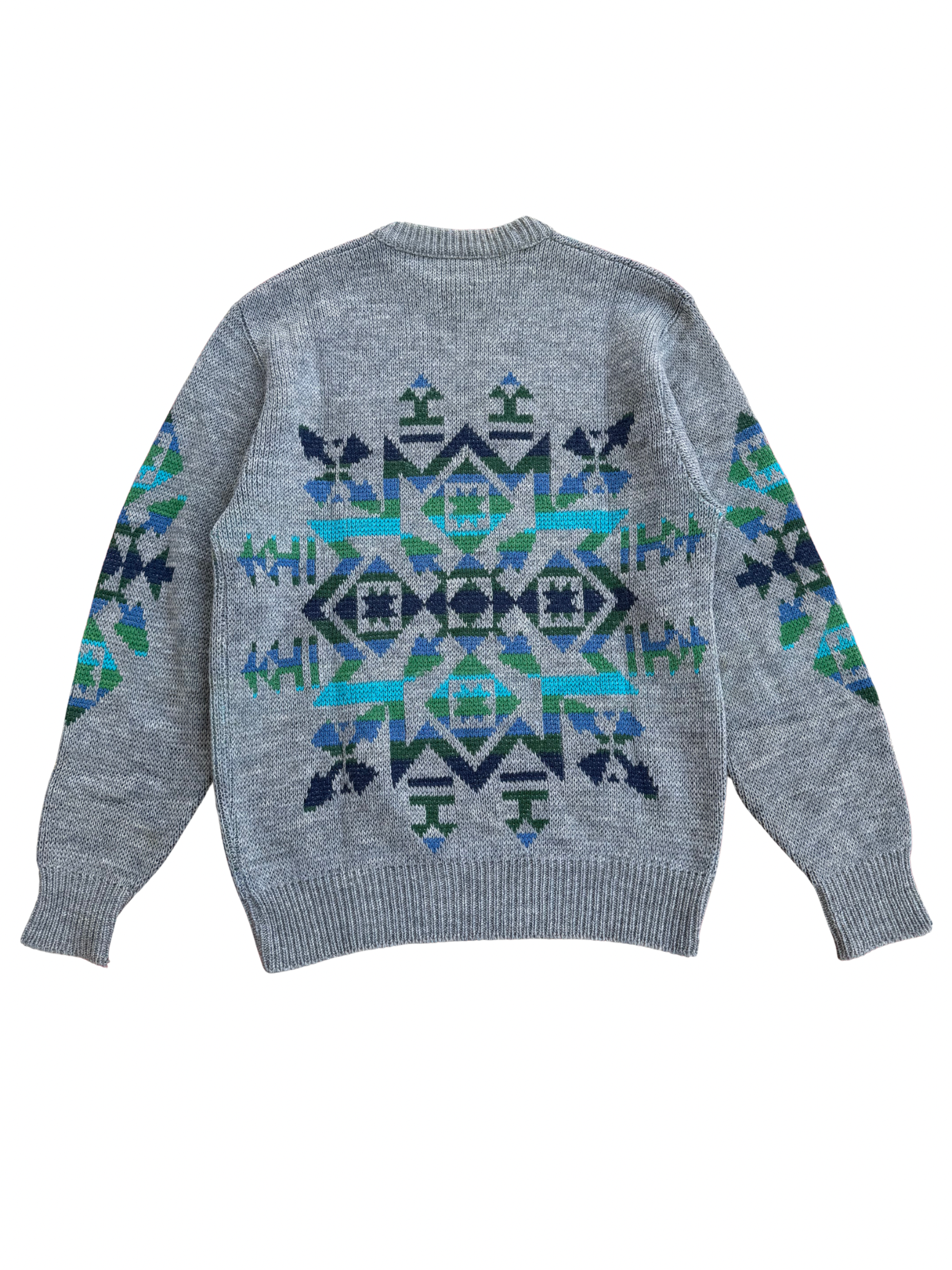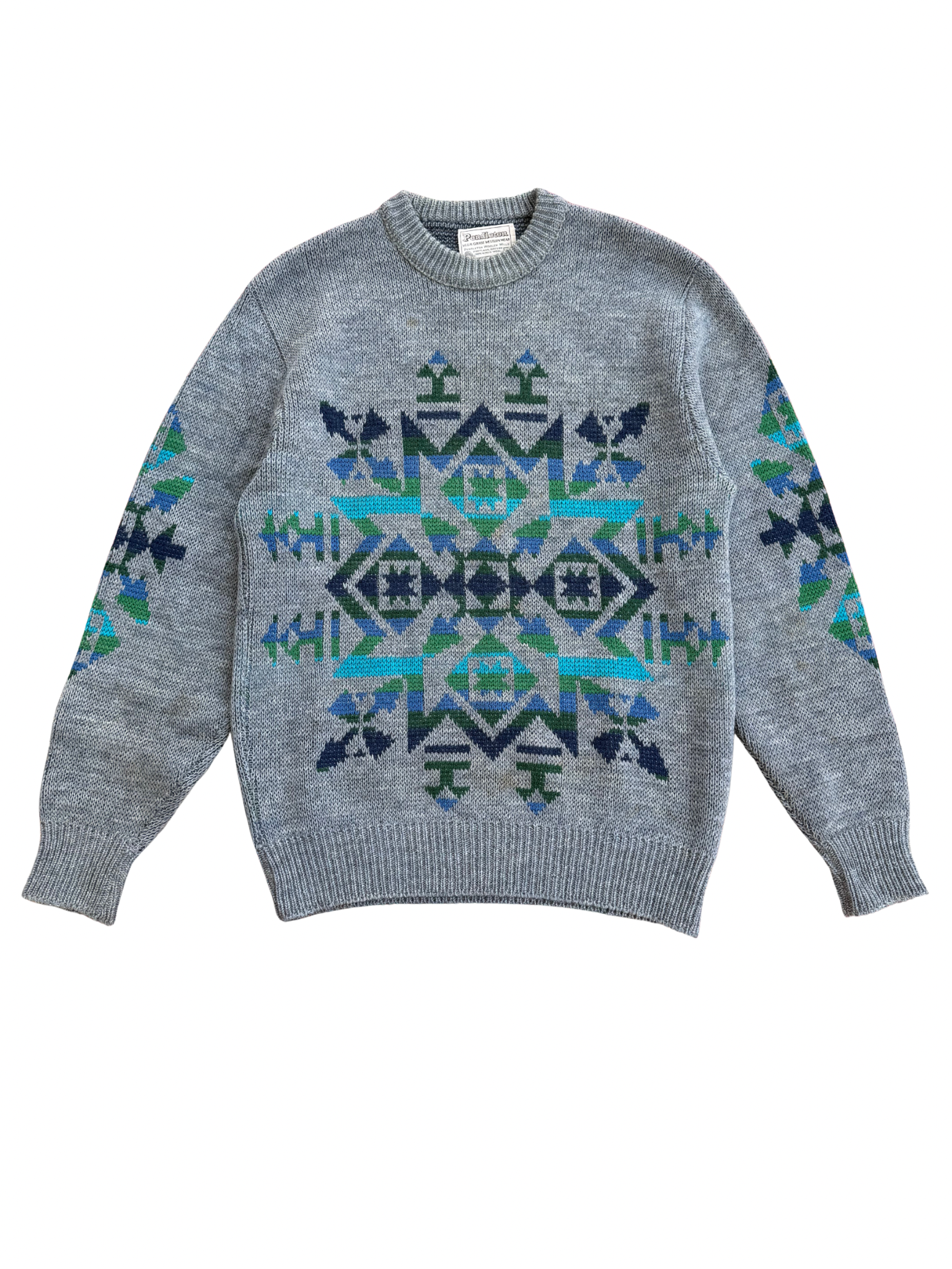 Original Pendleton “High Grade Western Wear” sweater, made in Portland, Oregon, USA. Constructed from 100% virgin wool with signature Navajo-inspired geometric motif in shades of teal, navy, and green on a heather grey base. Classic 1980s Pendleton knit featuring symmetrical pattern front and back with matching sleeve detail, a staple of American heritage outdoor style.